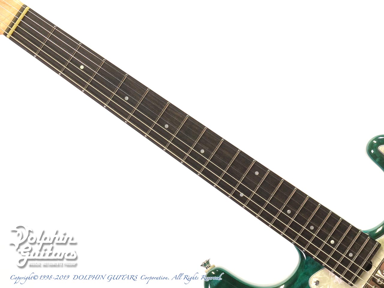 ボディー・トップはタヒチ北西に位置するボラボラ島のエメラルドカラーをイメージした"Bora Bora Blue"フィニッシュ。拘りのフィニッシュには、敢えてクローム系のパーツ、ピックアップもカバード・タイプにしました。