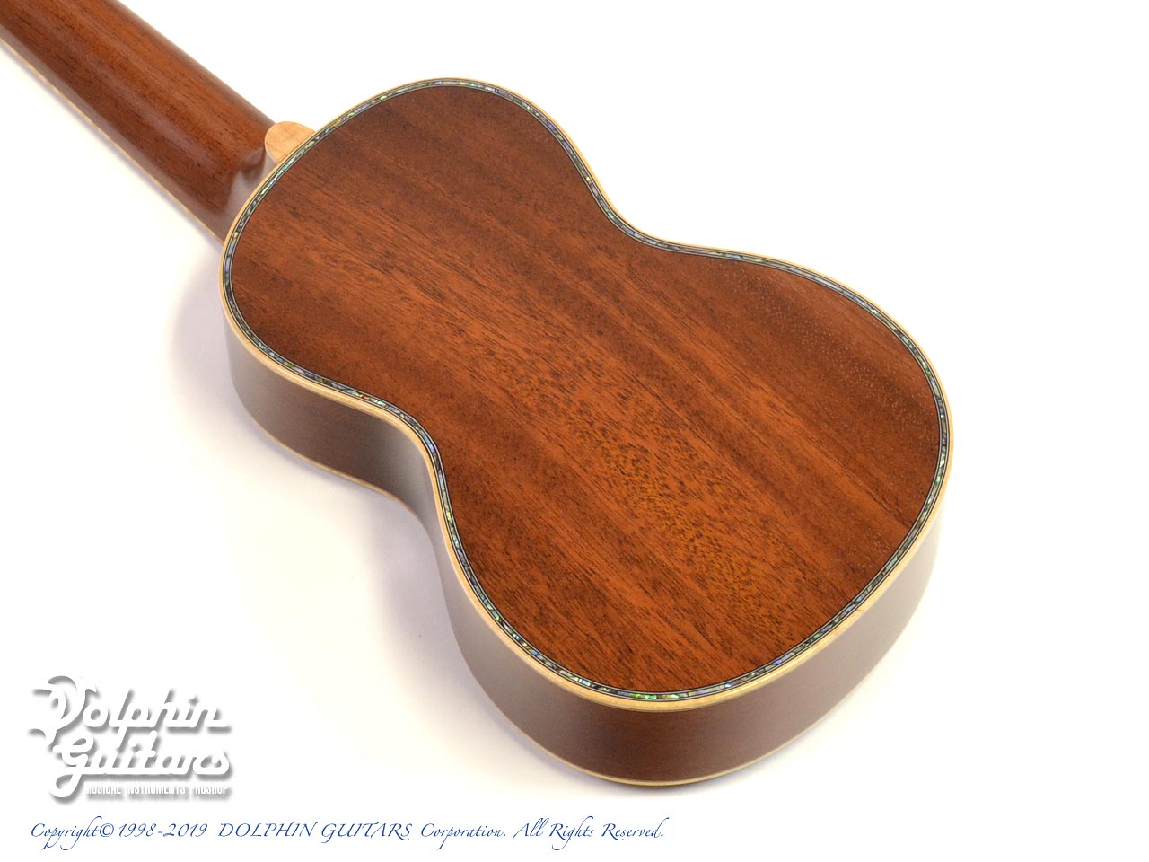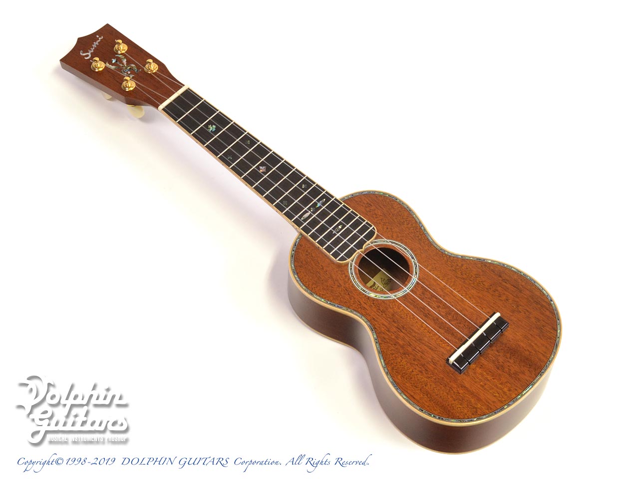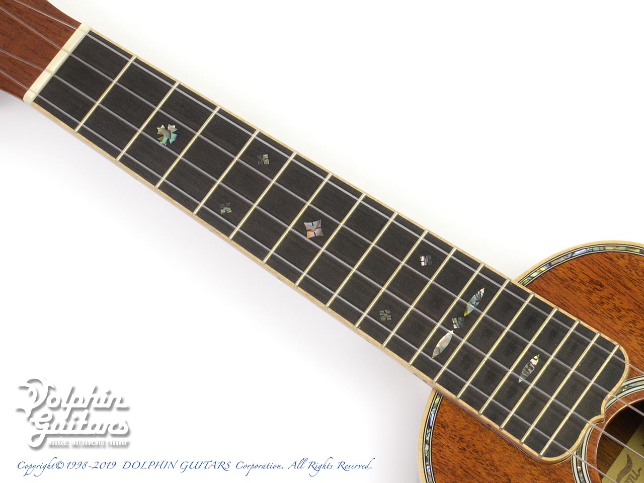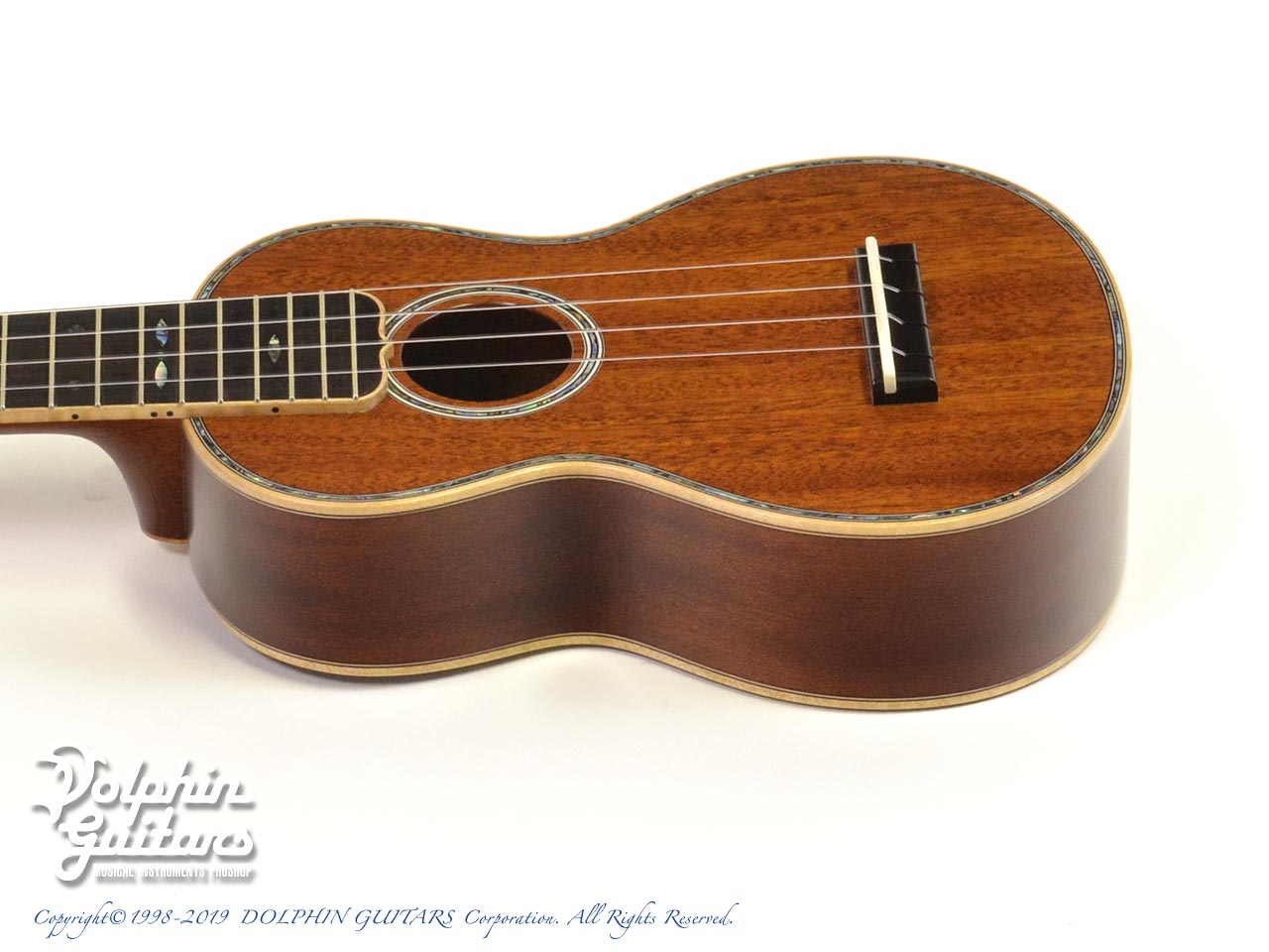 ヘッドのインレイ、ロゼッタ、ボディトリム、ポジションマークなど、ギターで言う所の45スタイルのような豪華さと、渋い色合いのマホガニーとのコントラストがとても美しいウクレレです。