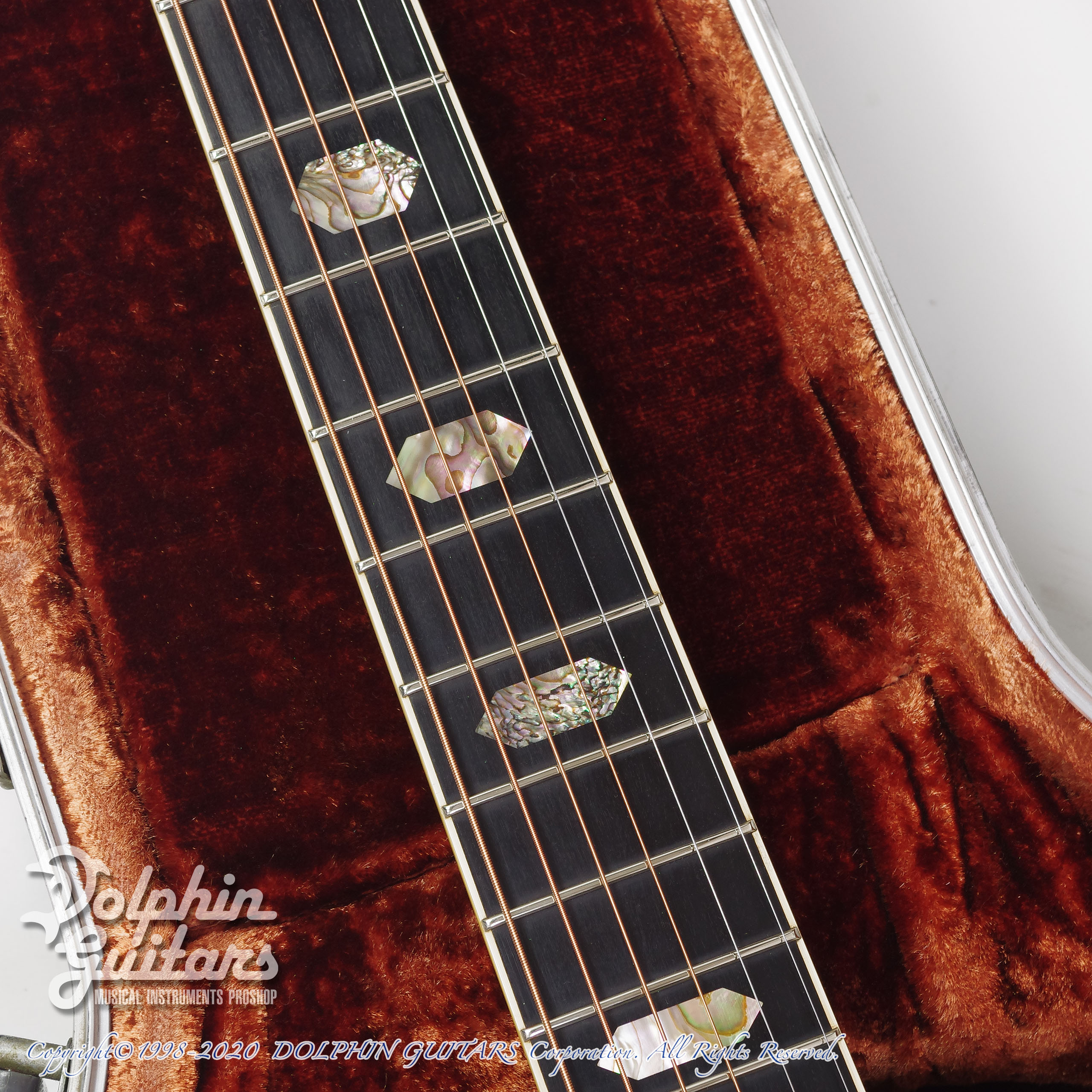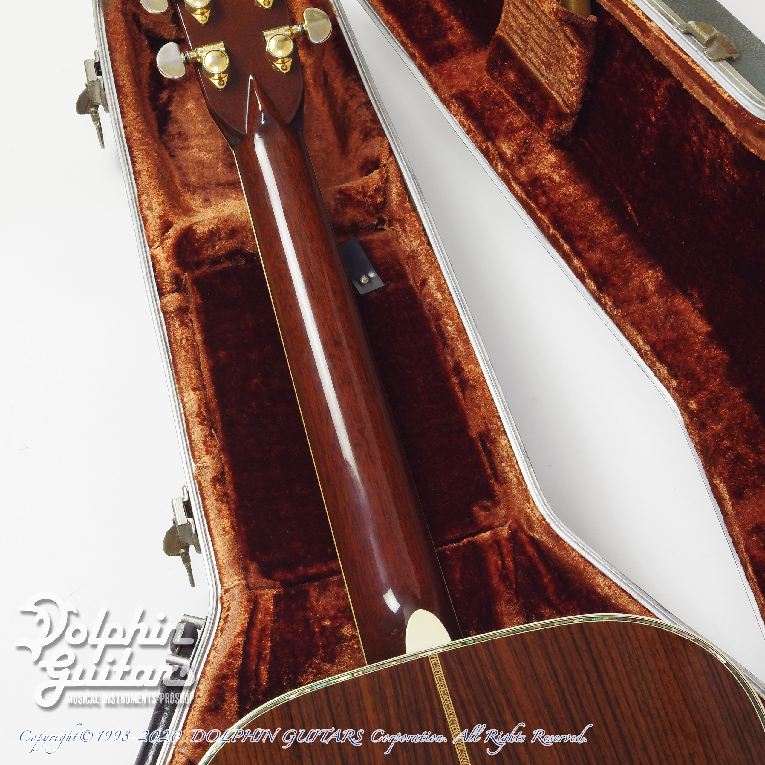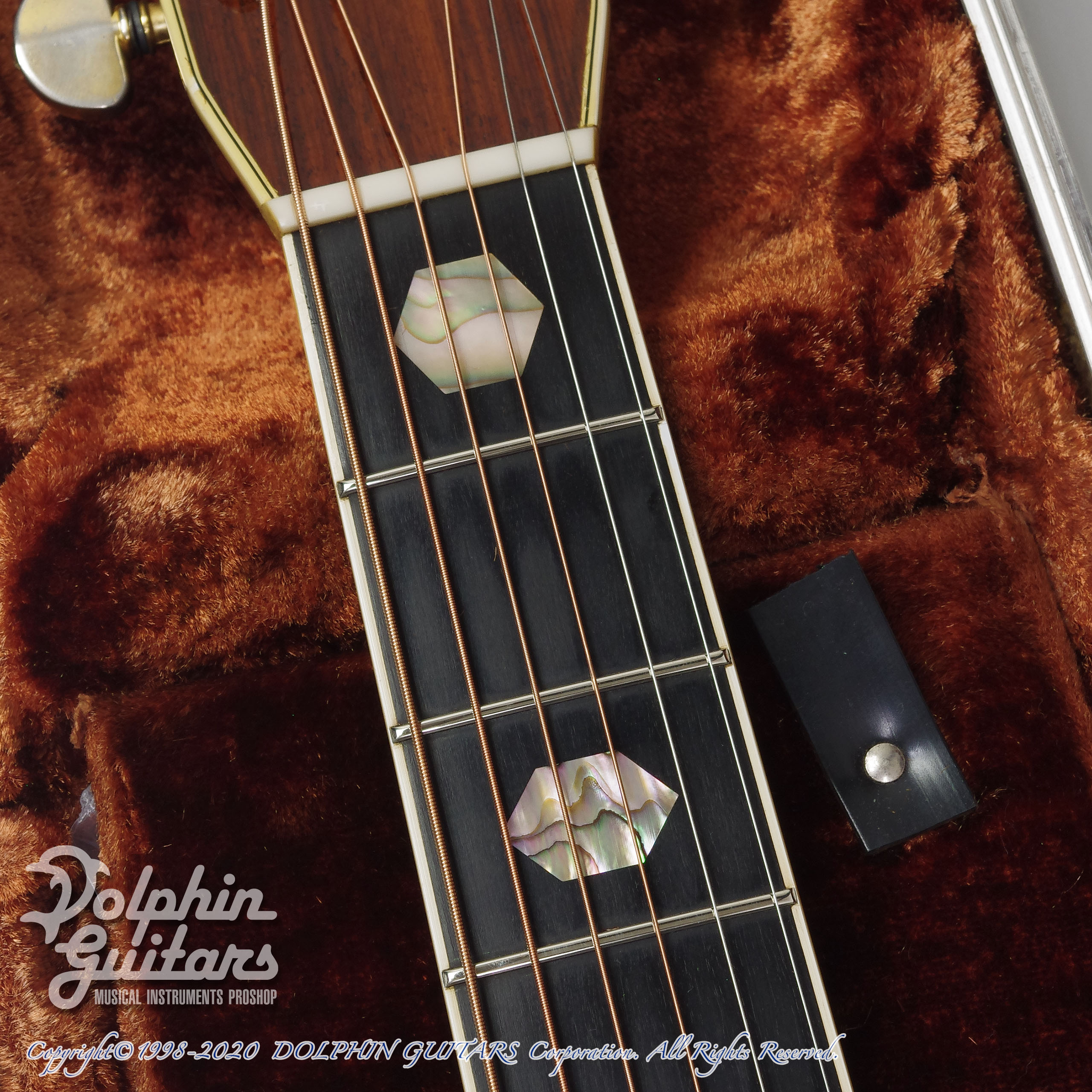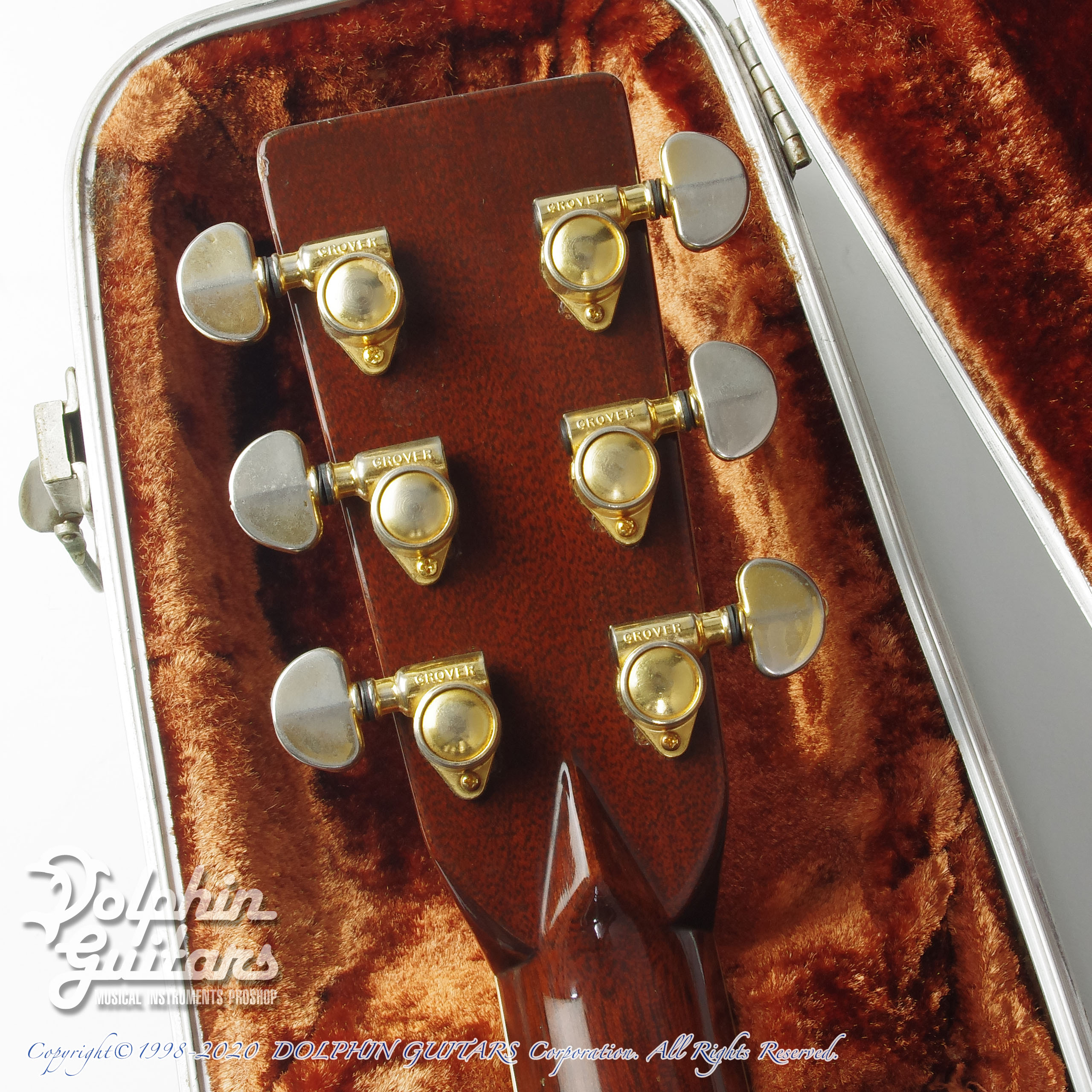 ギターの状態としましては、シャーラーペグからグローヴァーペグへ交換、べっ甲柄PGからブラックPGへ交換されており、ケースはブルーケースが付属ということもあり70sのD-45を意識してのモディファイと思われます。
