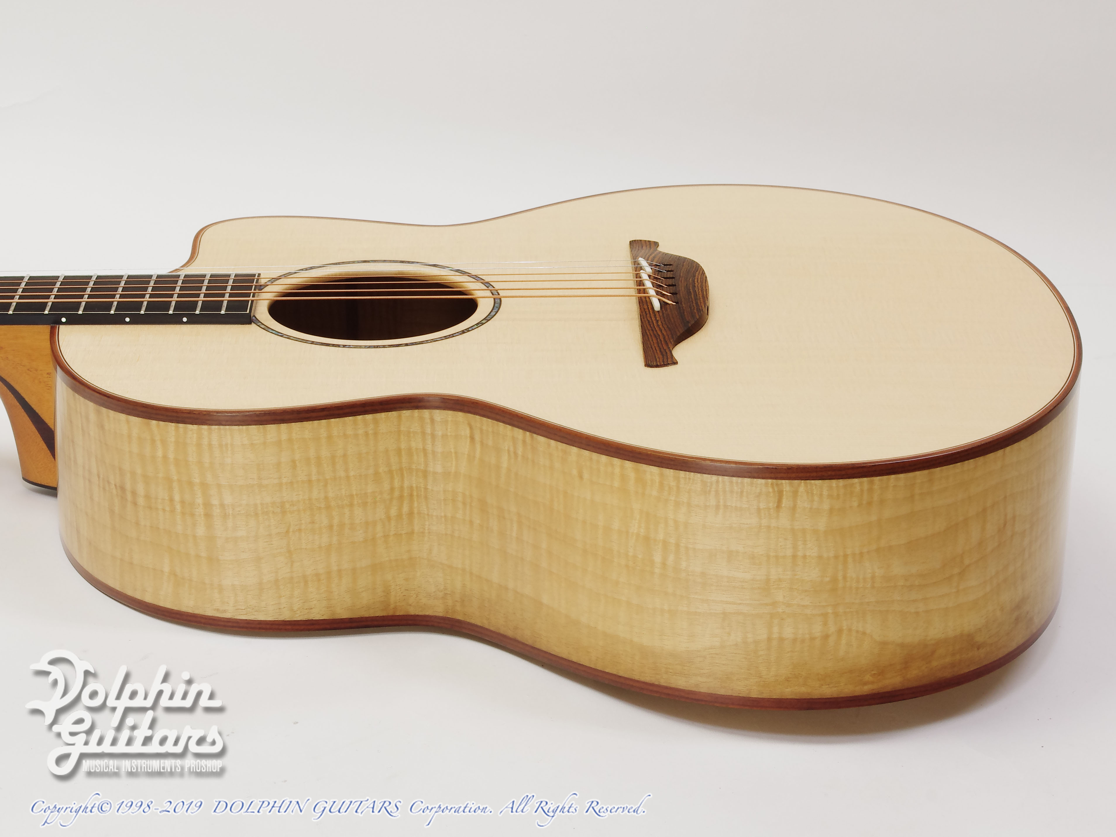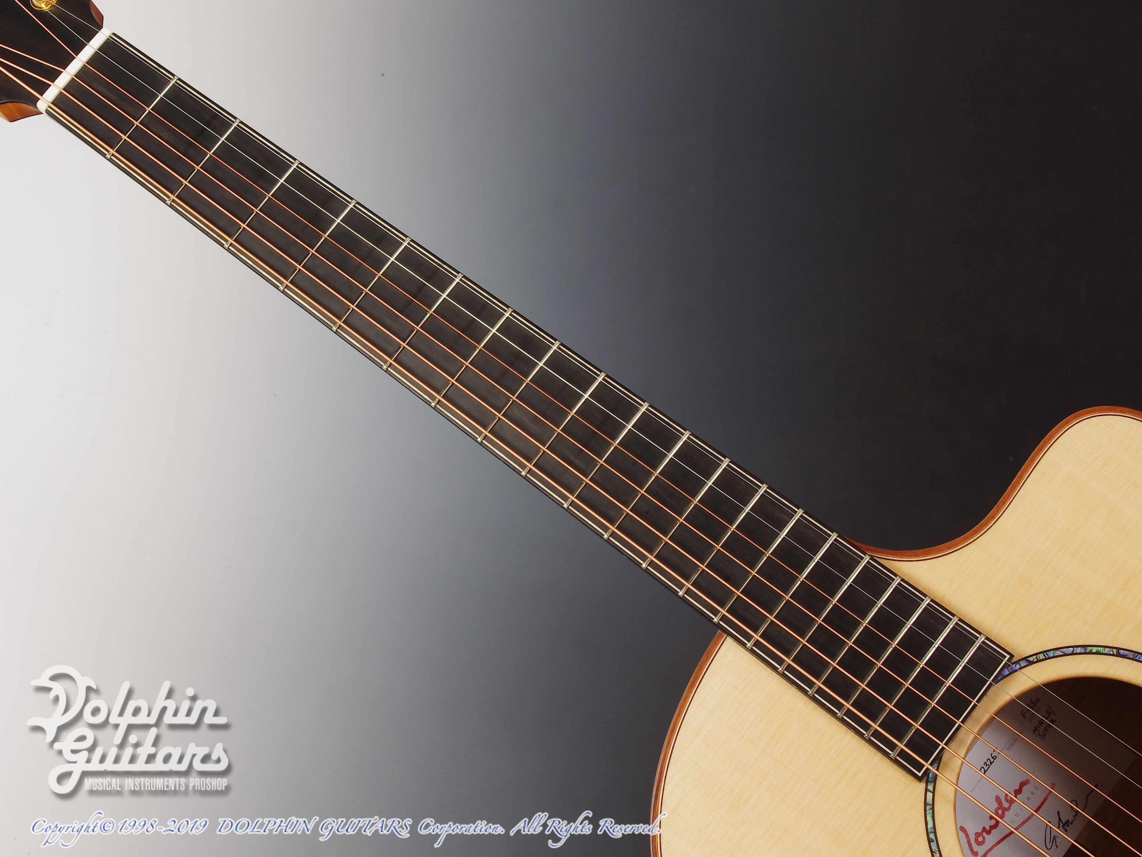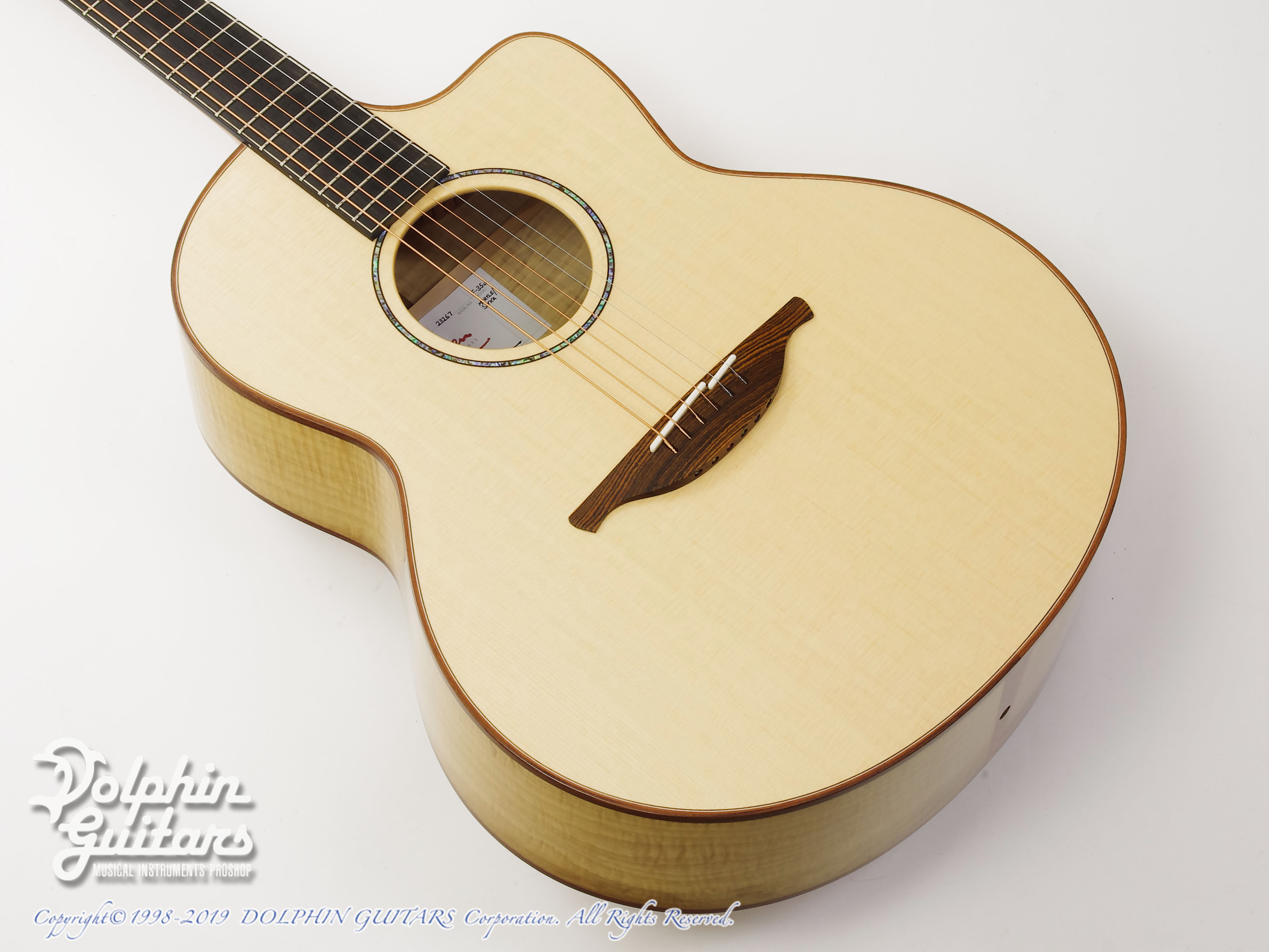 シトカ・スプルース・トップ、マートルウッドS&B、マホガニーネック、エボニー指板、ローズウッド・ブリッジ、44,5mmナット、648mmスケール、タスマニアン・ブラックウッド・バインディング、アバロン・ロゼッタ、Gotohペグ。