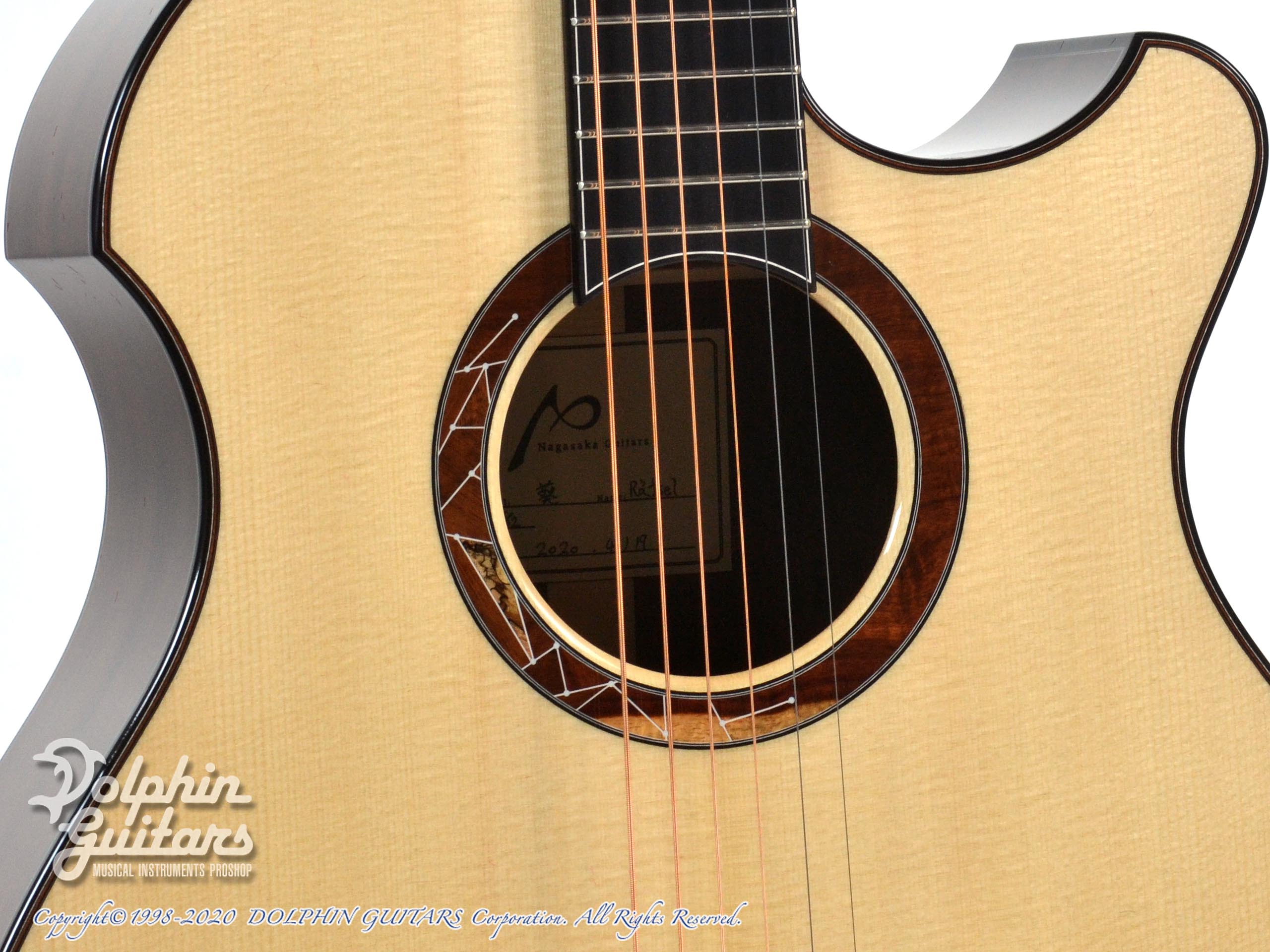 岐阜県のルシアー長坂幸彦主宰、NAGASAKA GUITARS。幾何学ロゼッタが芸術的!マダガスカル・ローズウッドボディの新作Aoi(葵)
