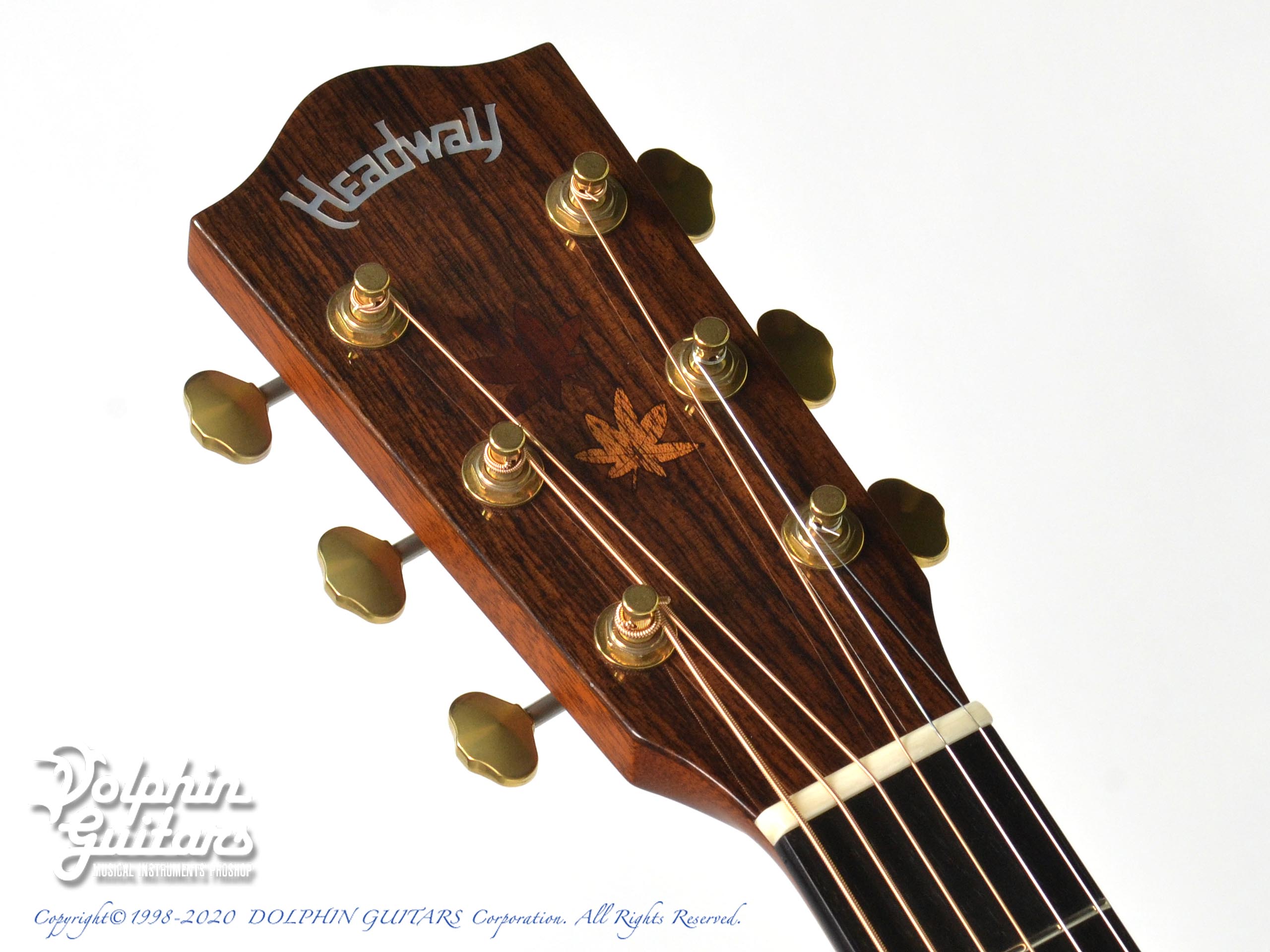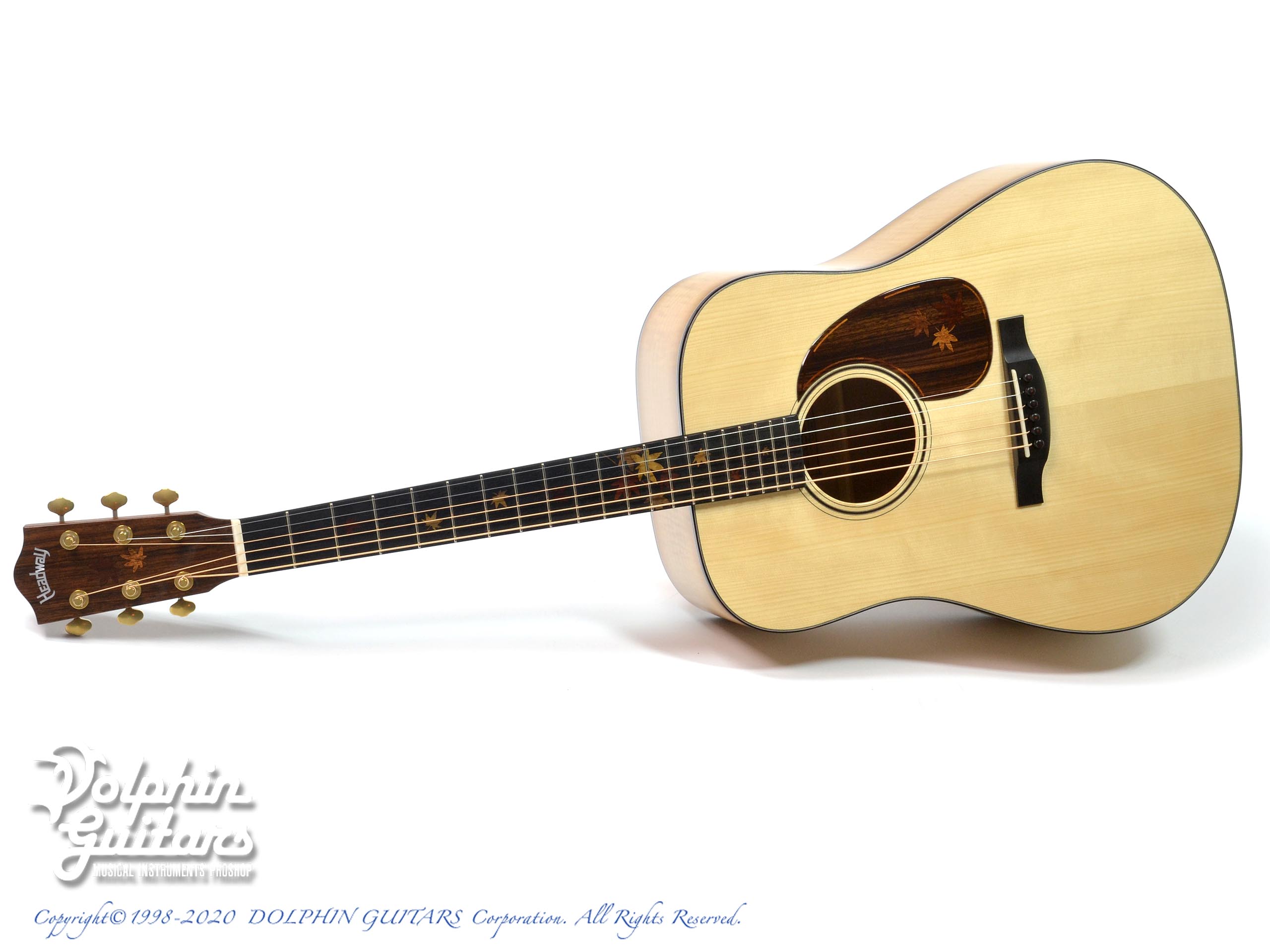 Autumn Leaves:Headway初の秋特別モデル「HD-Autumn Leaves」はボディサイドバックに「楓」を採用しました。秋に紅葉をモチーフとし、ヘッドからピックガードにかけてインレイのもみじの葉が揺れ、ボディサイドバックはブラウンバーストカラーで仕上げています。ピックガードのラインやブリッジピンのドットなど、細かい所にも紅葉をイメージした色合いの木材を使用したこだわりの特別モデルです。