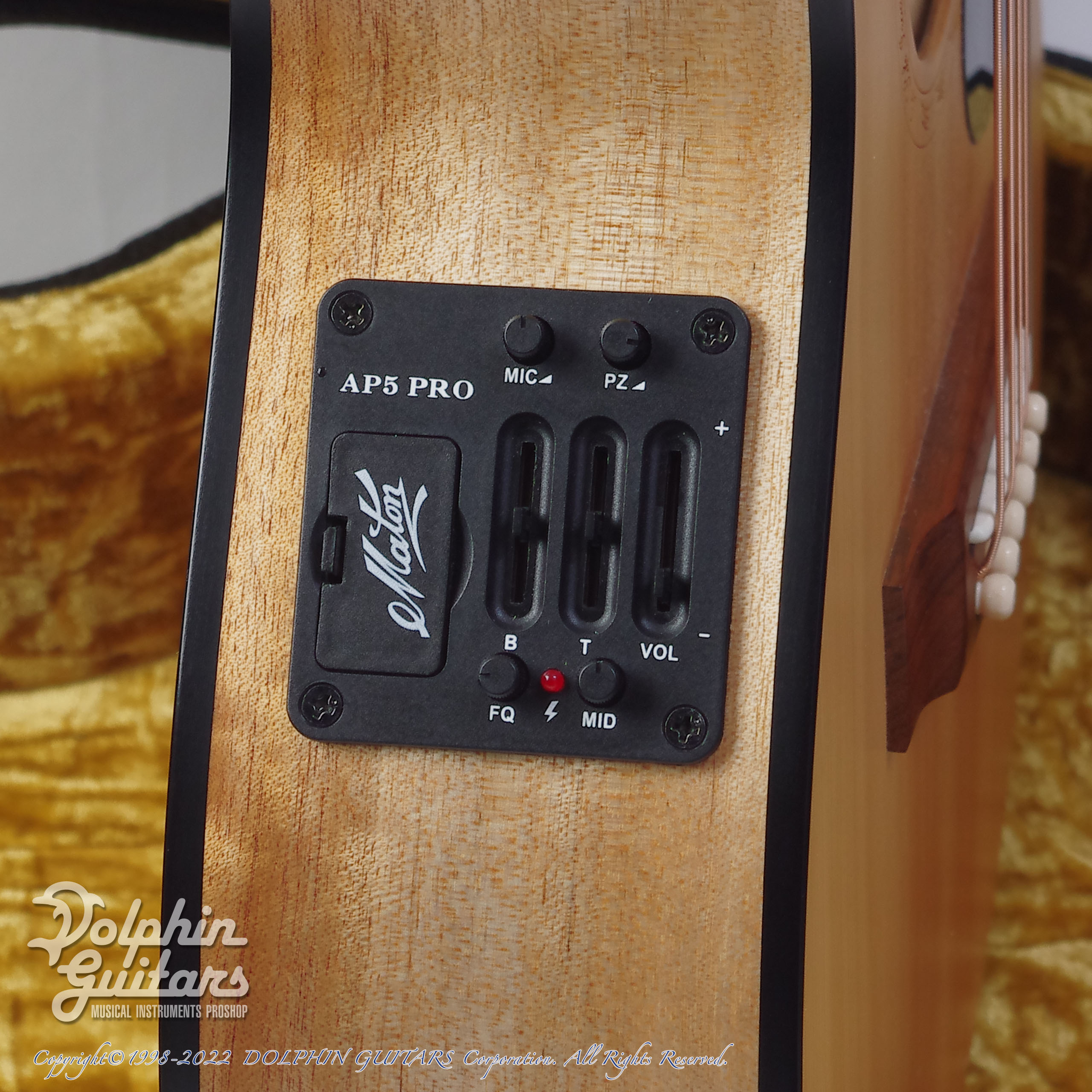 特別仕様のもう一つのポイントは、メイトンの魅力の一つでもあるPUシステムに上位モデル同様AP5 Proを搭載。オリジナルのアンダーサドルPUにコンデンサーマイクを併用する事により、奥行きのある音域と抜群なエアー感に加え、ボディヒット音も余すことなくアウトプットします。また、高い出力を持つプリアンプを内蔵しておりますので、外部プリアンプ等を使用せずとも、そのままプラグインしていただければ極上のサウンドをお楽しみいただけます。PUとマイクVolは完全に独立しており、手元での出力バランス調整が可能ですのでお好みや現場に合わせてご使用下さい。