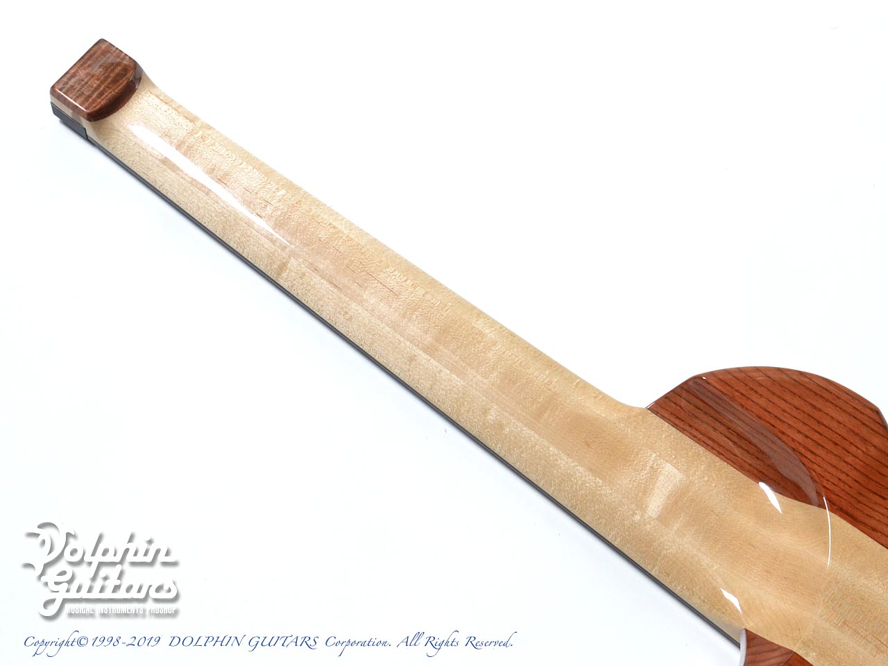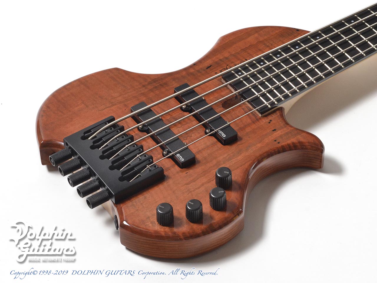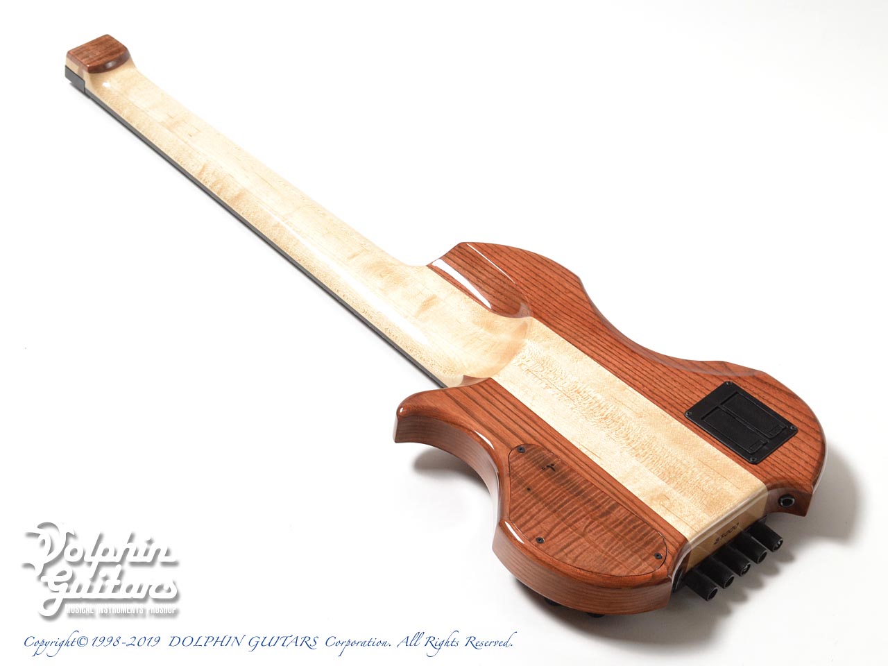 スポルテッド・カーリーメイプル・トップ(フルカバー)、アッシュ・バック、ハード・メイプル3p・ネック(ネックスルー)、エボニー指板、USA HIPSHOT製ヘッドレスユニット、EMG J-set for 5st搭載、フルグロスフィニッシュ。