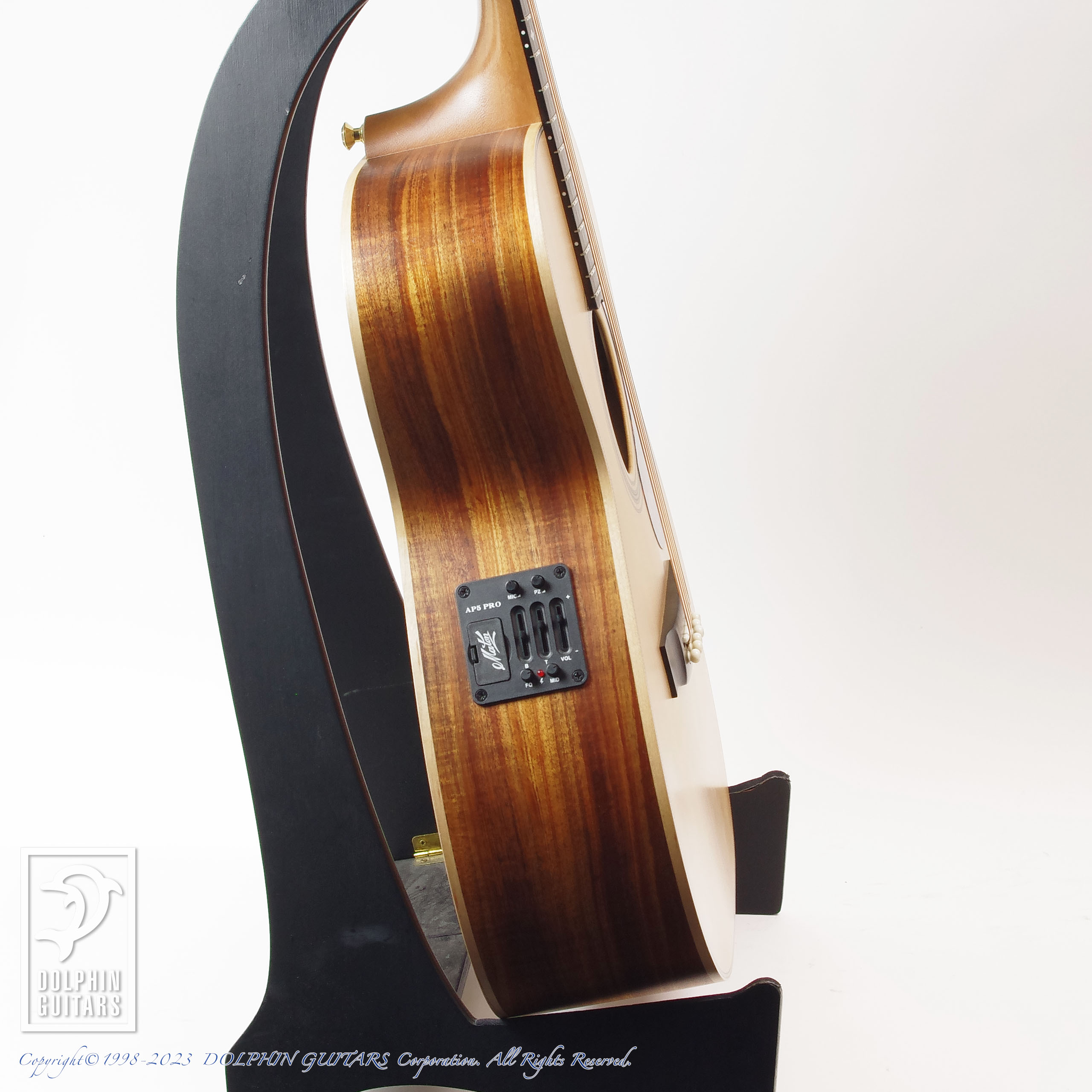 搭載されたAP5pro PUシステムは、オリジナルのアンダーサドルPUにコンデンサーマイクを併用する事により、奥行きのある音域と抜群なエアー感に加え、ボディーヒット音も余すことなくアウトプットします。また、高い出力を持つプリアンプを内蔵しておりますので、外部プリアンプ等を使用せずとも、そのままプラグインしていただければ極上のサウンドをお楽しみいただけます。PUとマイクVolは完全に独立しており、手元での出力バランス調整が可能ですのでお好みや現場に合わせてご使用下さい。