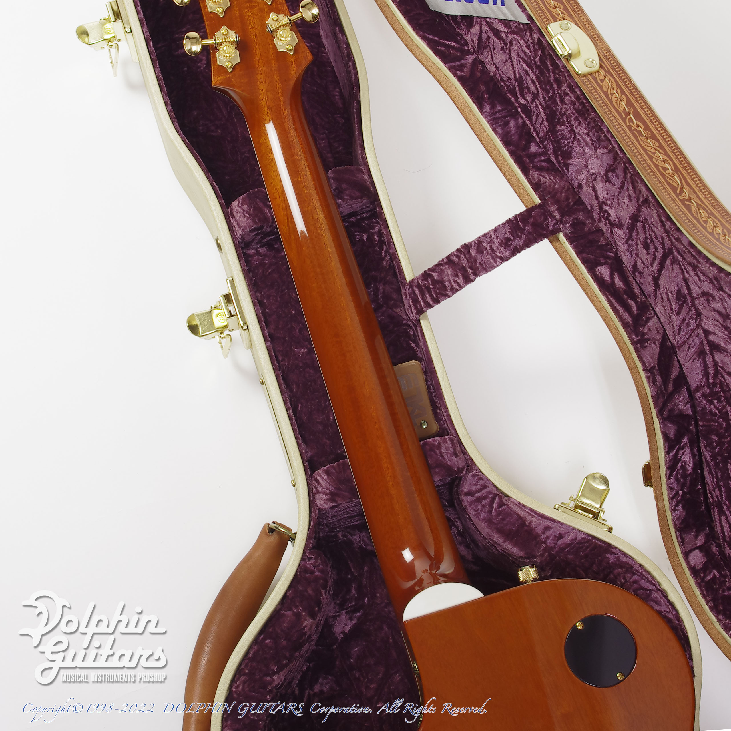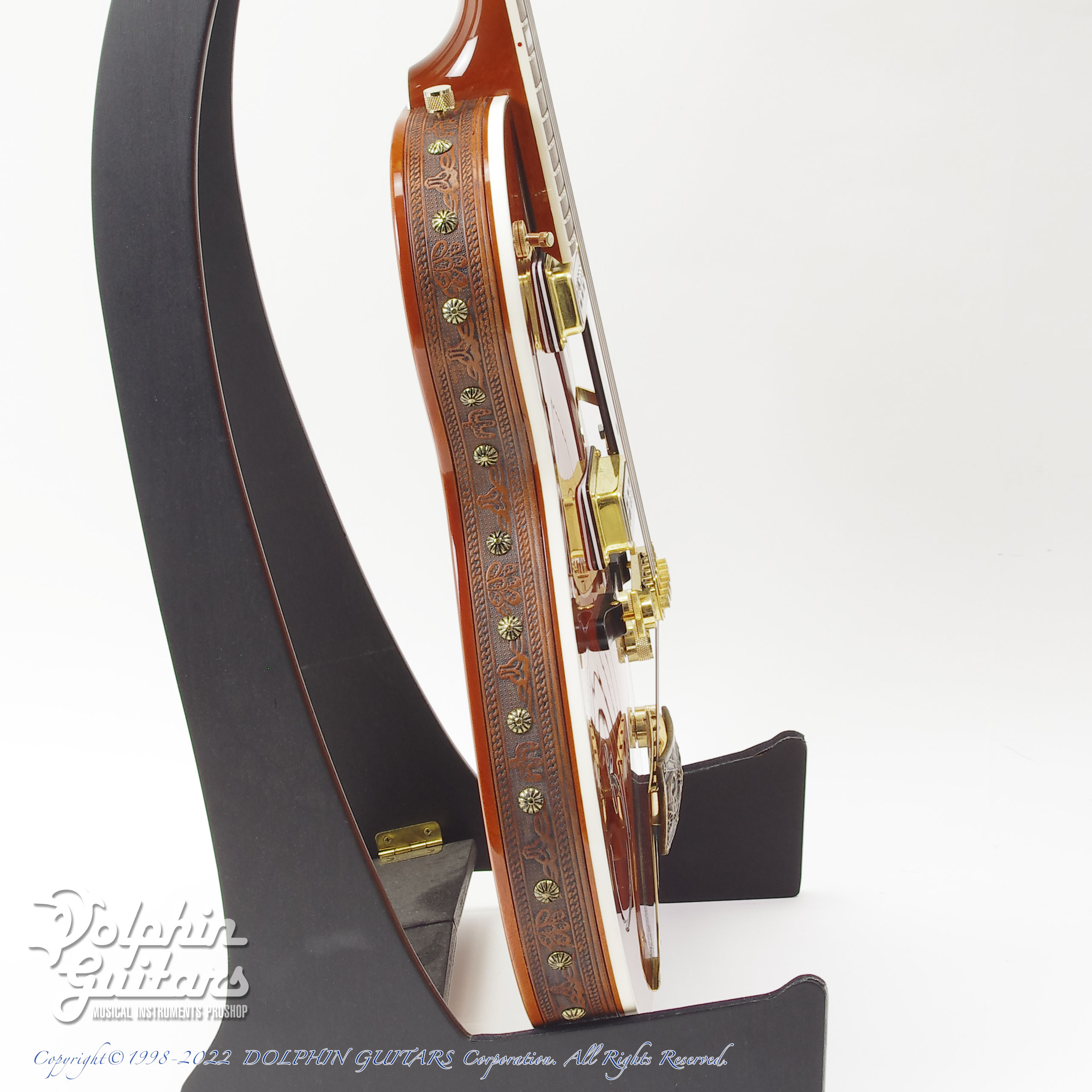 ボディサイドにはウェスタンモチーフのレザートリム、ポジションマークにもウェスタンモチーフのブロックインレイを採用。さらに、テールピスにマウントされたベルトバックルがこのモデルのみの仕様となっており、非常に希少性の高いデザインであります。