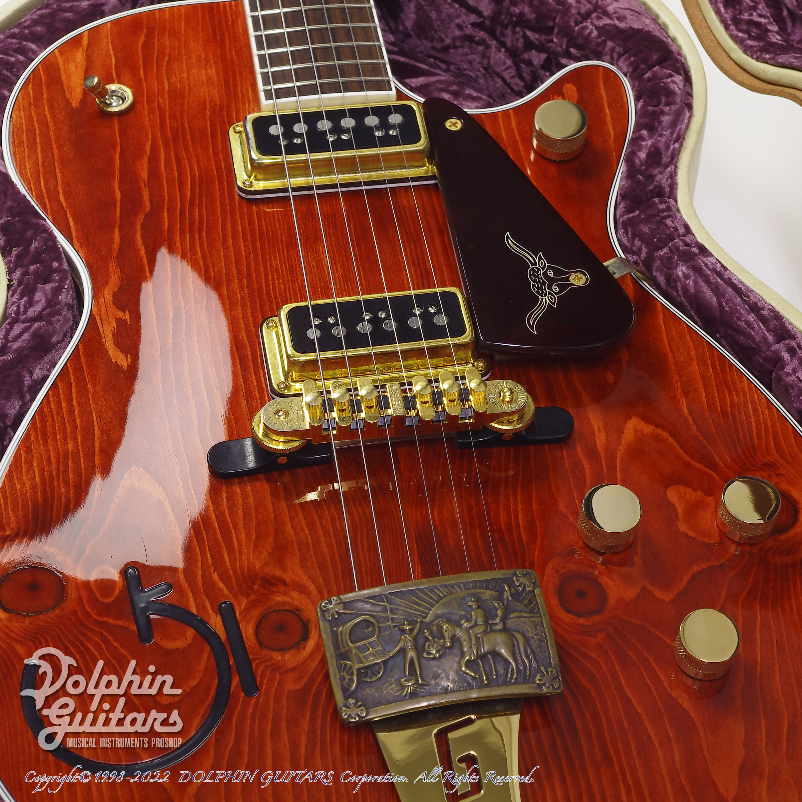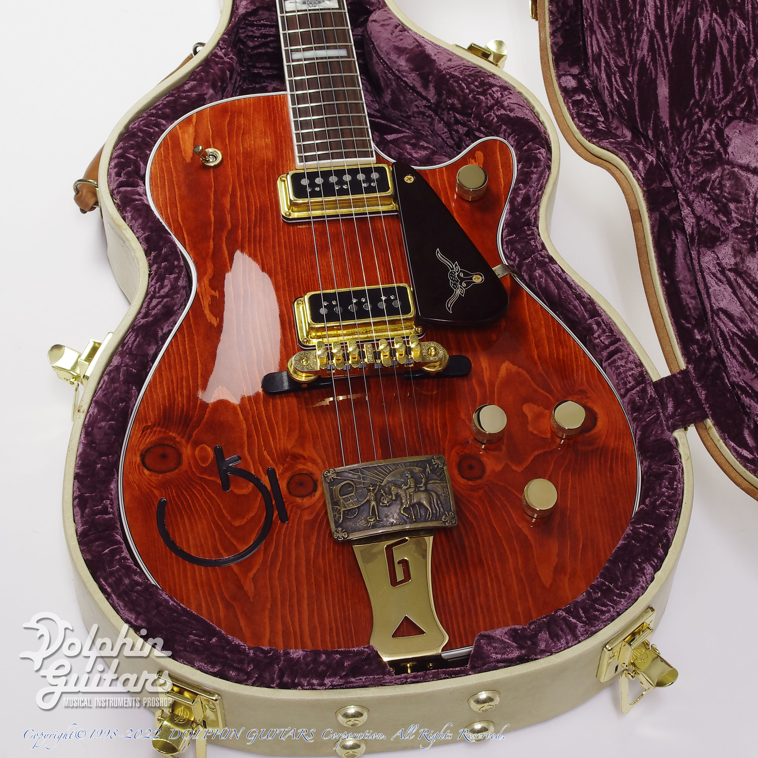 ノッティーパインのトップ、ベルトバックルのテールピースとサイドのレザートリムが特徴的なCustom Shop G6130CS-1955 Roundup Knotty PineのUSED品。Price Downしました!