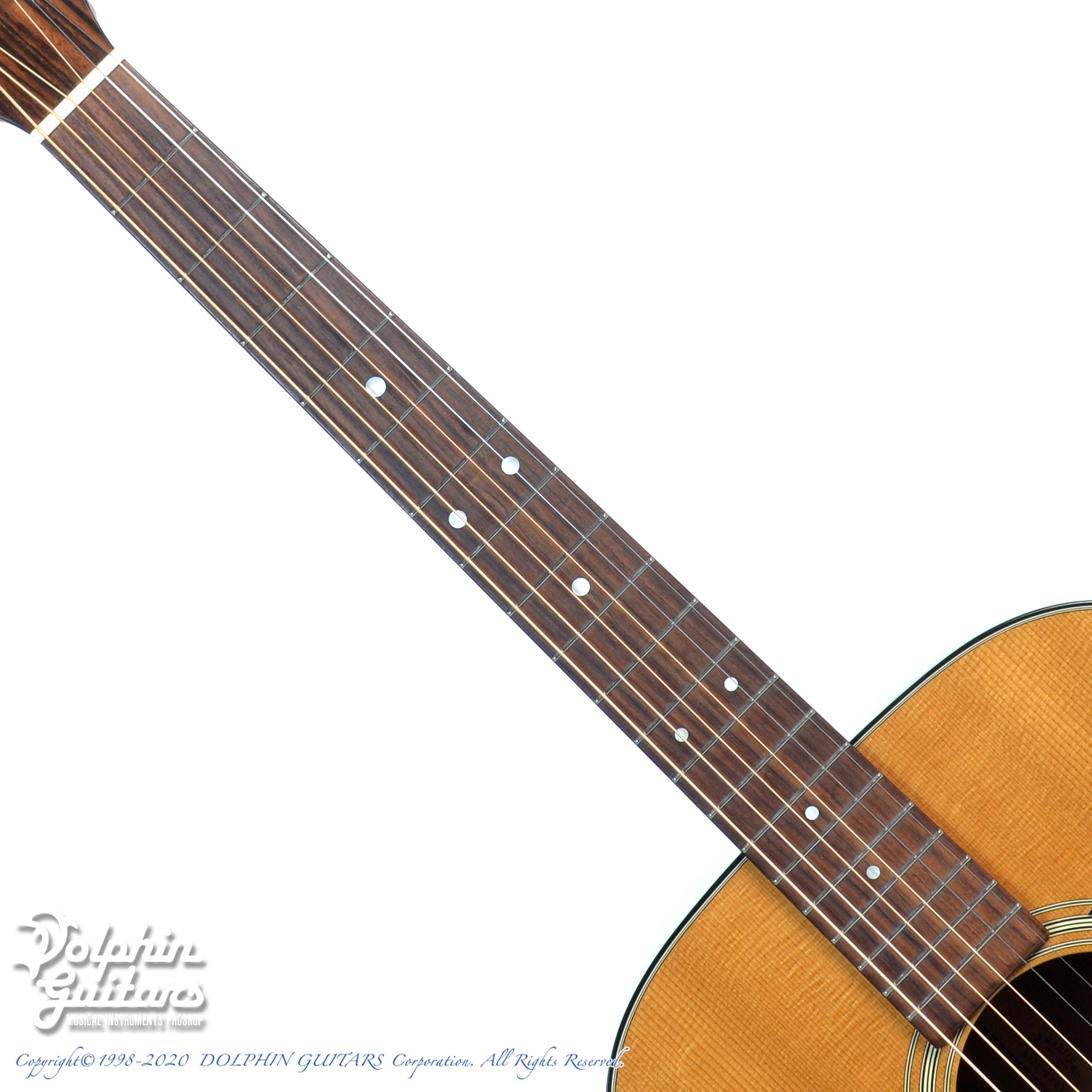 2012年に大幅に仕様が変更されたD-18。フォワードシフテッド・スキャロップド・X・ブレイシング、エボニー材のブリッジとフィンガーボードという戦前の仕様となった今、本器のノンスキャロップブレイシングとローズウッド・フィンガーボード&ブリッジは希少スペックでしょう。