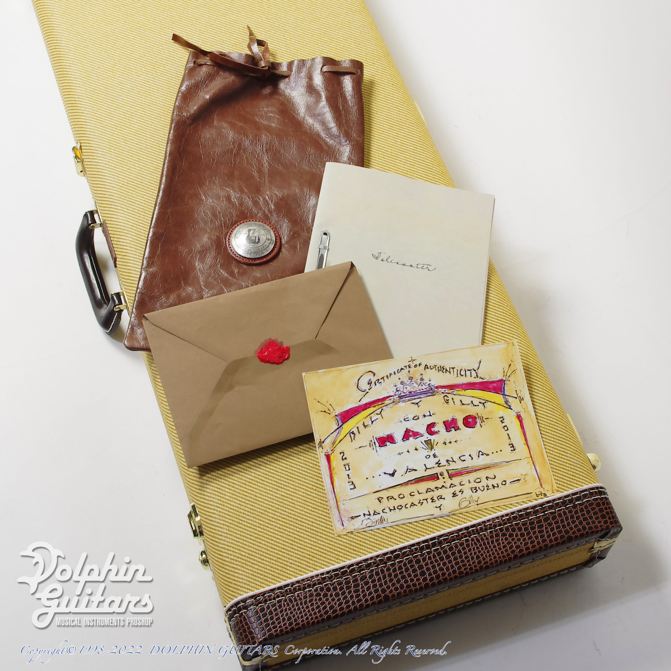 スペック表や証明書が封入されたレターと、50年代Fenderの資料のコピーが入ったオリジナルレザーバック付き。ケースはオリジナルツイードケースが付属します。