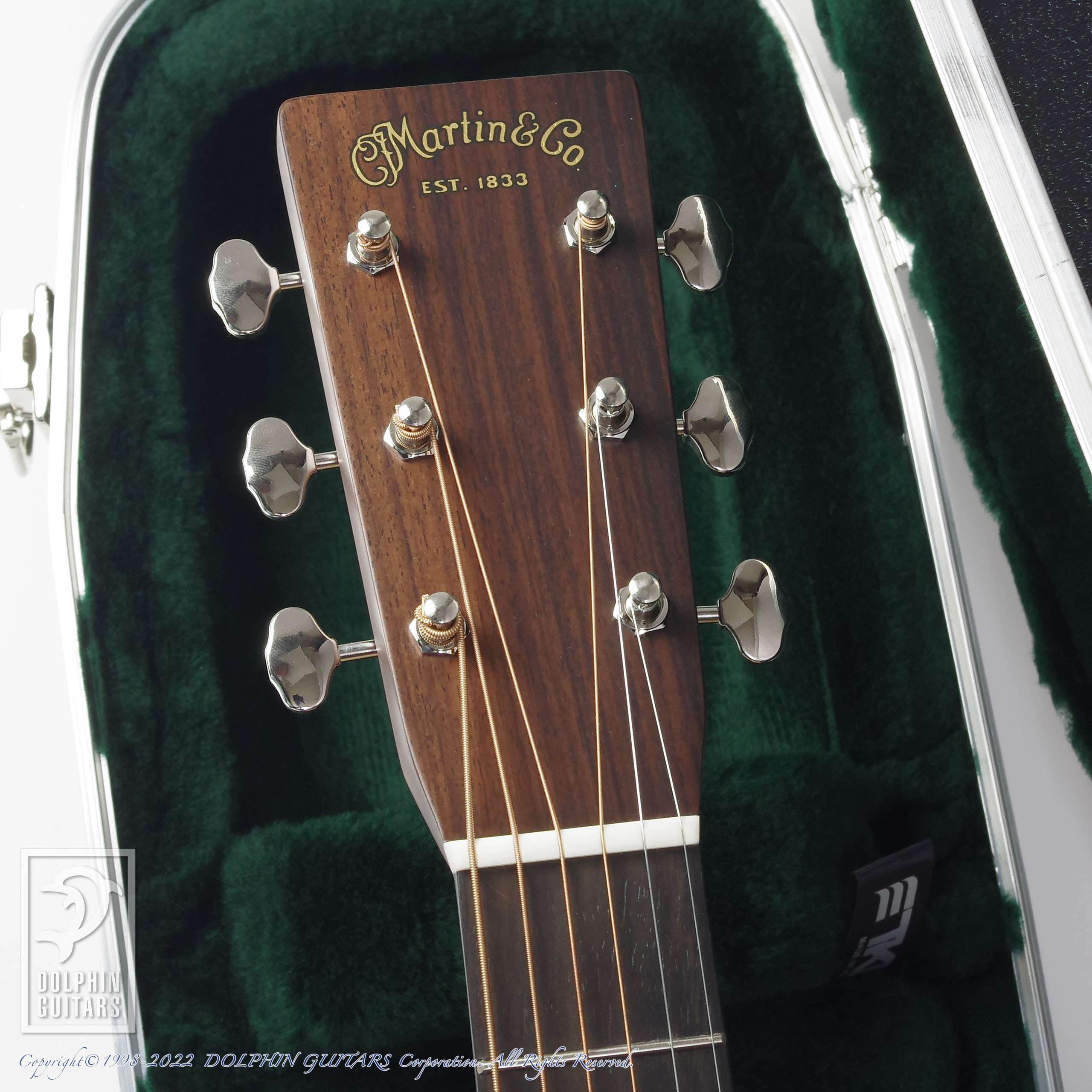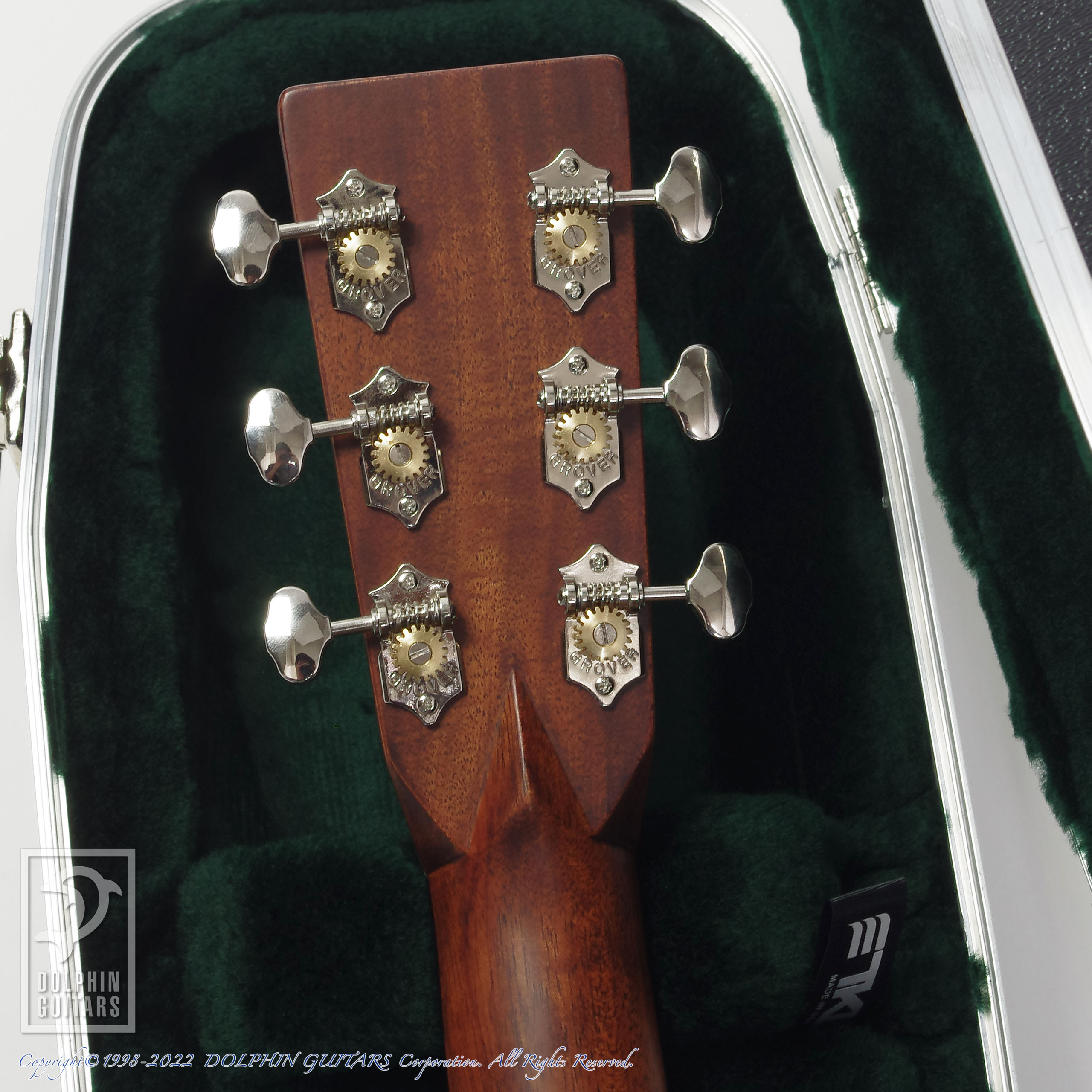 トラディショナルな外観に現代的な操作性を与えられ、マーティンファンには嬉しい進化となりました。ヘリングボーントリム、ダイヤモンドインレイ、オープンギアチューナー、エイジングトナーフィニッシュ、べっ甲柄のピックガード、デカールロゴなどのビンテージスタイル、44.5mm幅のネックはローポジションからハイポジションにかけてテーパーが少ない、スリムなロープロファイルネックを採用、フィンガーピッキングにも最適な形状とも言えます。