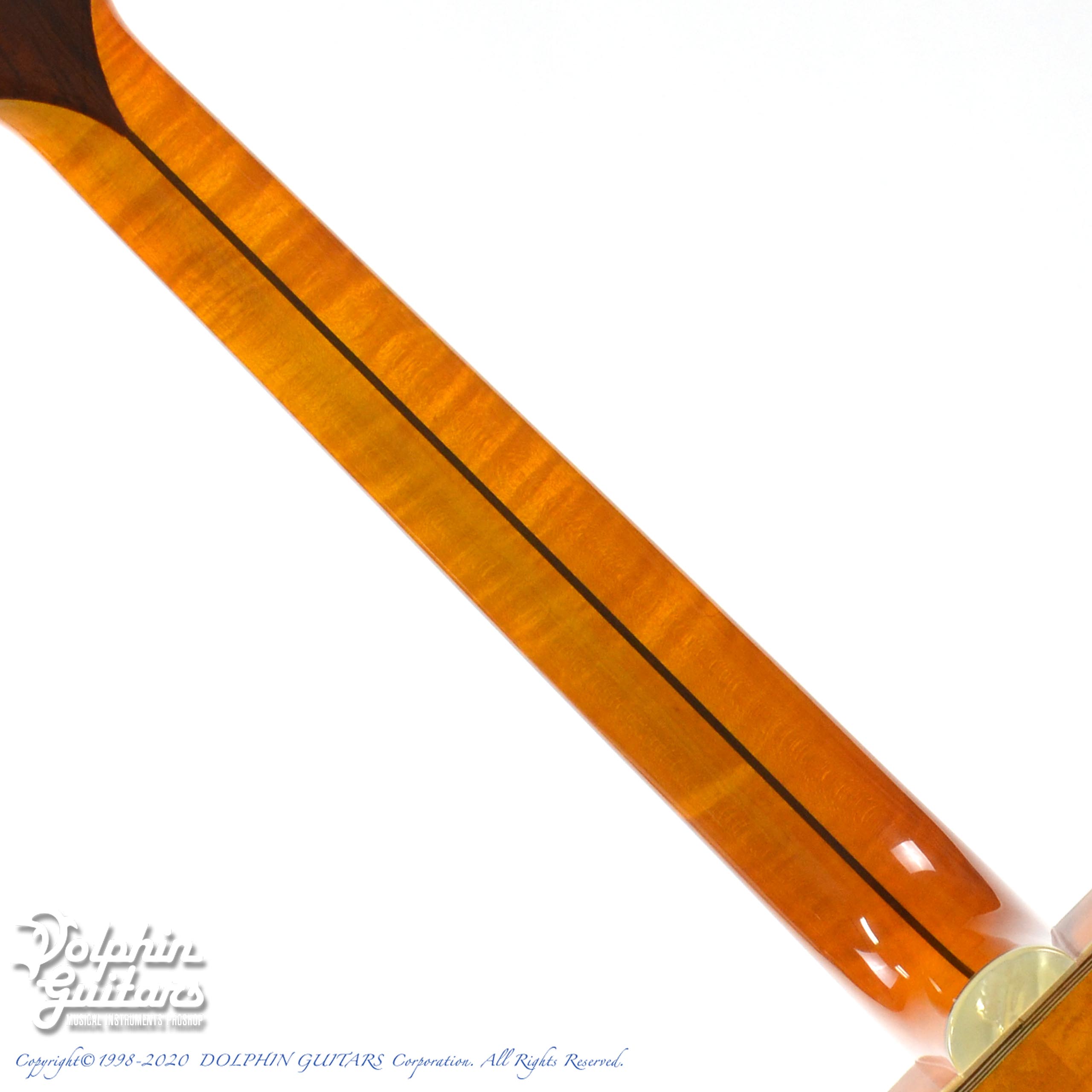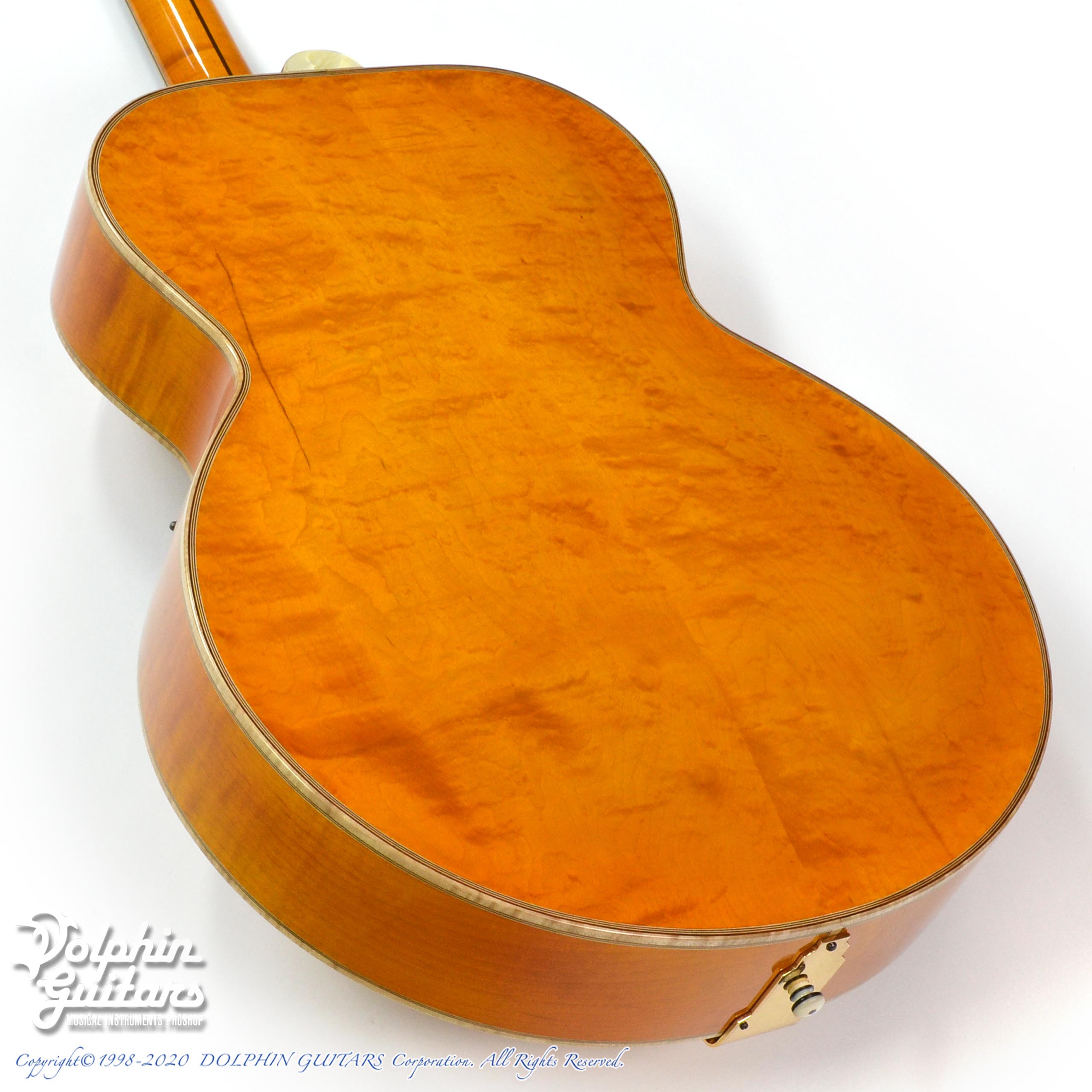 バインディングは全てメイプルにし、ボディ〜ヘッドまでオールリフィニッシュされ生まれ変わり、PGも木製が用意されています。ブロンド に輝く大型ボディの迫力とともに、手工品のような雰囲気も味わえる魅力的な個体です。当時の職人が手作業で削り出したアーチの形状はいつまでも眺めていられそうです。