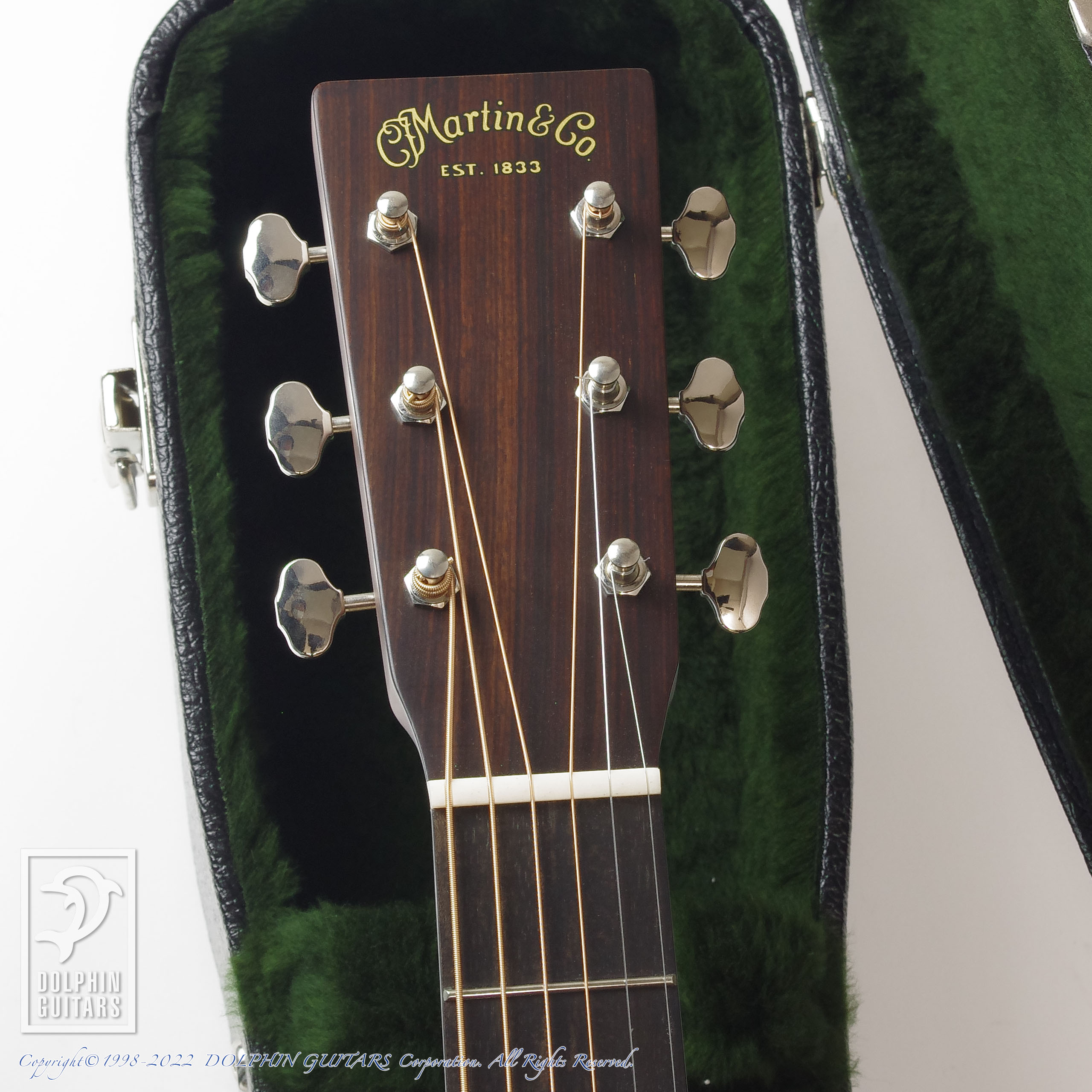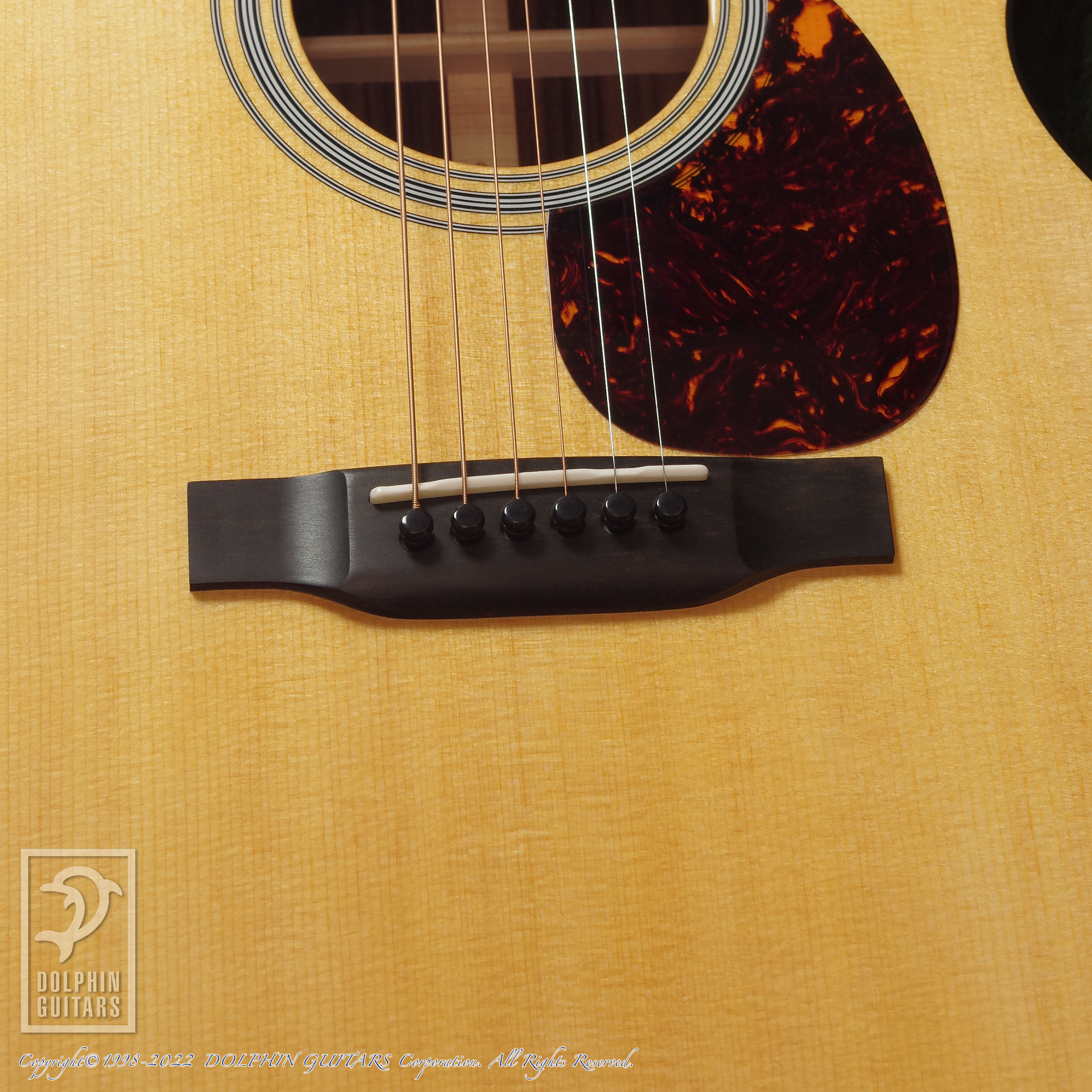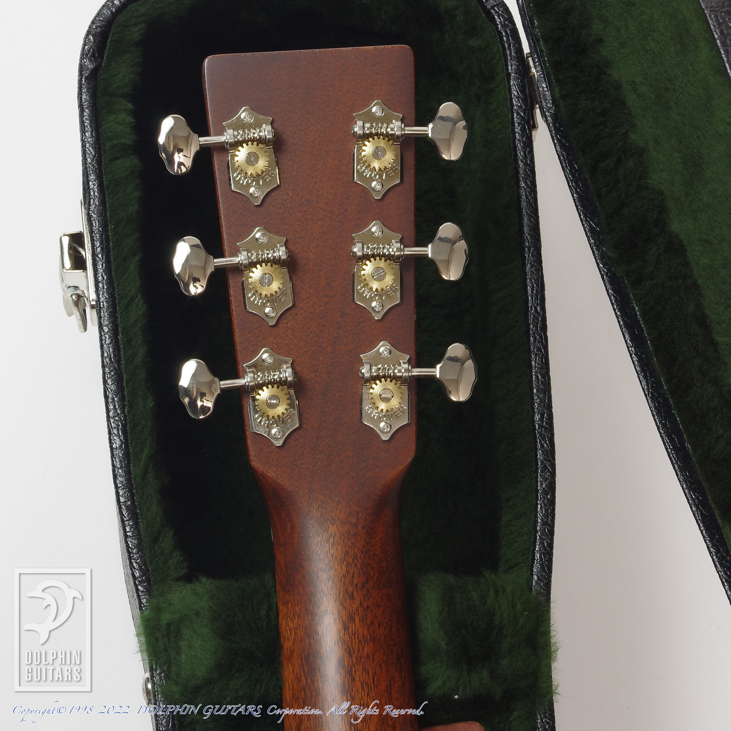 マーティンのレギュラーモデルは2018年のモデルチェンジが大きな話題となりましたが、簡単に言いますと、スキャロップドXブレイス、ヘリンボーントリムやエイジングトナー(トップ着色)、オープンバックグローバーペグ、ダイヤモンドポジションなどなど、ヴィンテージスペックの外観や雰囲気を持ちつつ、ネックシェイプは現代風に薄手のハイパフォーマンステーパーを採用し、セッティングの調整のし易さを優先してのショートサドルの採用など、現代的な操作性を備えた設計であります。