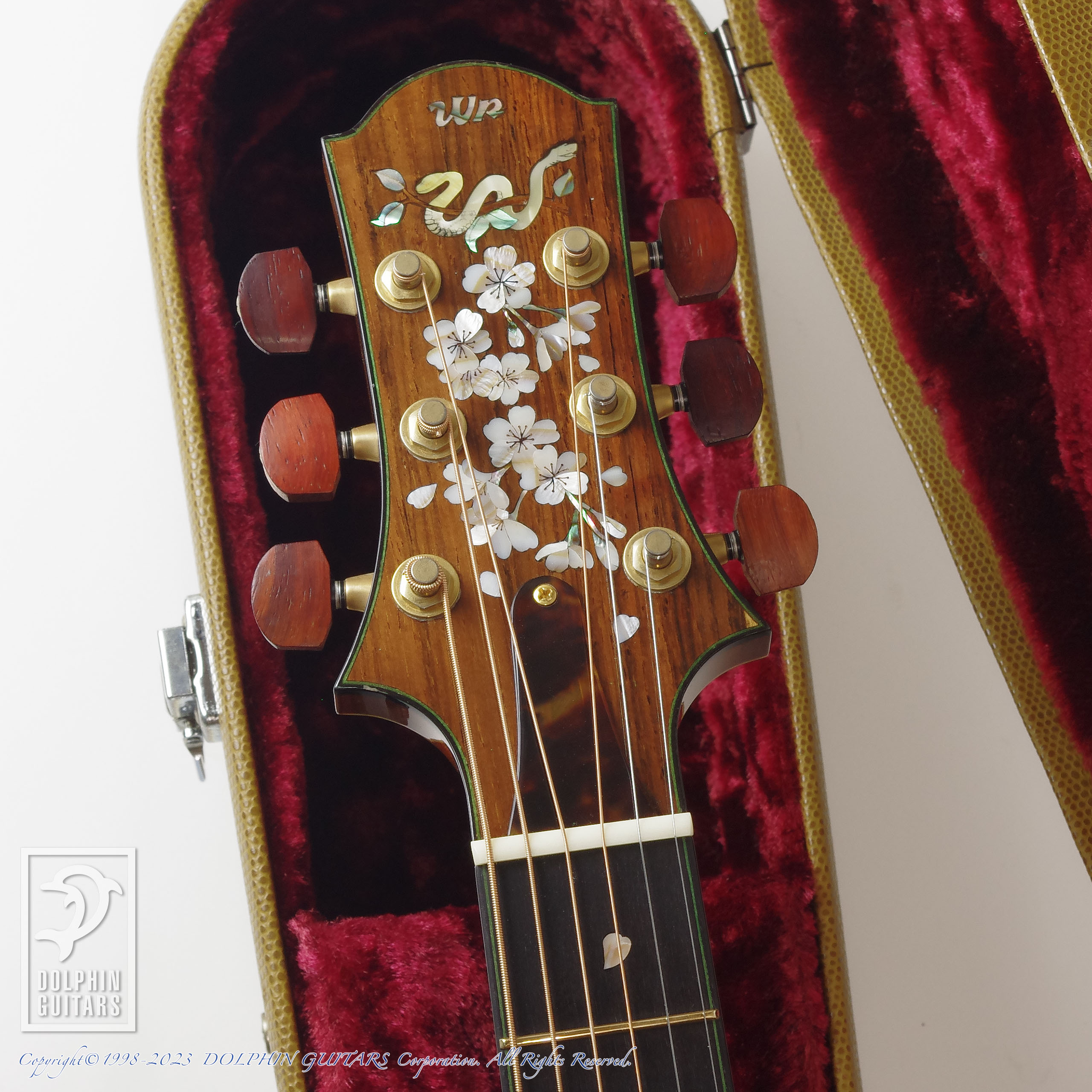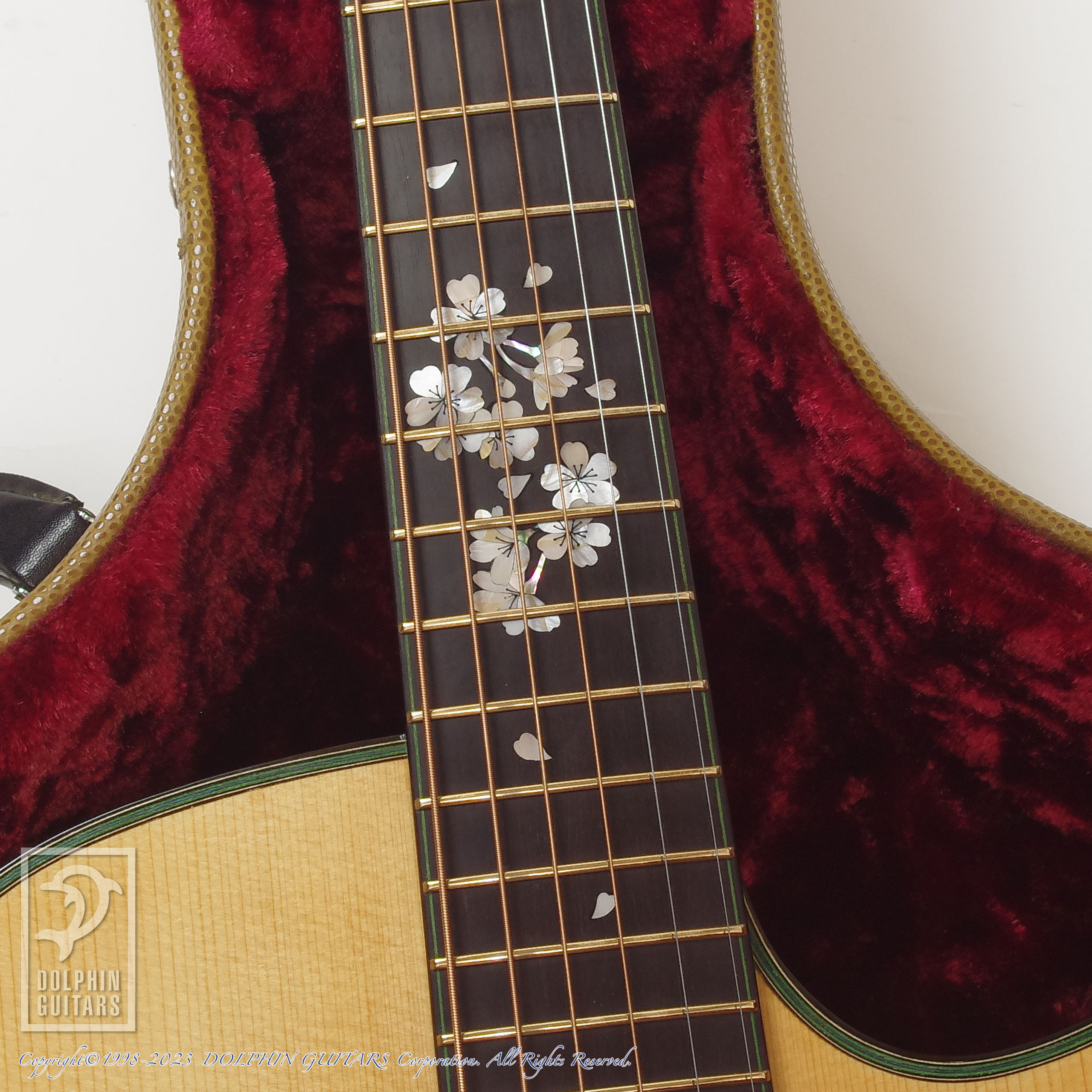 ヘッド・指板・ブリッジの桜インレイは後から施された作品であり、間近でご覧いただくと高い精度で美しく仕上げられていることがわかります。