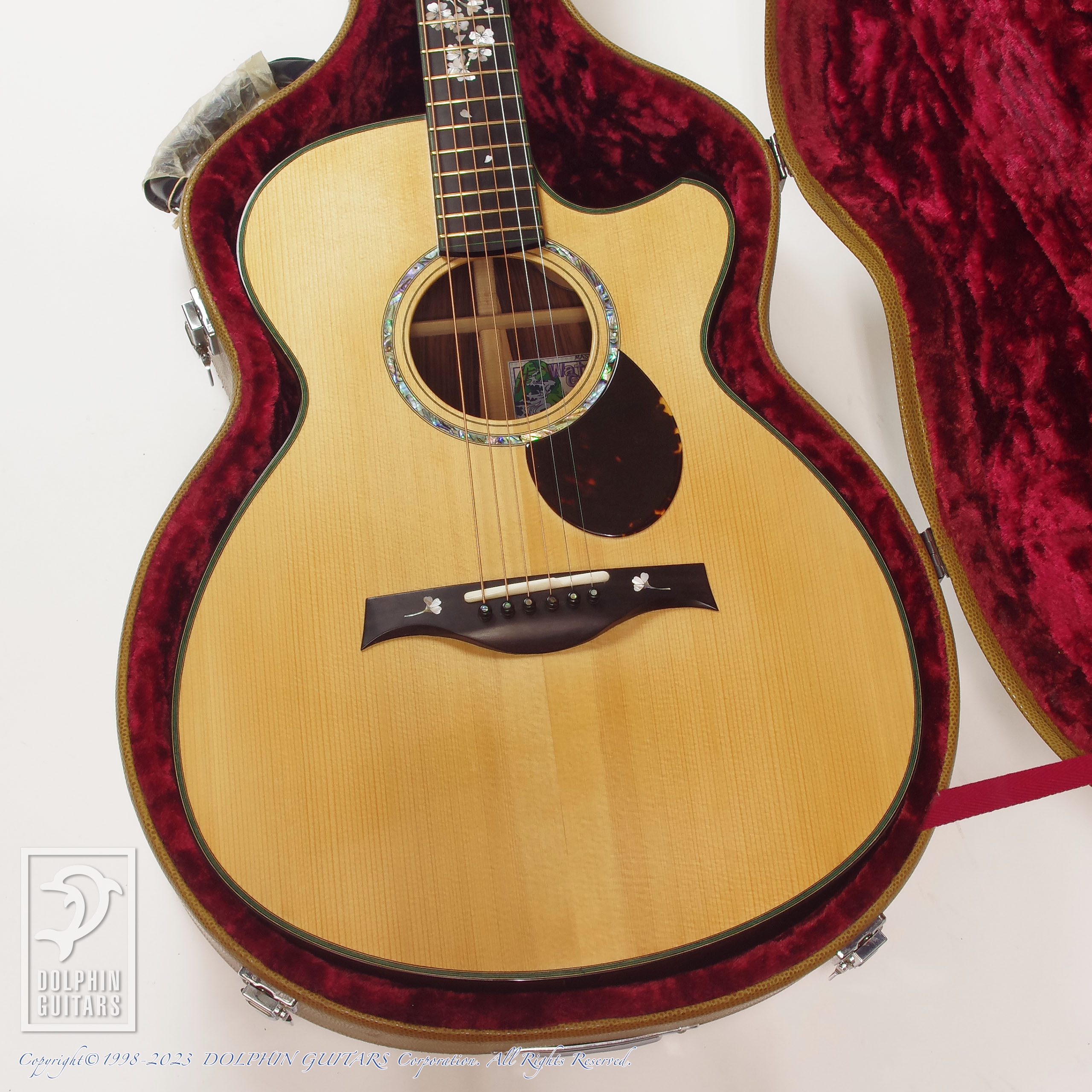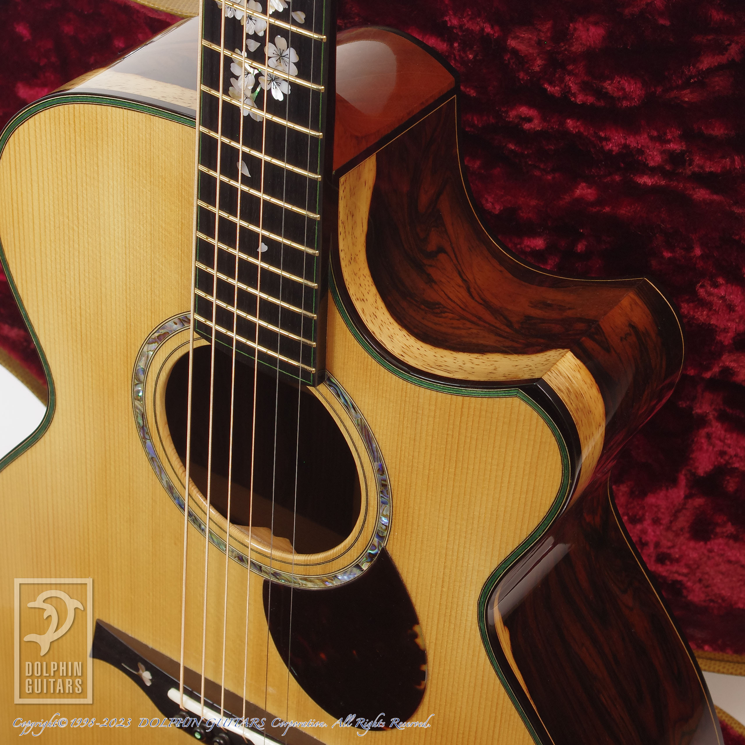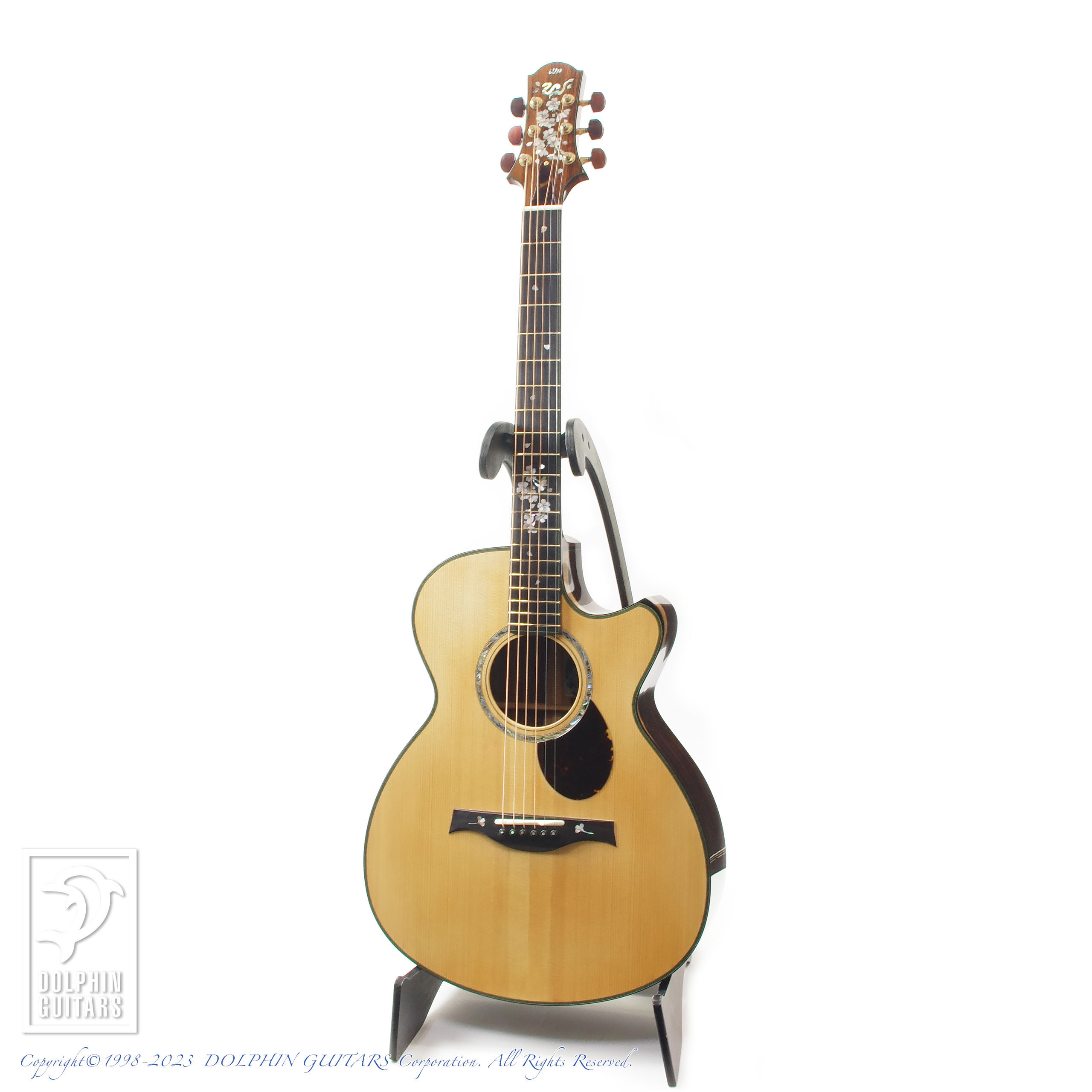 その他:フローレンタインカッタウェイ、エボニーバインディング、44,5mmナット幅、645mmスケール、本鼈甲PG&トラスロッドカバー、桜インレイ、EVOゴールドフレット