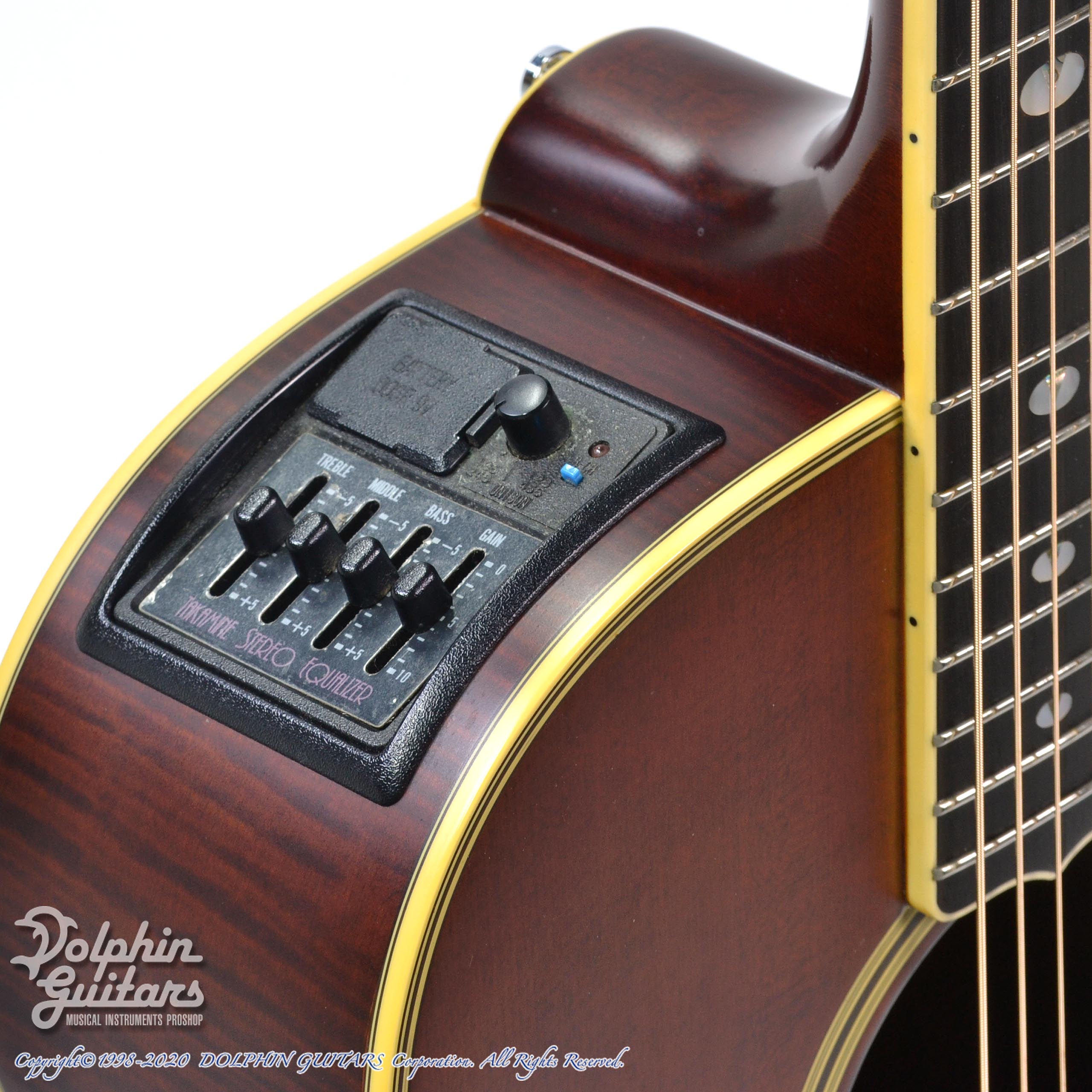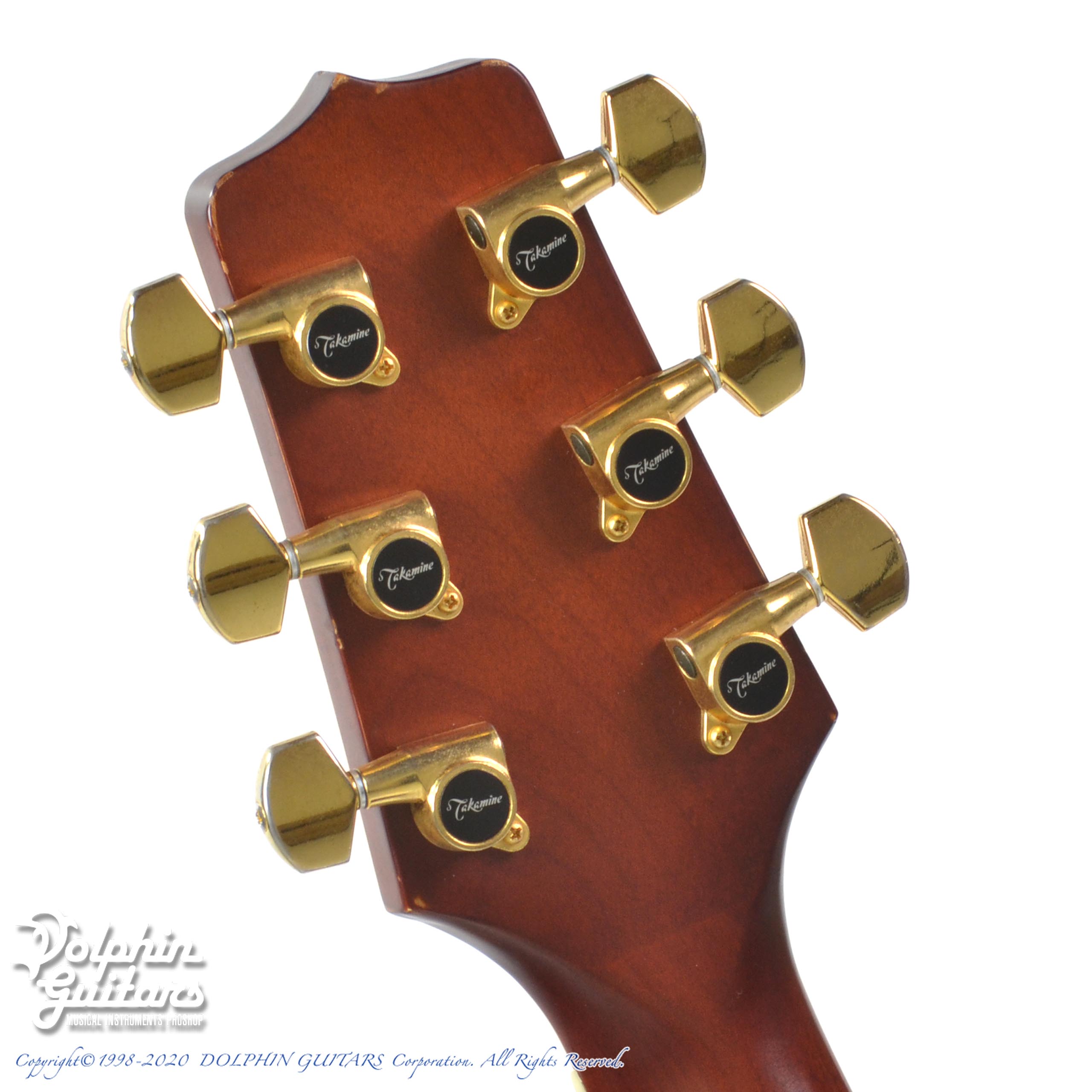プリアンプには珍しいものが搭載されております。その名も"TAKAMINE STEREO EQUALIZER"。「123弦+456弦」または「135弦+246弦」を2つのラインで出力できるステレオシステムです。完全なパラアウトと言うよりは7:3くらいのバランスでそれぞれが鳴ります。これはボディサイドのステレオジャックよりステレオケーブルを用いて出力することにより使用可能です。もちろん通常のエンドジャックを使用したり、ステレオ出しの時でも「UNISON」を選べば普通のモノラル出力として使用可能です。3バンドEQはマスターEQとして全体に効きます。さすがタカミネ製品、こんな複雑なシステムも現在でも良好に作動しております。