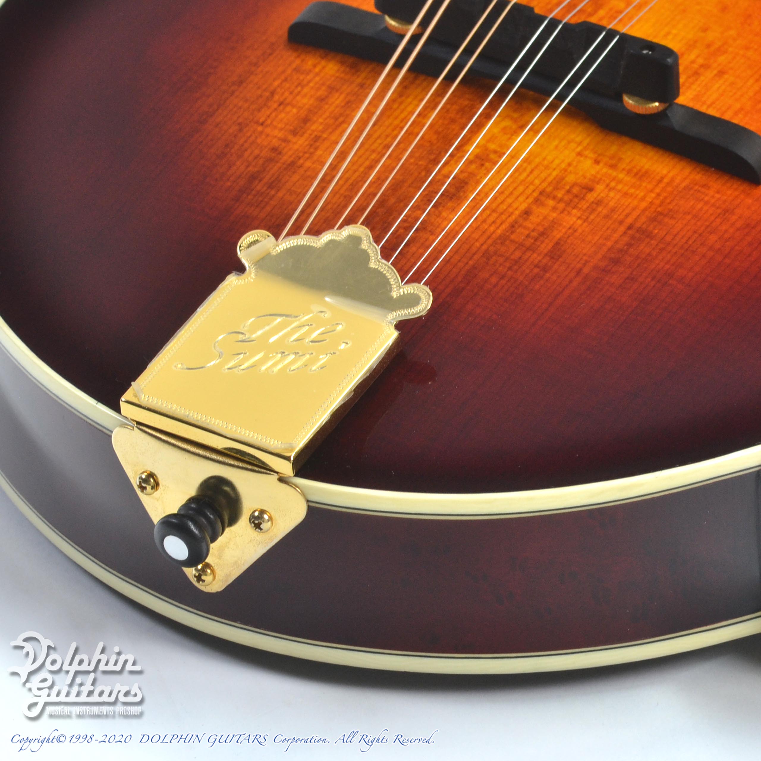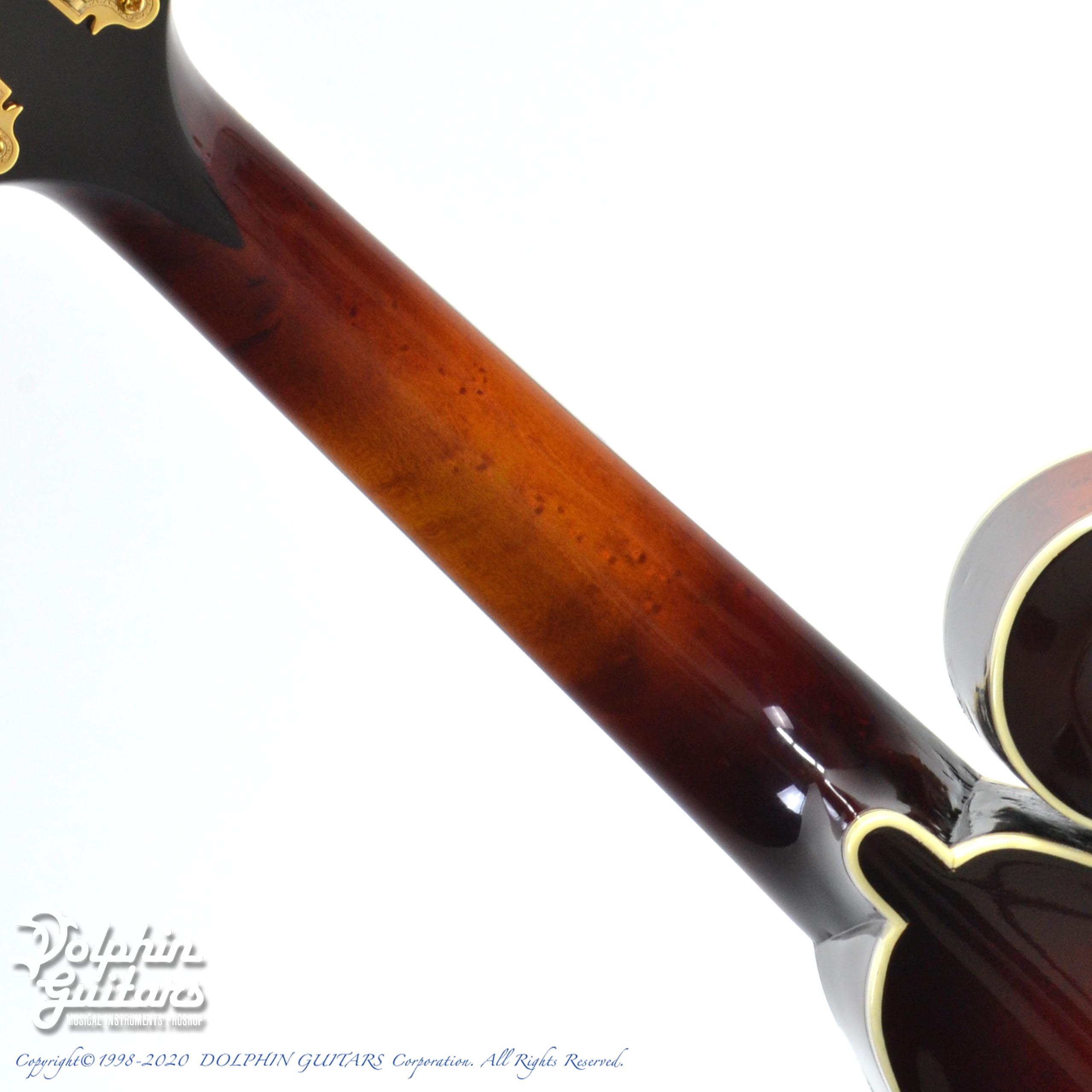 スクロールの先端まで一切手を抜かない仕上げや、トップ&バックのハンドカーヴィング(手作業での削りだし)により生み出されるボディ外周の独特の”返り”の美しさは、つい指でなぞりたくなってしまうほどです。そしてペグやテイルピースのゴールドパーツが更なる美しさに拍車をかけ、芸術品の領域まで昇華させています。本当に美しいです。