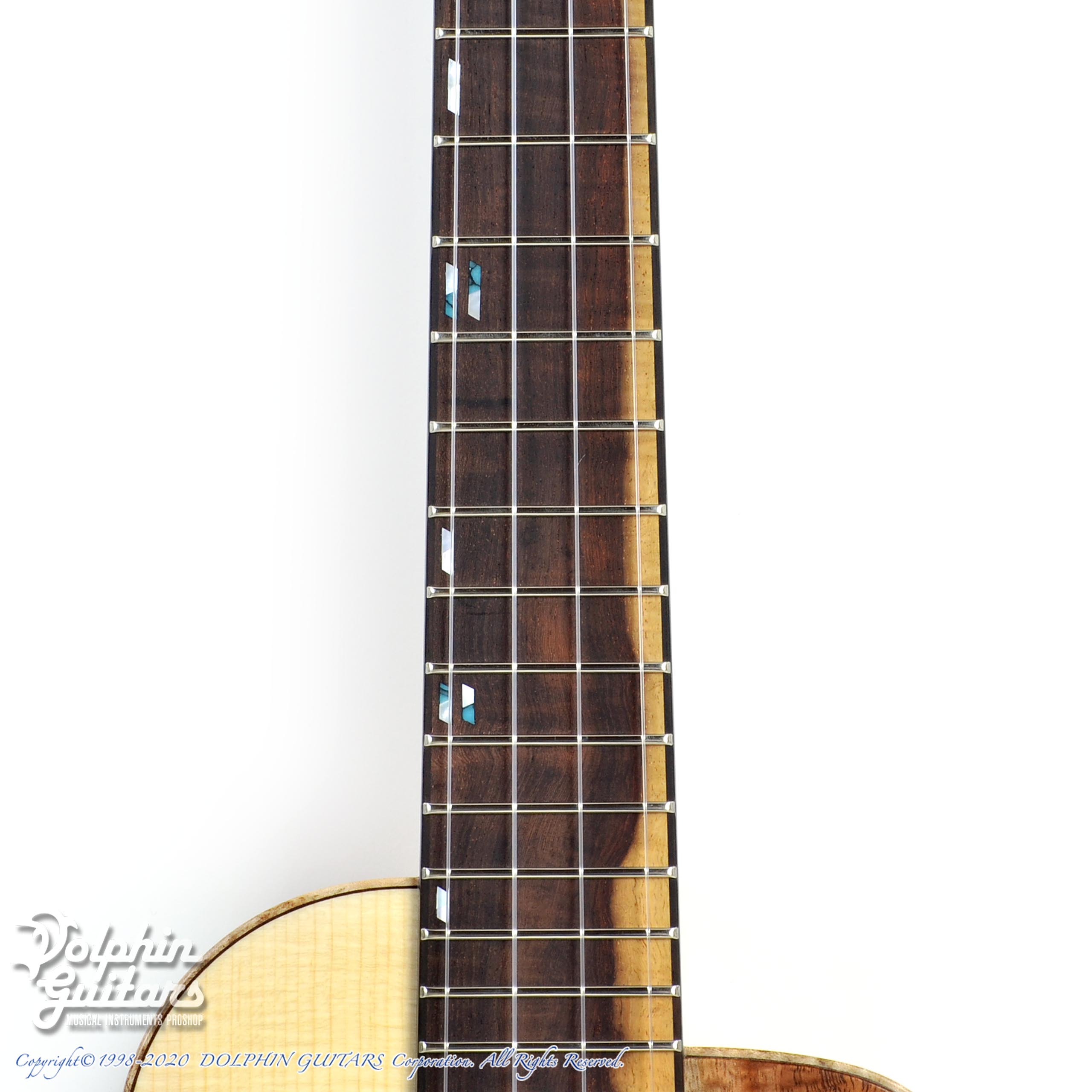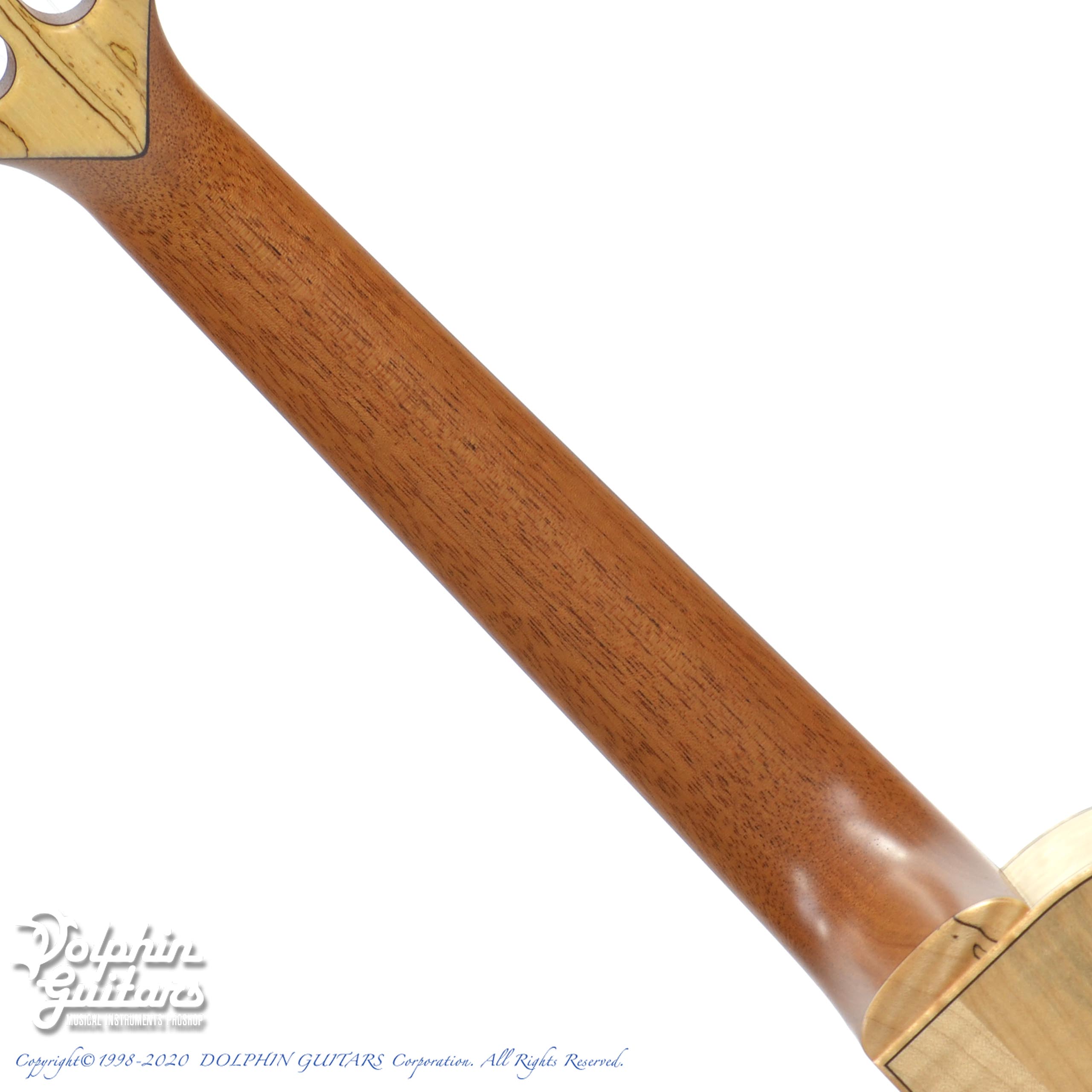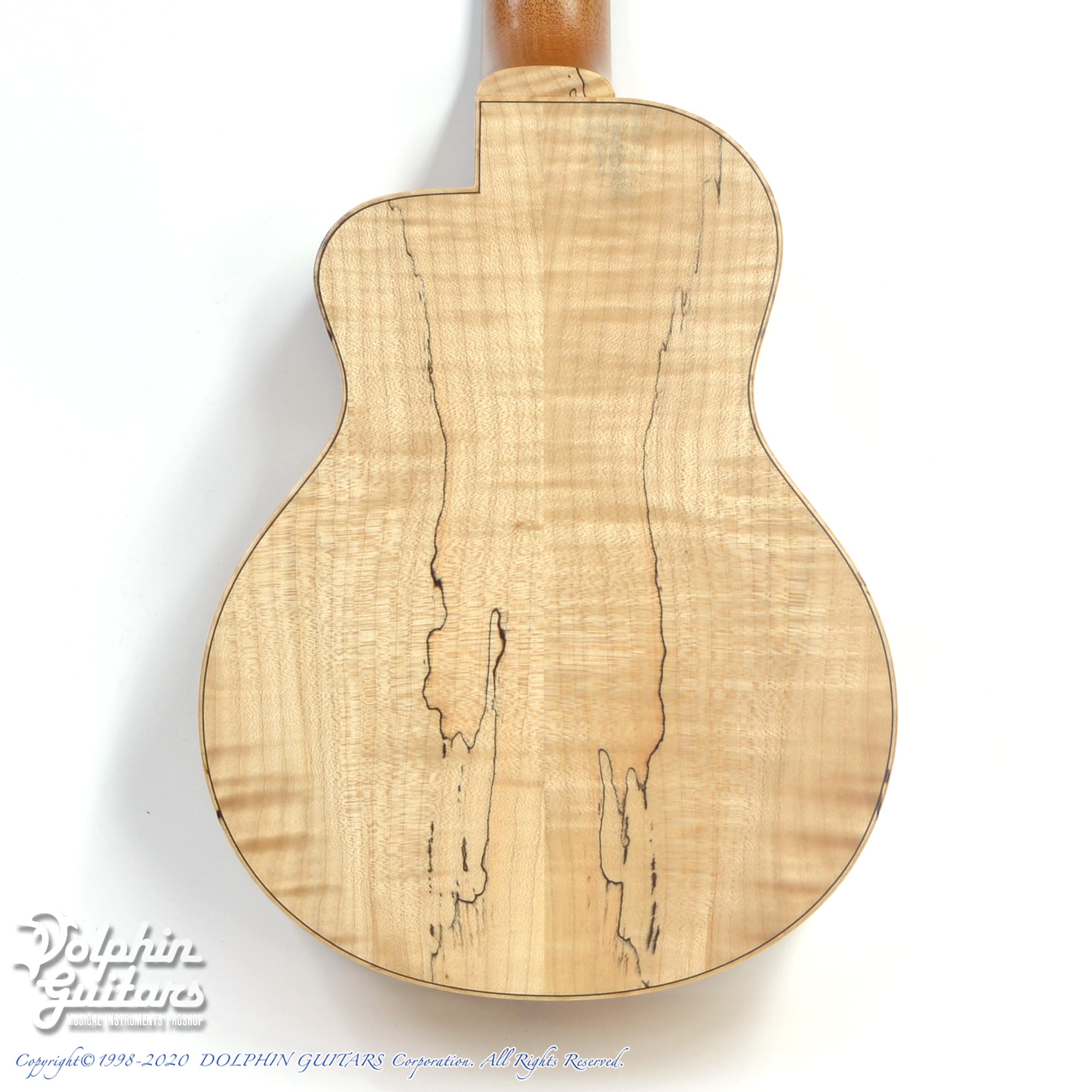 フレイム・ジャーマン・スプルース・トップ、スポルテッドメイプルS&B、ホンジュラスマホガニー・ネック、ピックガードにはコアを、ヘッドプレートには特徴的な木目のスポルテッドブナを使用。