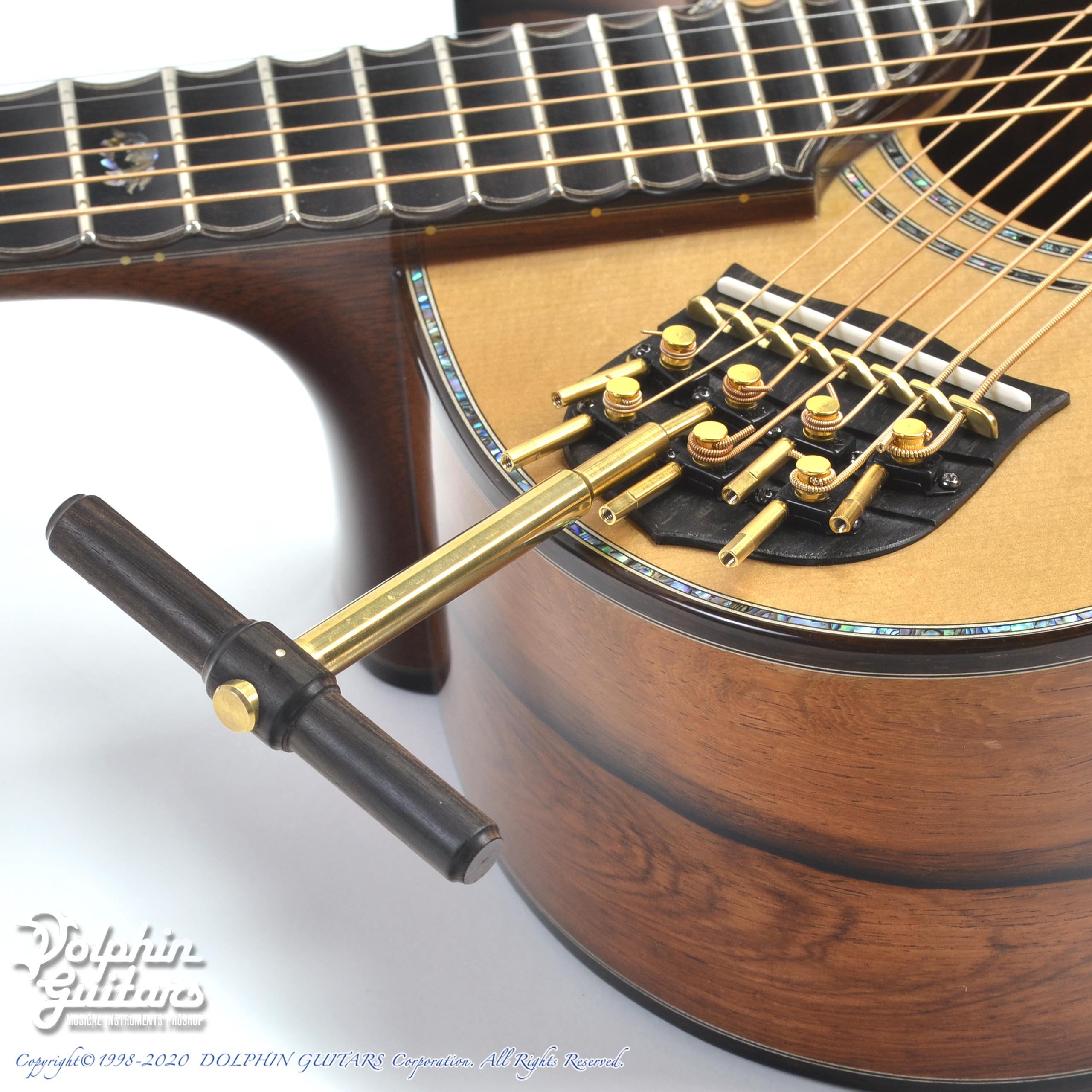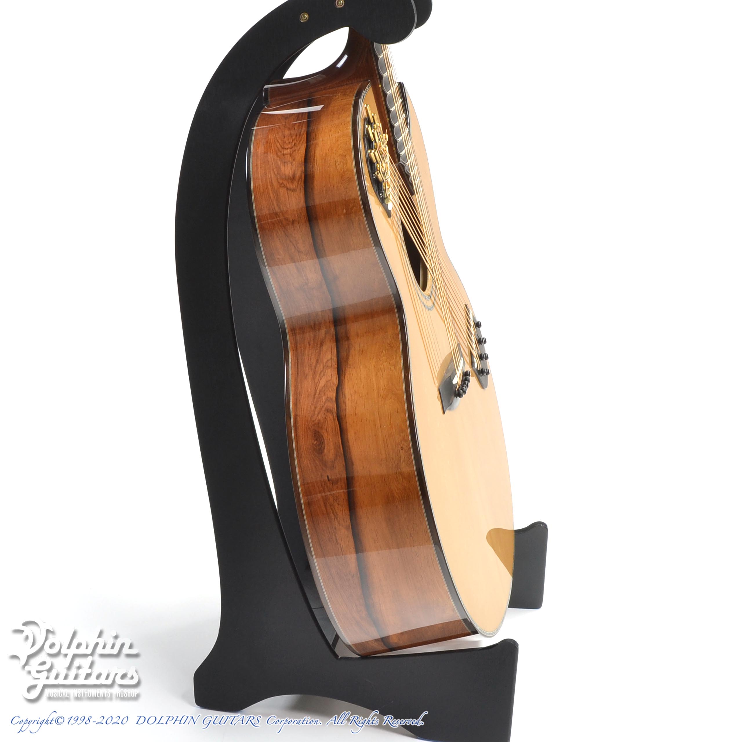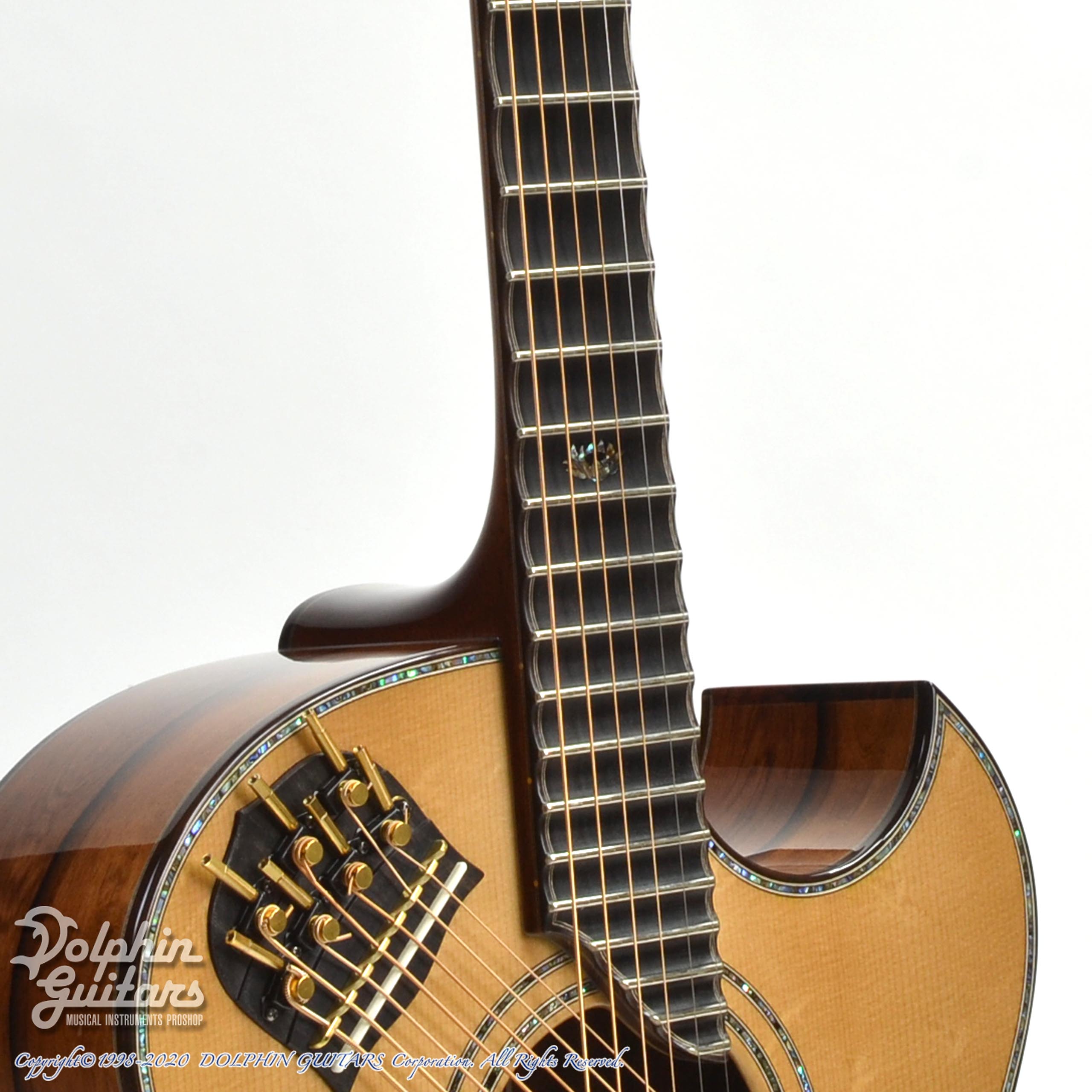 イタリアン・ベアクロウ・スプルース・トップ、マダガスカル・ローズウッド・サイド&バック、マホガニー/イタリアン・ウォルナット3pネック、マッカーサー・エボニー・スキャロップド指板&駒、シャーラー糸巻き(6弦)、ゴトーステルス糸巻き(7弦)。