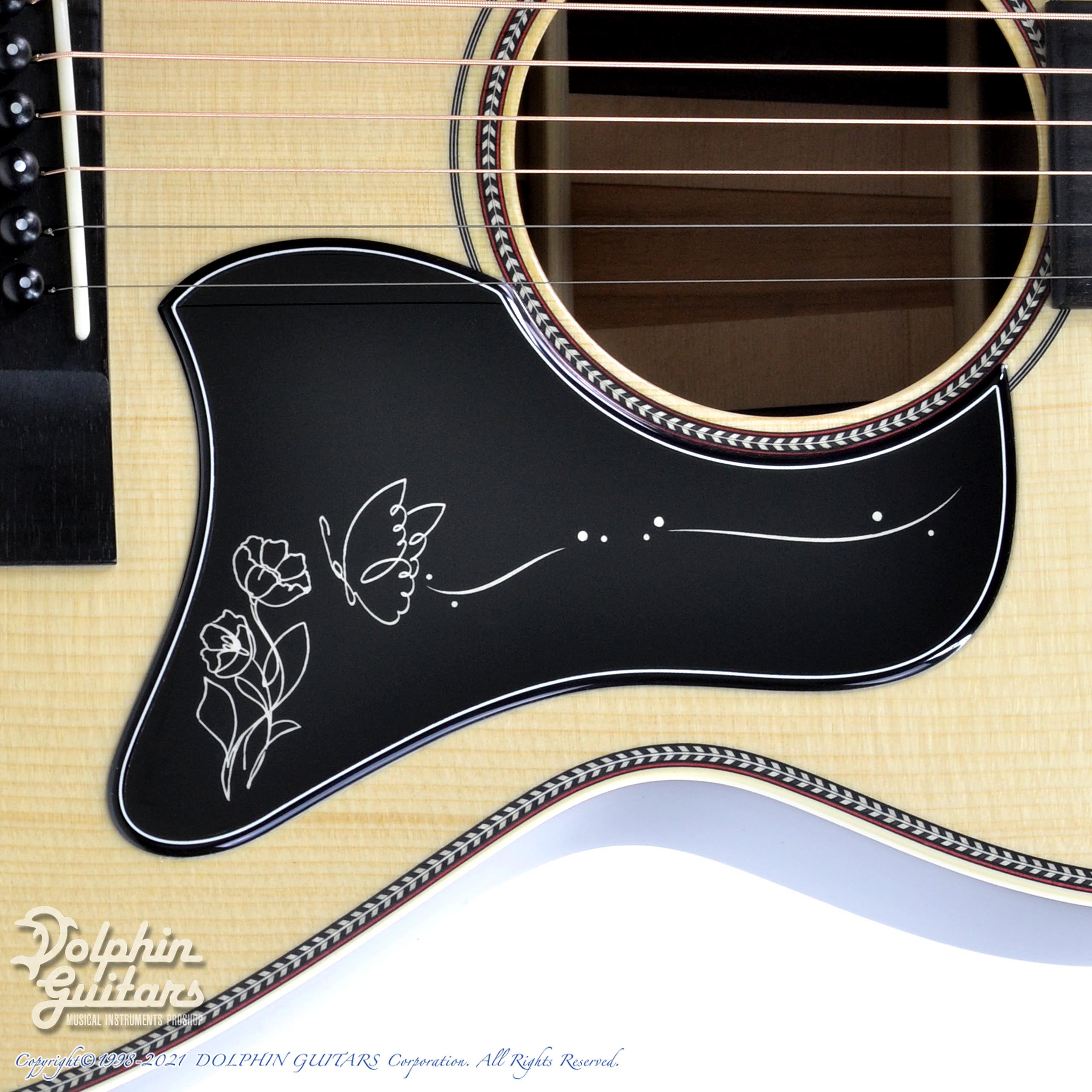 ローズウッドの天神に木に止まっているオオムラサキを3種類の素材を使用して表現しました。白と黒のアクリル材で縁取りを行い、羽の真ん中の部分には白蝶貝を使用しています。白蝶貝の部分のみ紫色から黒に変わるグラデーションにて着色し、最後に手作業で白い斑点を書き込んでいます。光のあたり具合や見る方向によって様々な表情に変化します。通常であればカスタムシリーズで使用する手間のかかる手法ですが、30周年の記念モデルのため飛鳥チームビルドにて実現致しました。木の枝を部分にはバック材と同様に桜材を使用しています。
