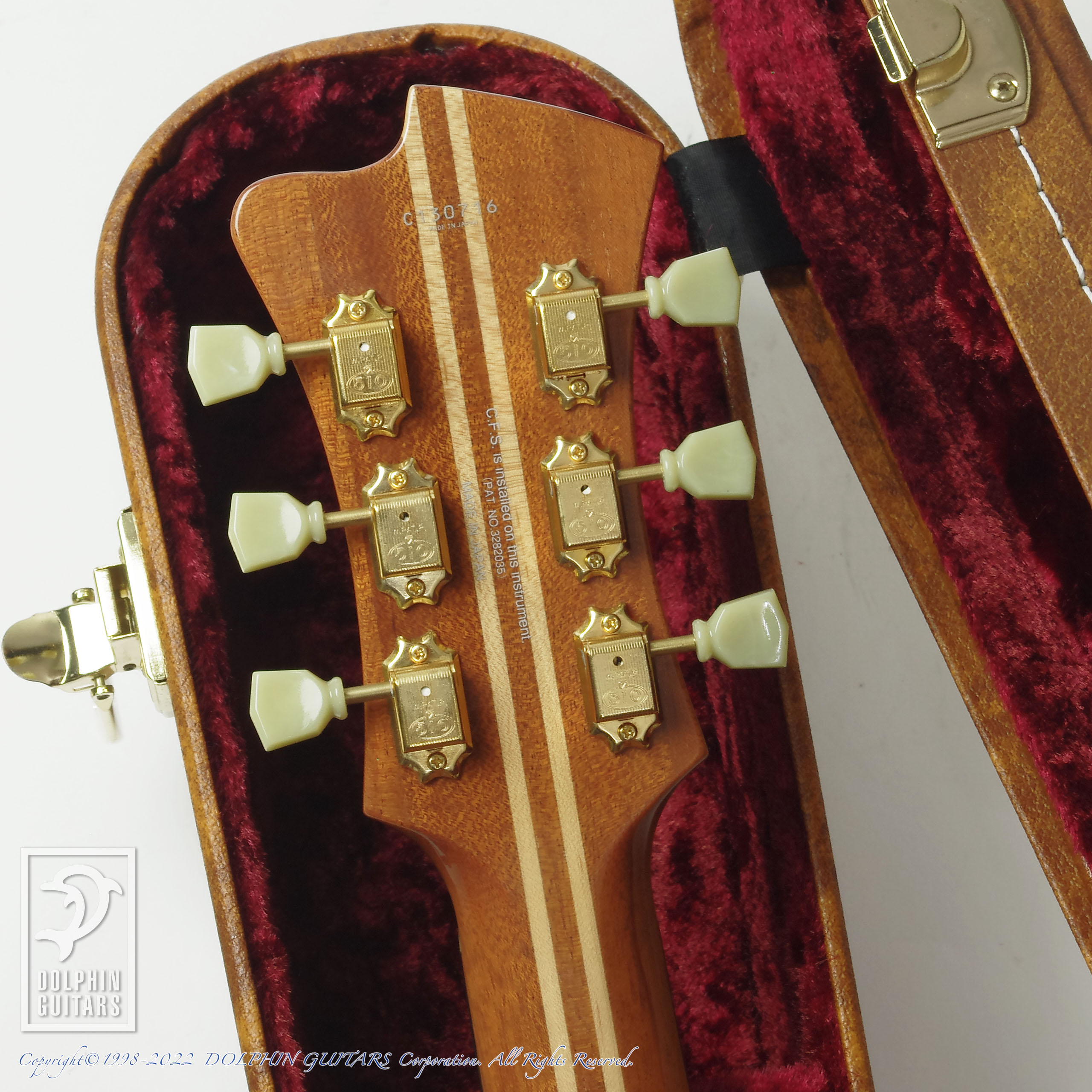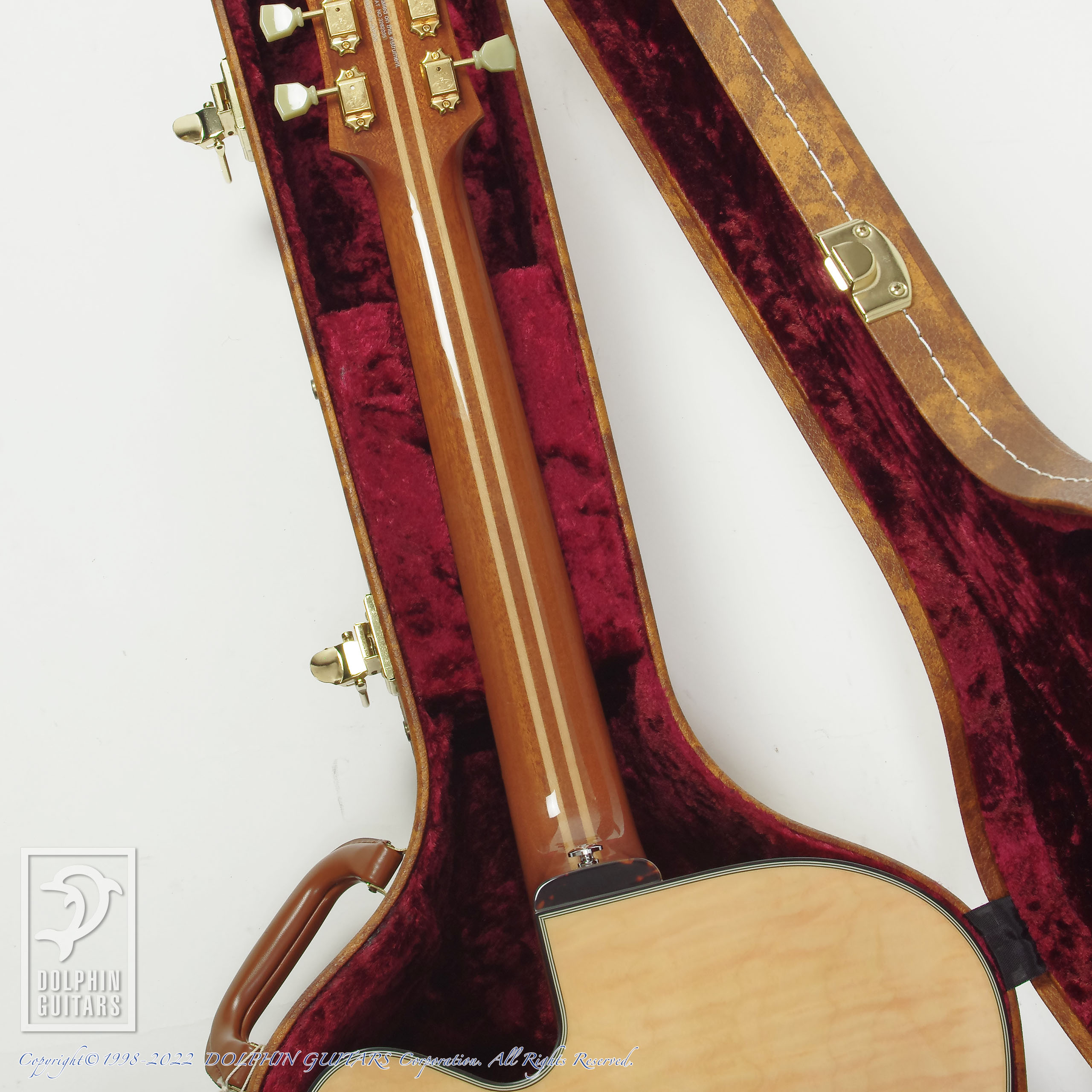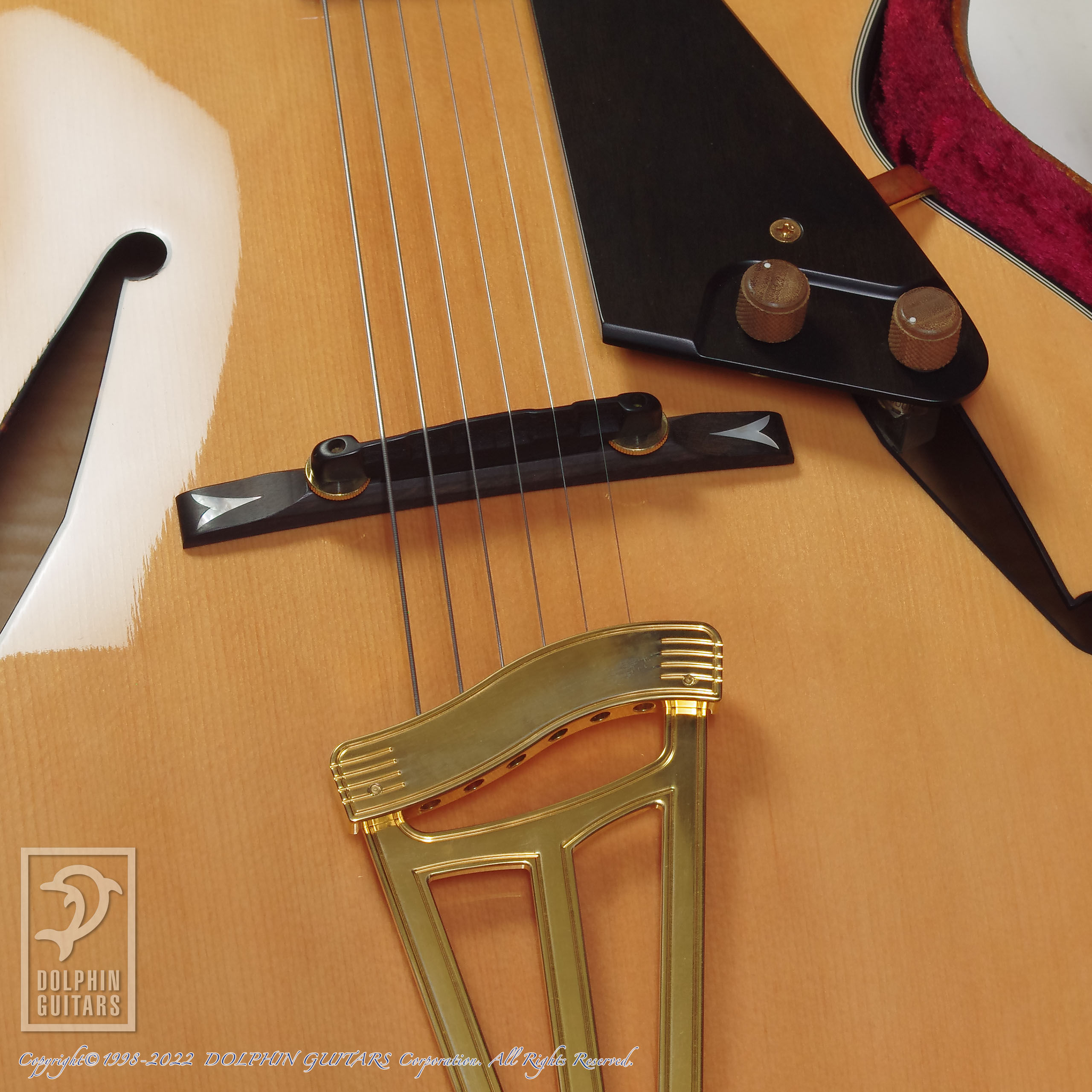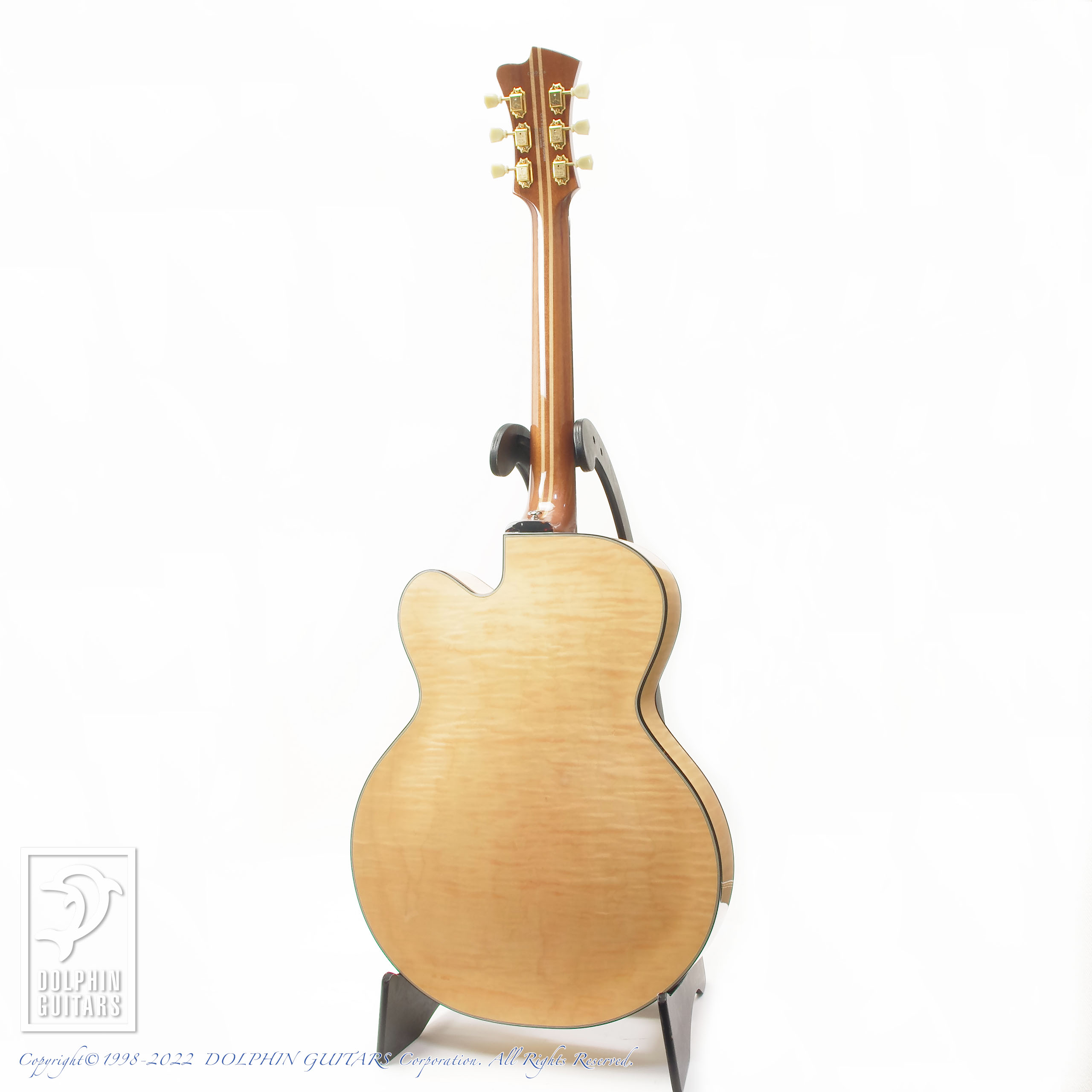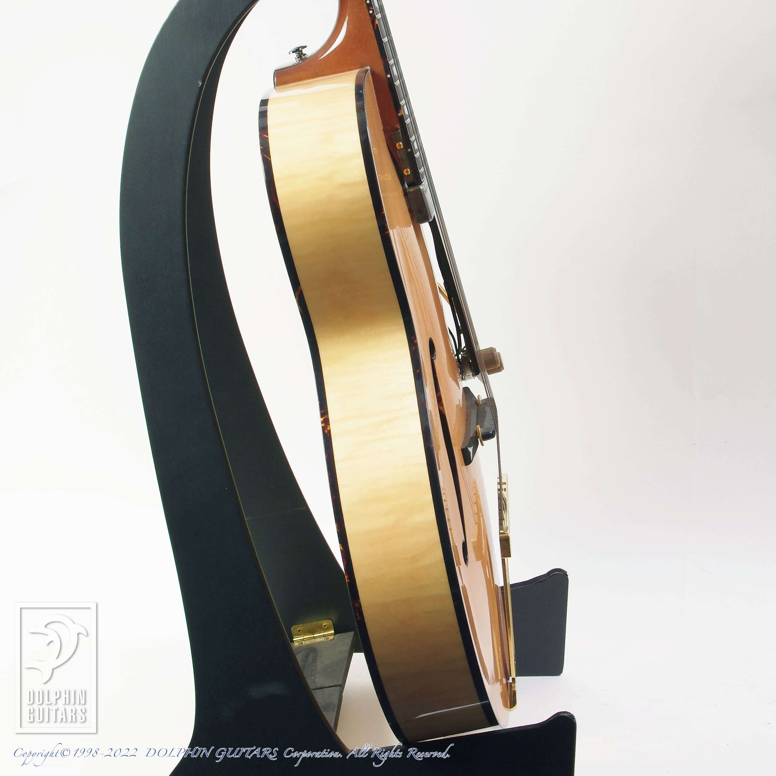 当モデルは、スプルーストップ・カーリーメイプルボディ、エボニー指板、ハムバッキングPU、ナチュラルカラーという組み合わせ。トップ材の響きを最大限に活かすため、ほとんどのハードウェアパーツがボディに穴を開けずに組み込みしております。ピックアップもフローティングタイプのものを採用。フルアコの中でも特に鳴りを大事にしたい、という方にもお勧めです。