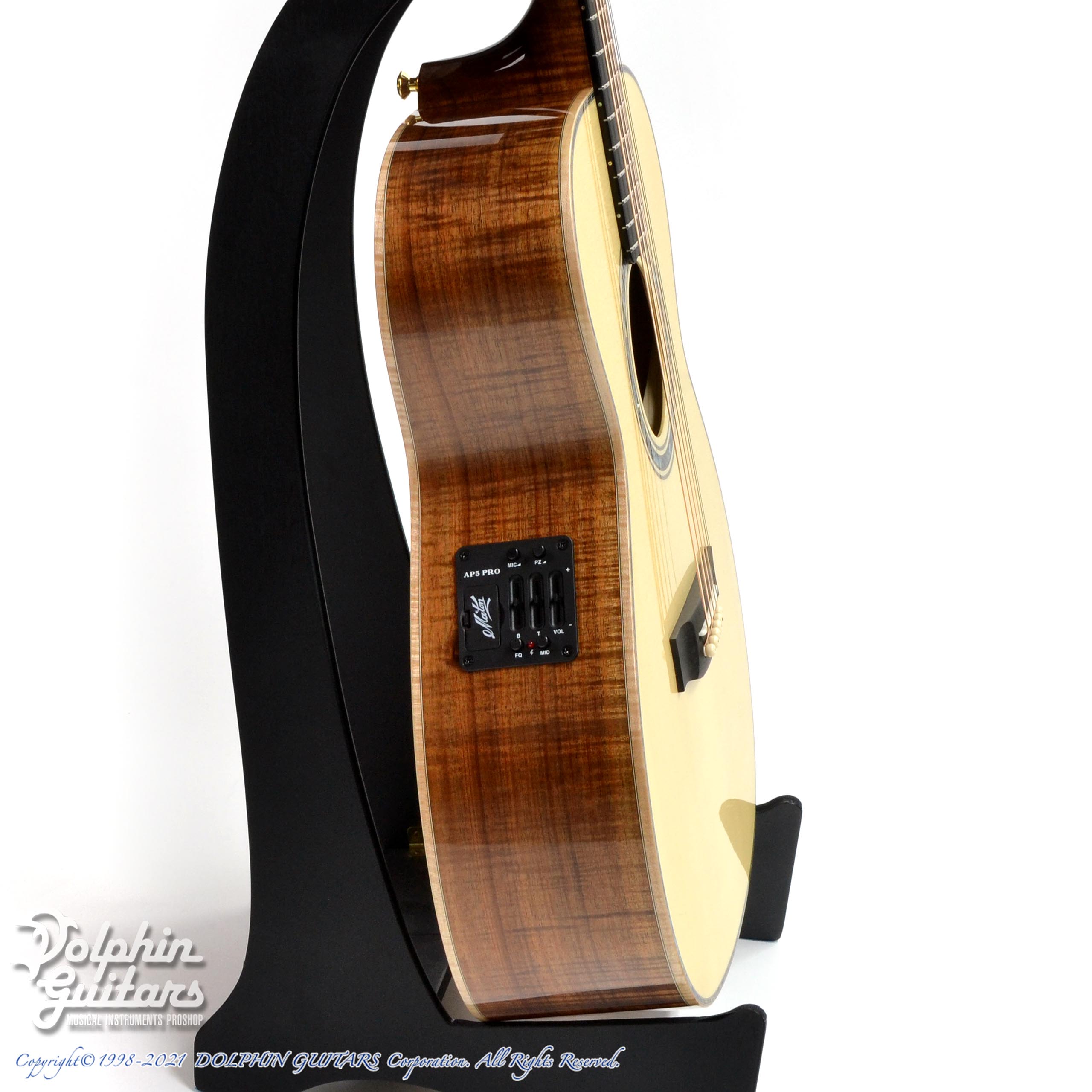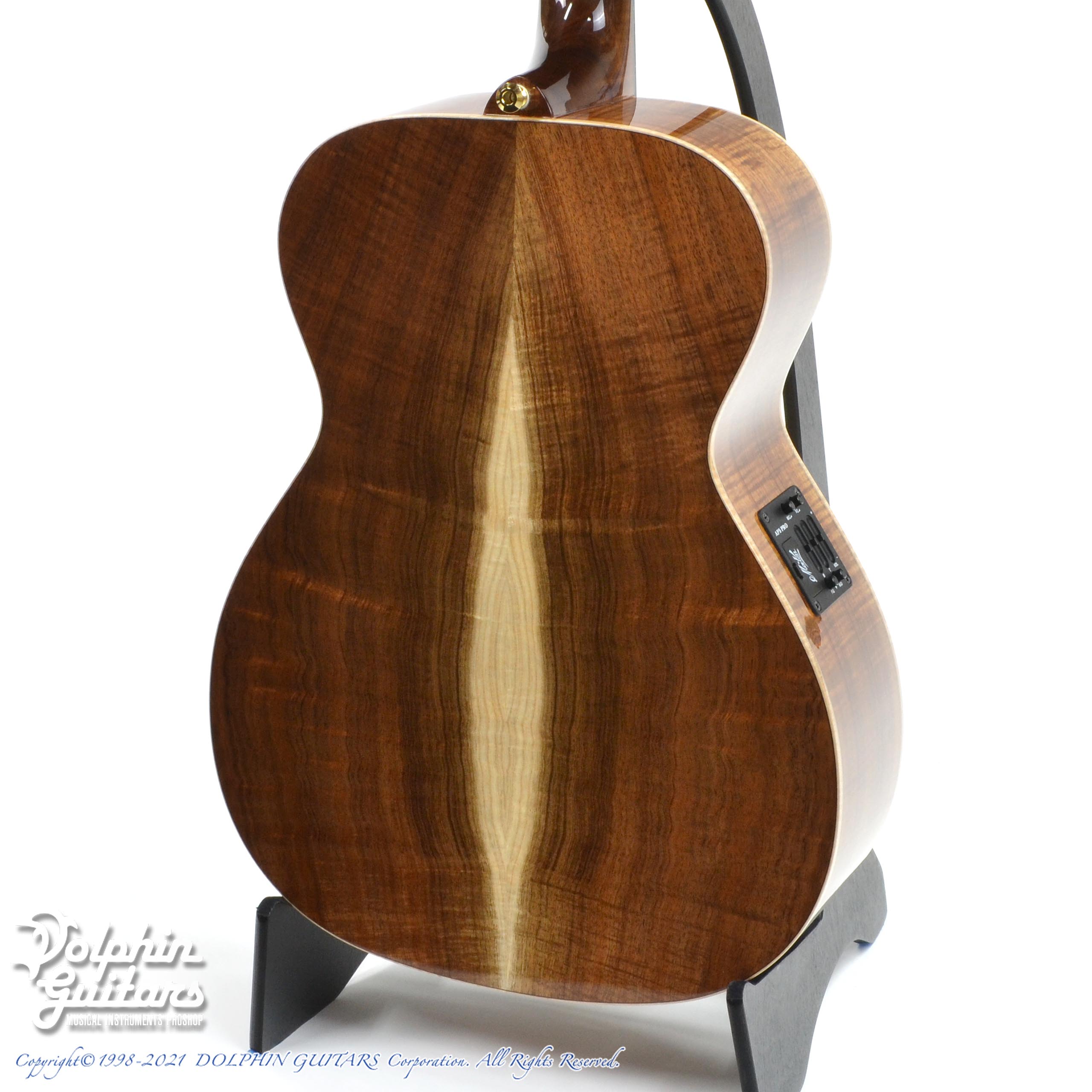 最上級のフィドルバックブラックウッドは反響も素晴らしく、天然のリバーブが感じられる芳醇な響きです。音色はかなりクリアで、ストローク時の清涼感が気持ち良いです。木目・色合いは一見ハワイアンコアに見えるこの材は、同じ"アカシア属"であります。見た目は極似でもサウンドニュアンスは異なります、ブラックウッドの方がローミッドに厚みを感じるサウンドです。