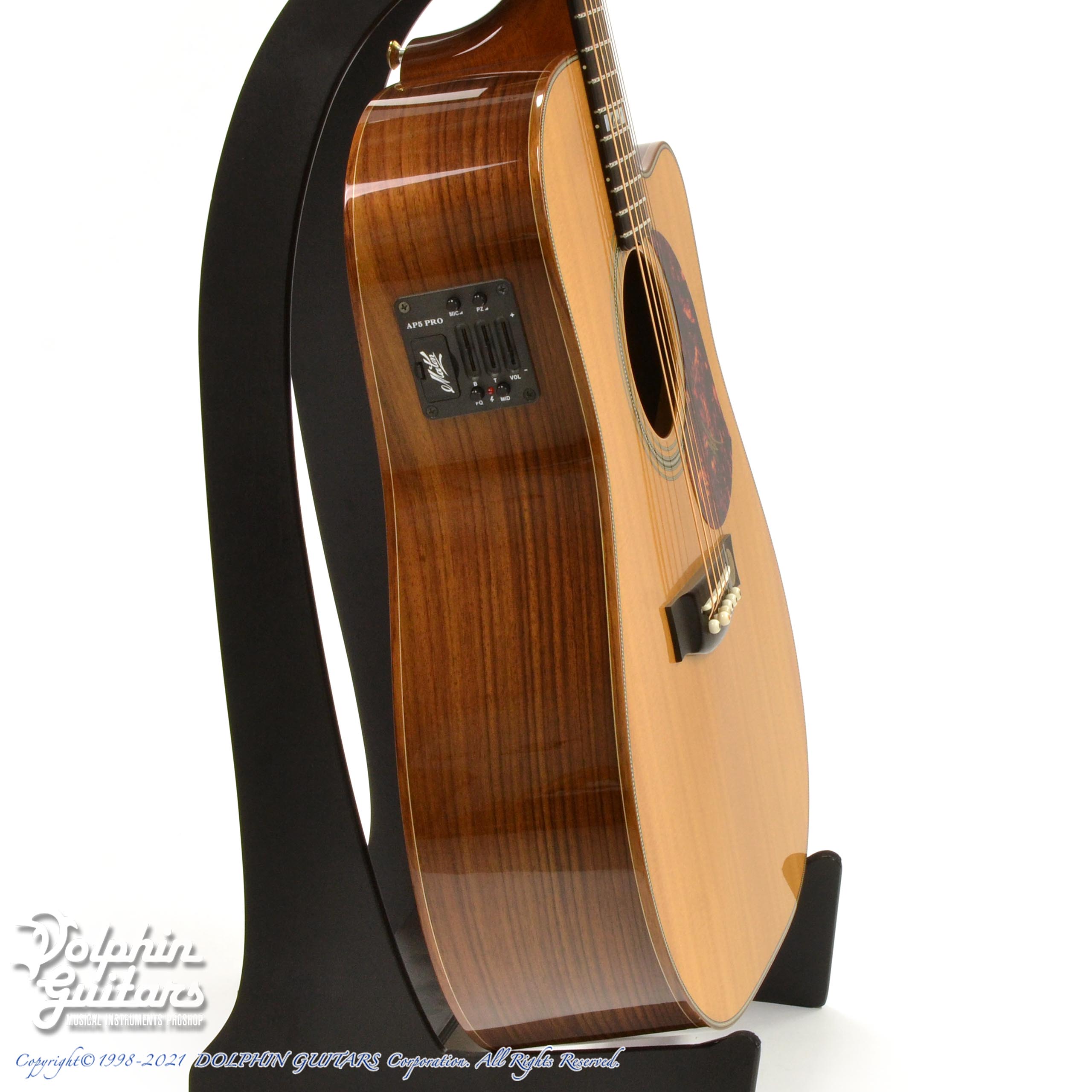 AAAシトカ・スプルーストップ、インディアン・ローズウッドS&B、スキャロップドXブレイス、マホガニーネック(アジャスタブルロッド)、エボニー指板&ブリッジ、グローバーペグ、ハイグロスフィニッシュ、AP5-Proピックアップ・システム。