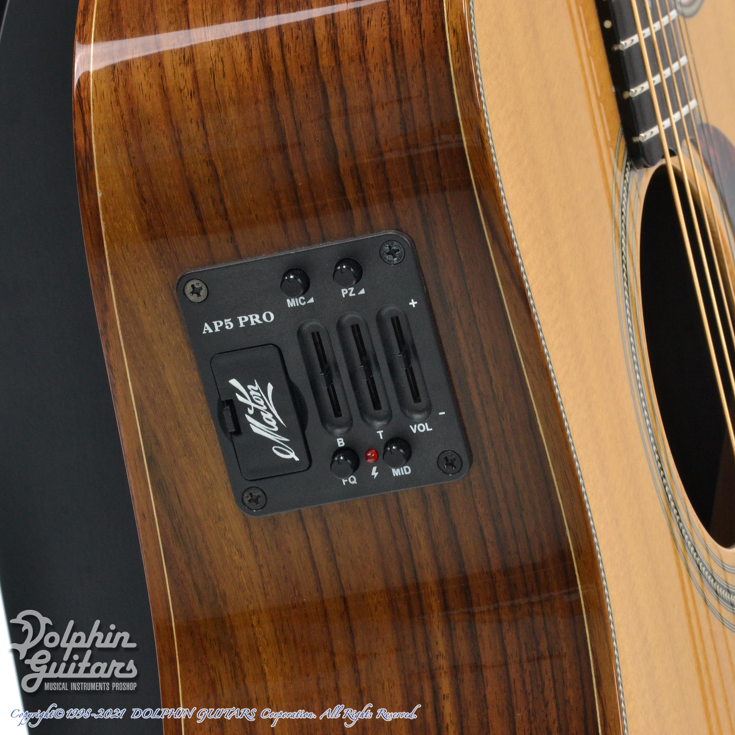 メイトン社オリジナルPUシステム"AP5-Pro"(ピエゾ+マイク)はダイナミクスレンジが広く、パワフルなサウンドを出力し、コンデンサーマイクからの集音はピッキングニュアンスを余すことなく表現します。