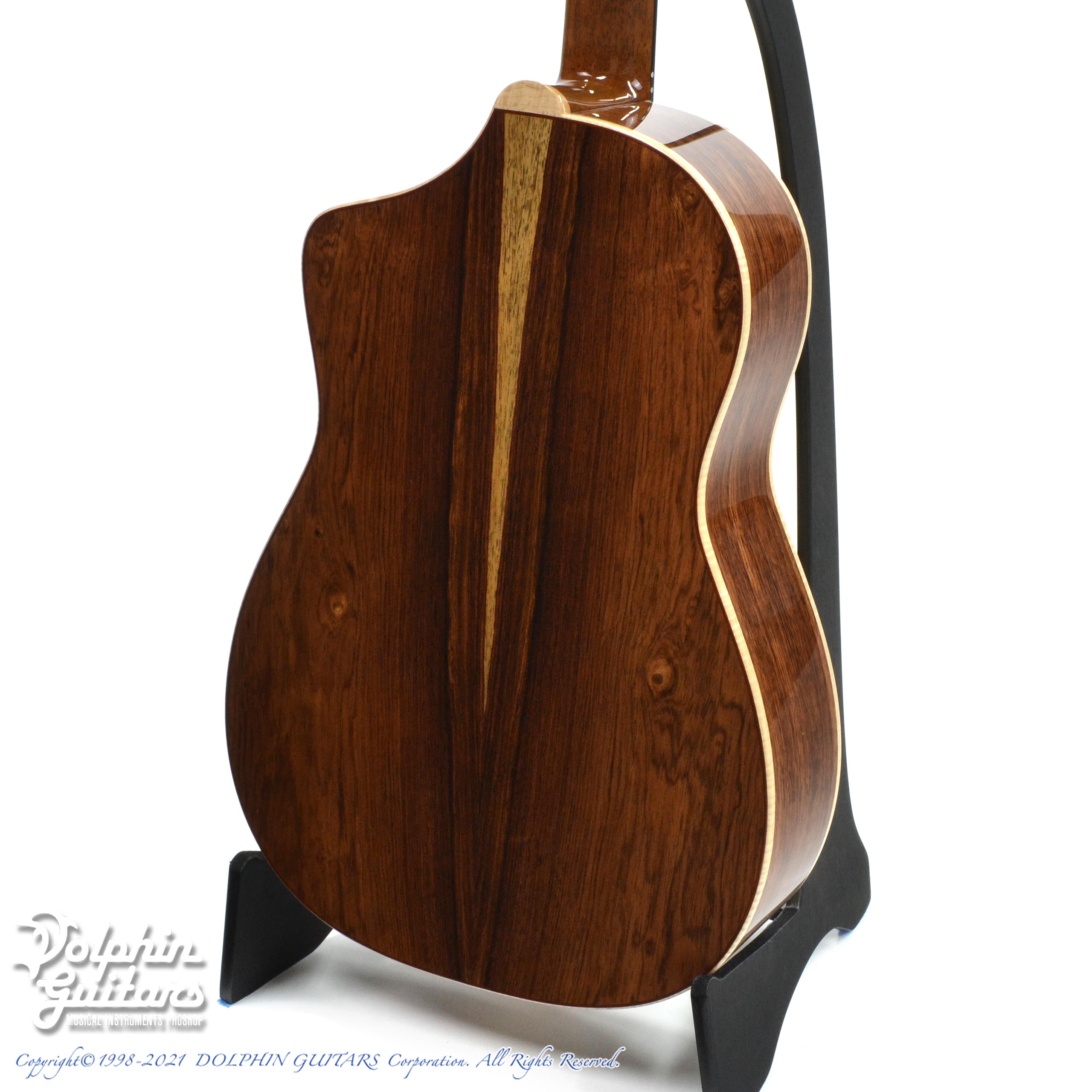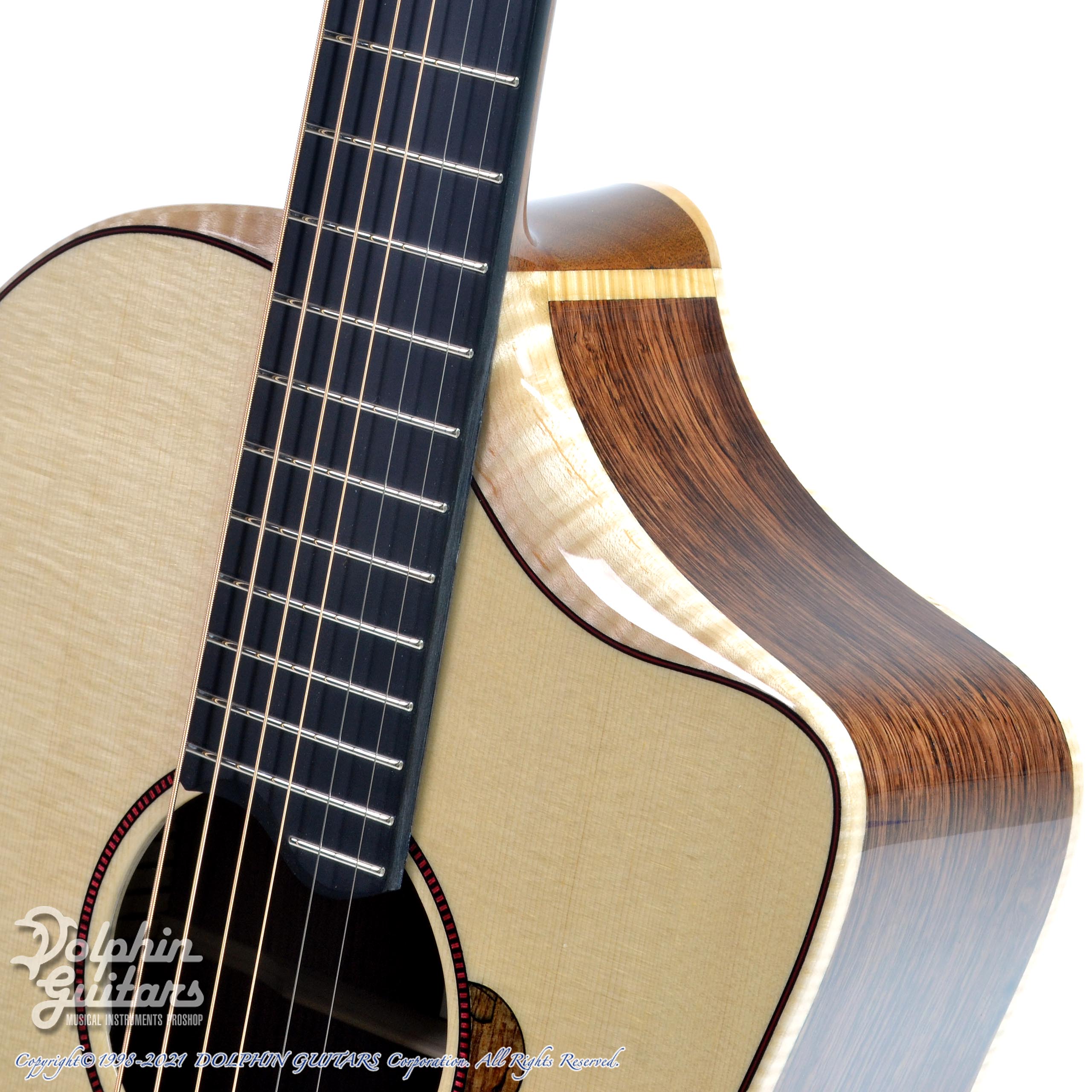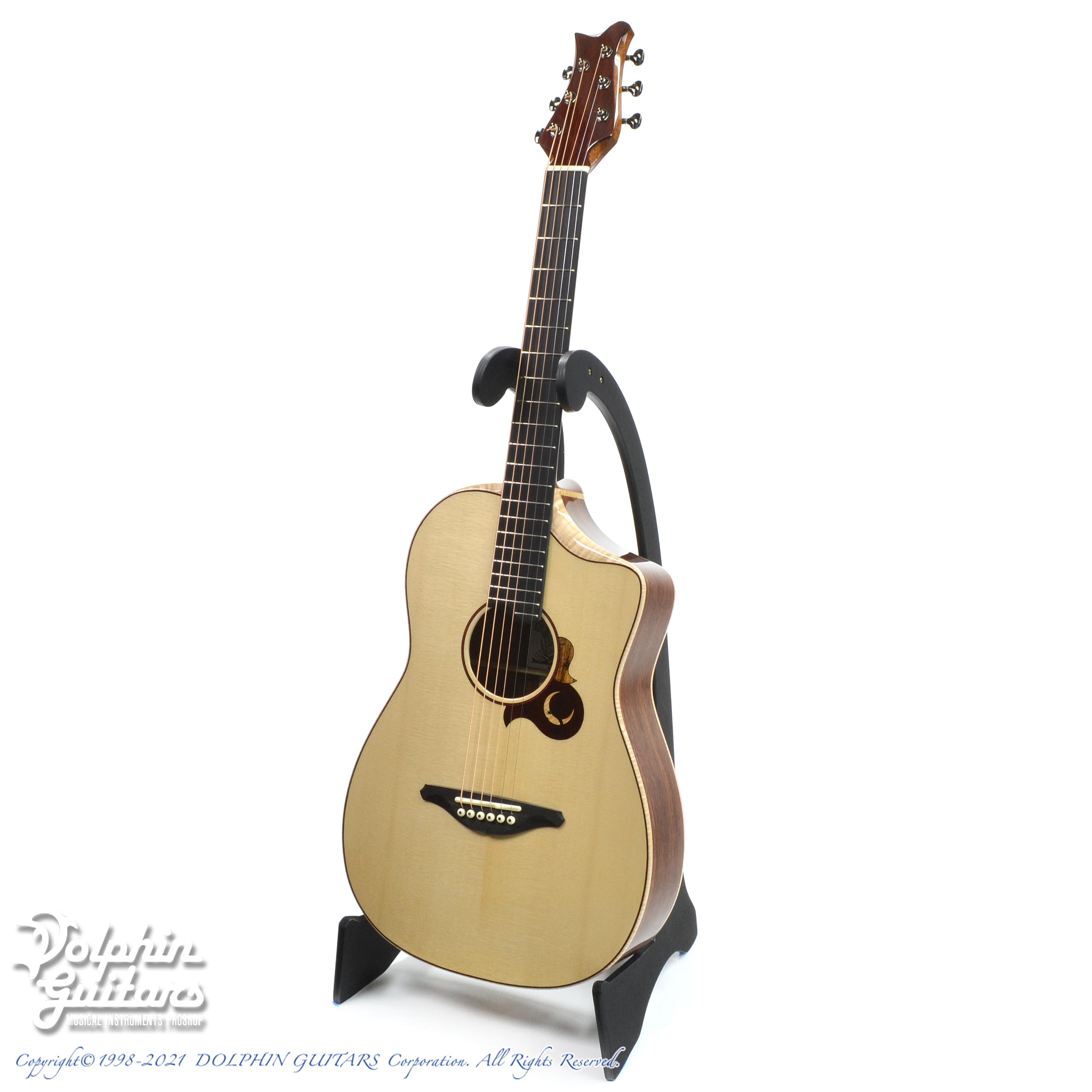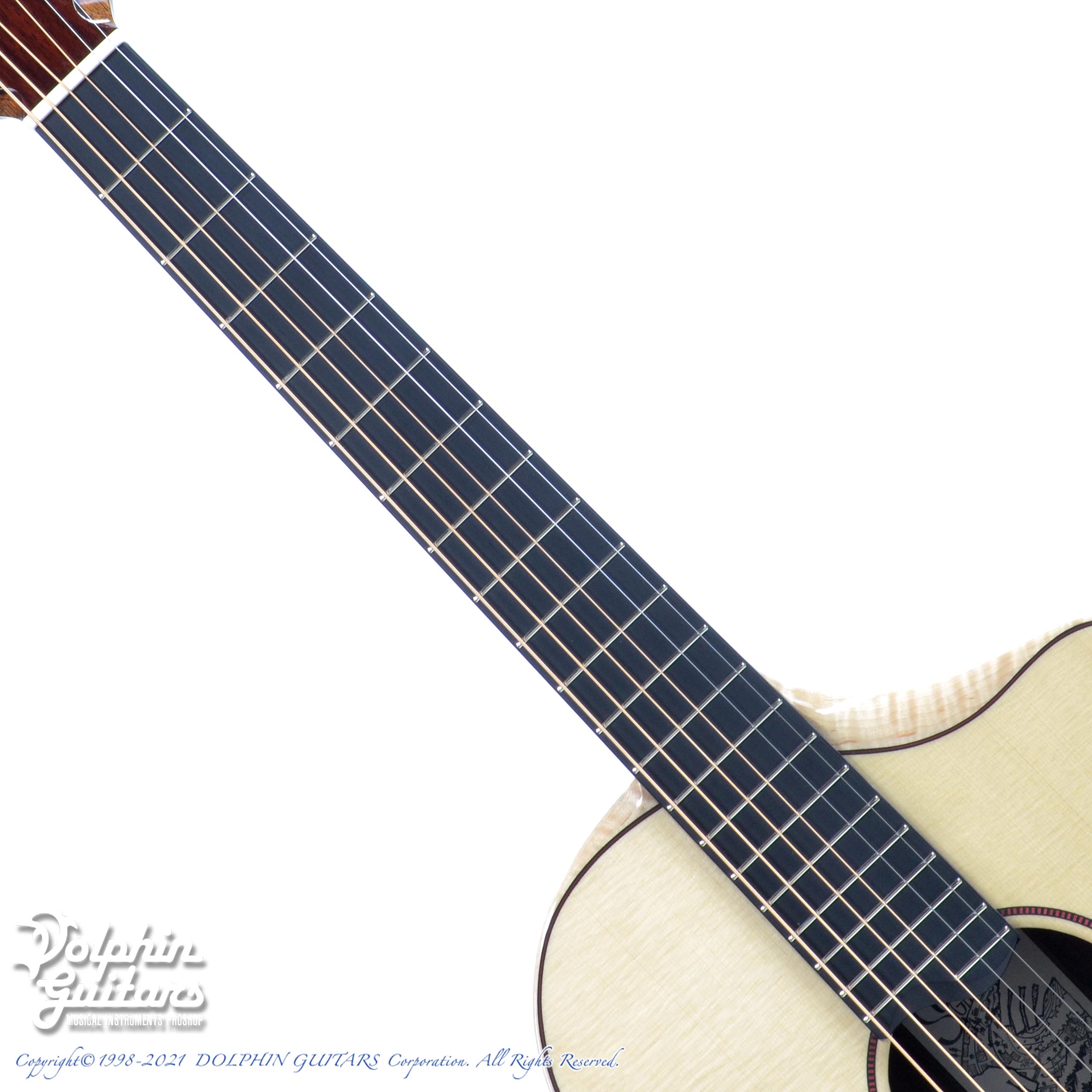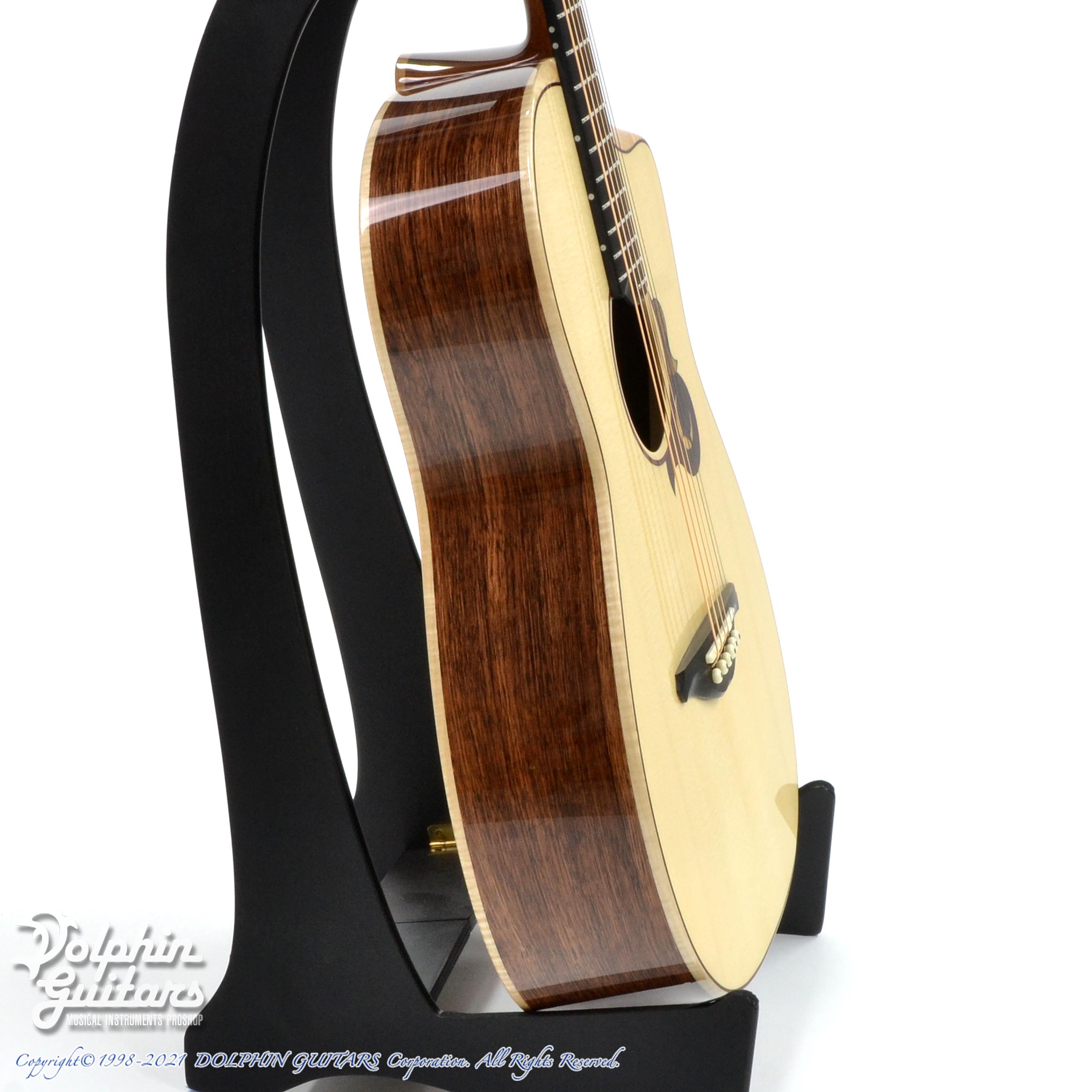 ジャーマン・スプルーストップ、ホンジュラス・ローズウッドS&B、ホンジュラス・マホガニーネック、エボニー指板&駒、ヒールレス・ネックジョイント、フレイムメイプル・バインディング、ナロー・カッタウェイ、スポルテッドメイプル×パドックによるビルトイン・ピックガード、Gotoh510ペグ。