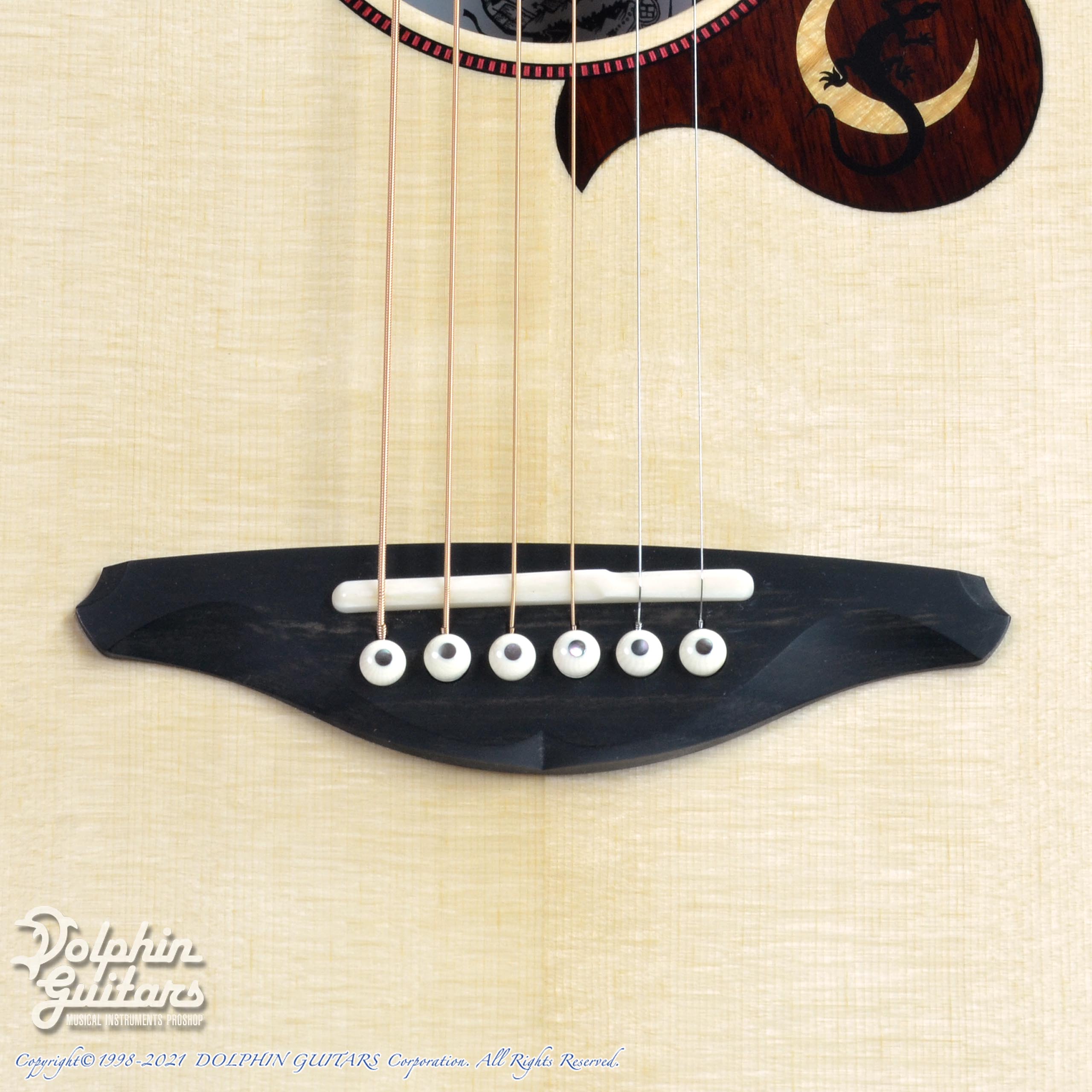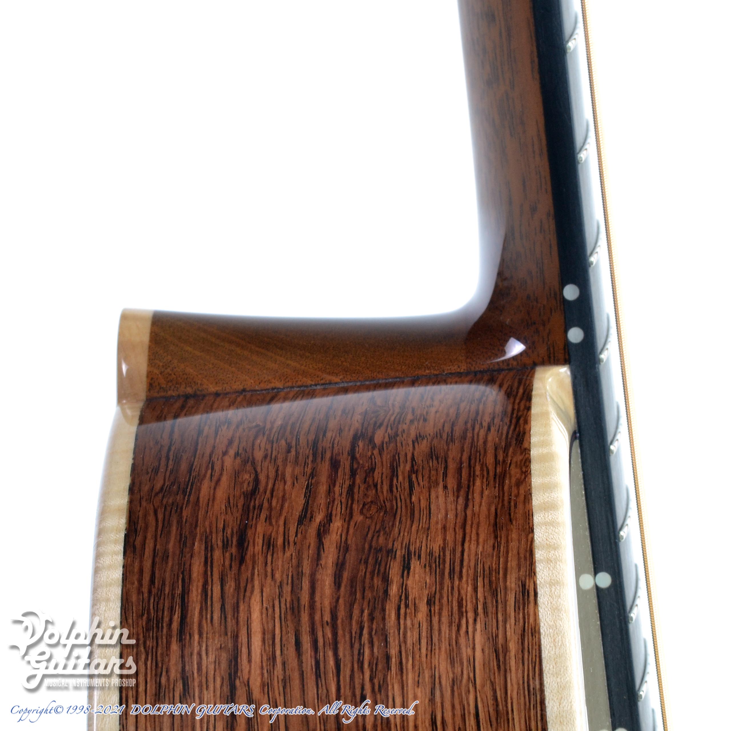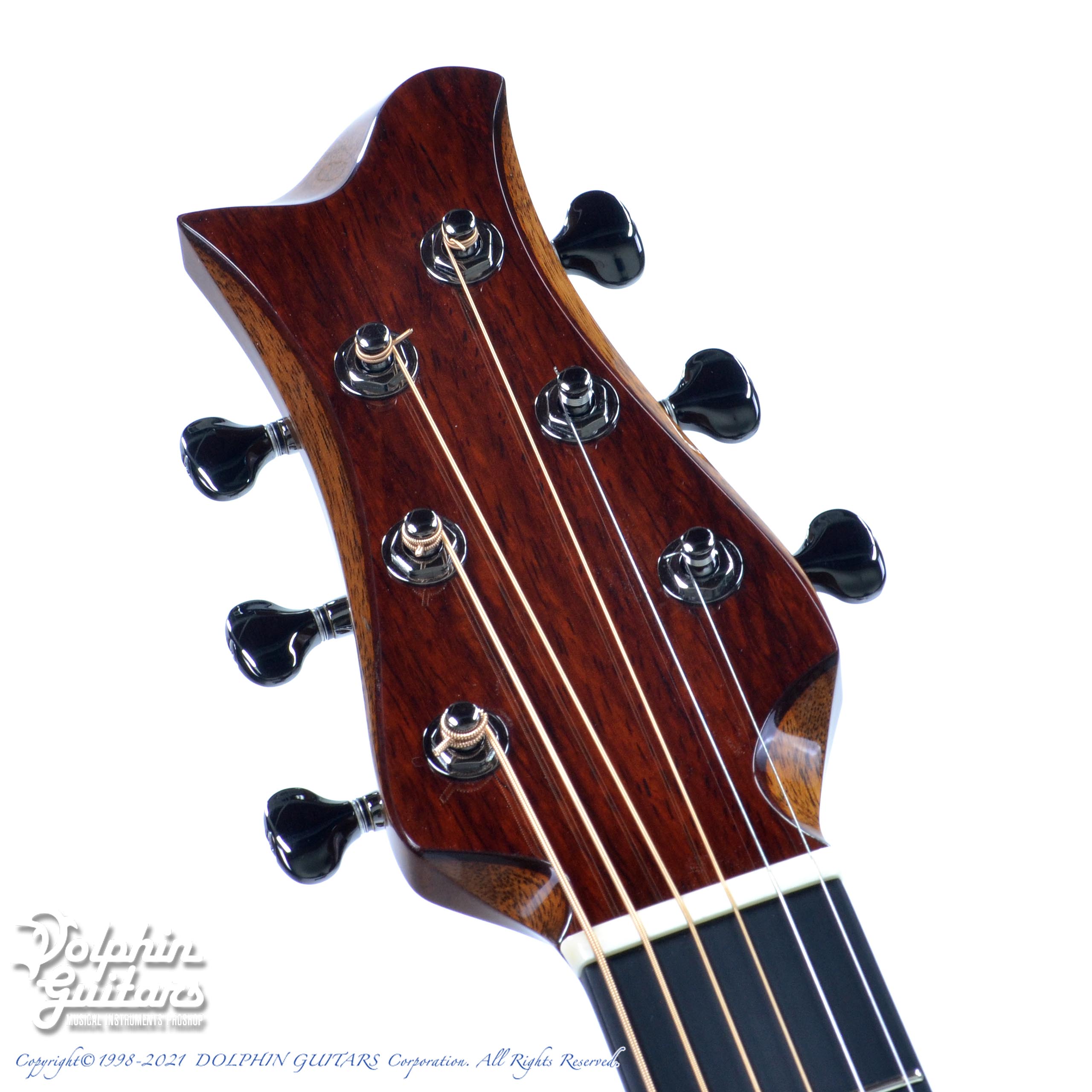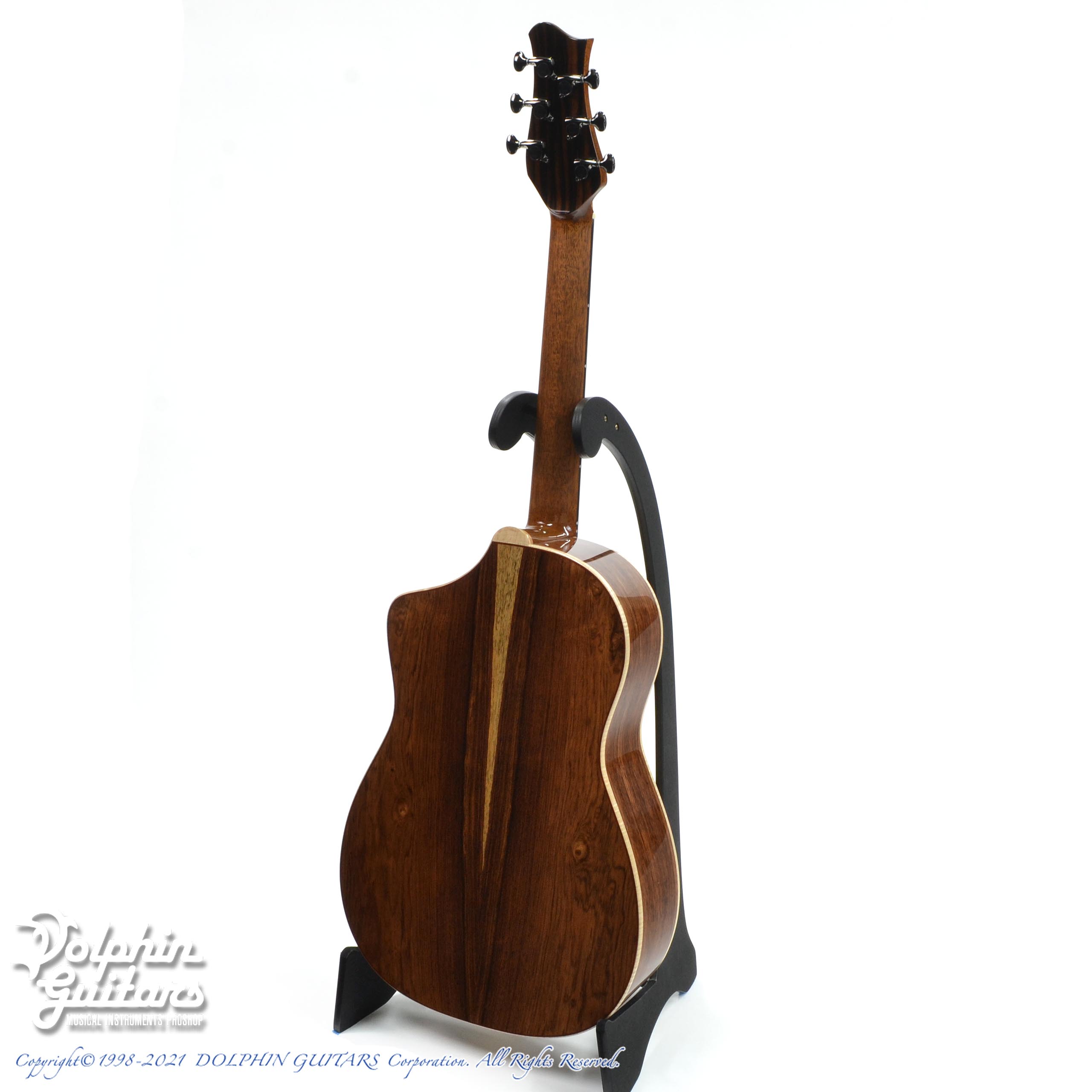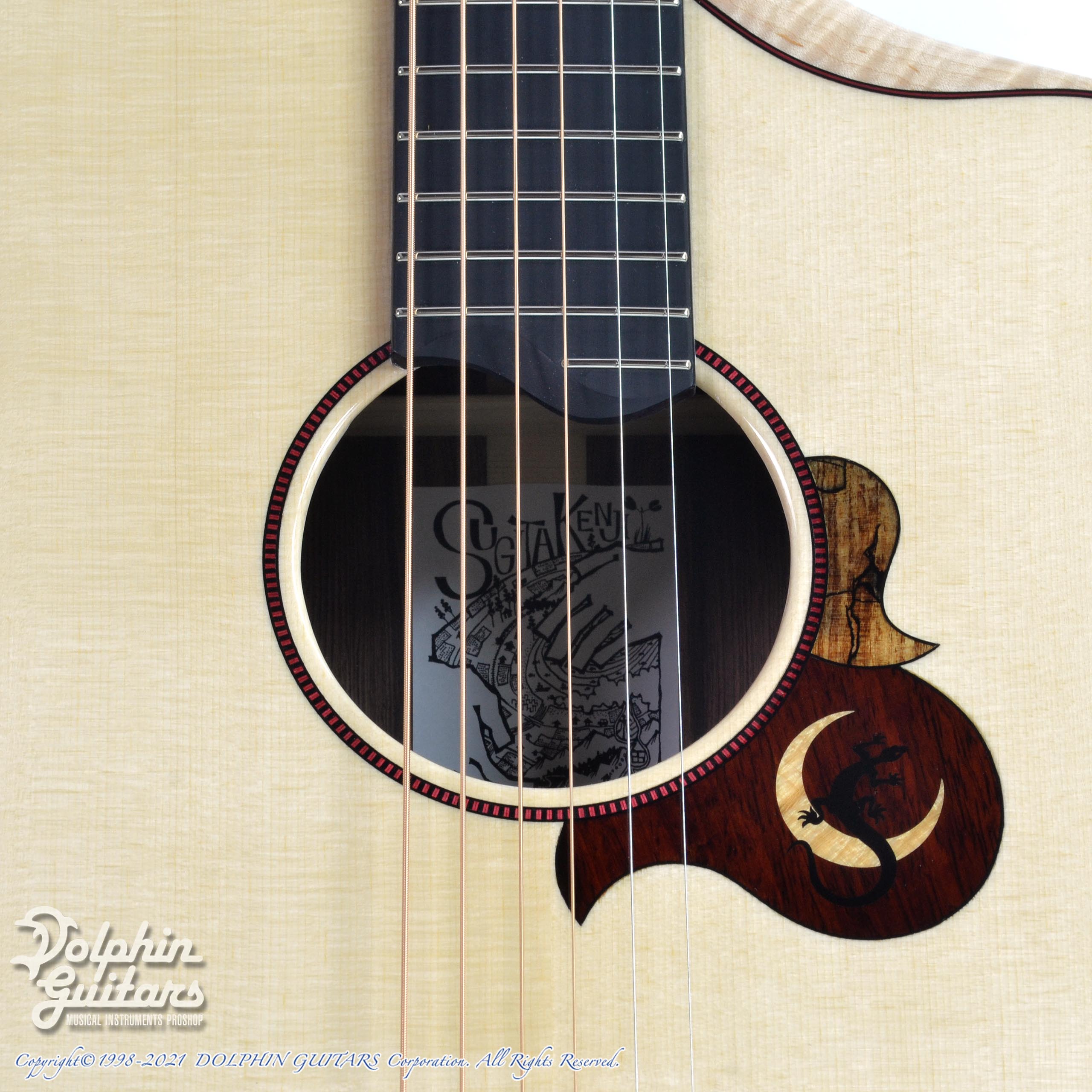 ジャーマン・スプルーストップ、ホンジュラス・ローズウッドS&B、ホンジュラス・マホガニーネック、エボニー指板&駒、ヒールレス・ネックジョイント、フレイムメイプル・バインディング、ナロー・カッタウェイ、スポルテッドメイプル×パドックによるビルトイン・ピックガード、Gotoh510ペグ。