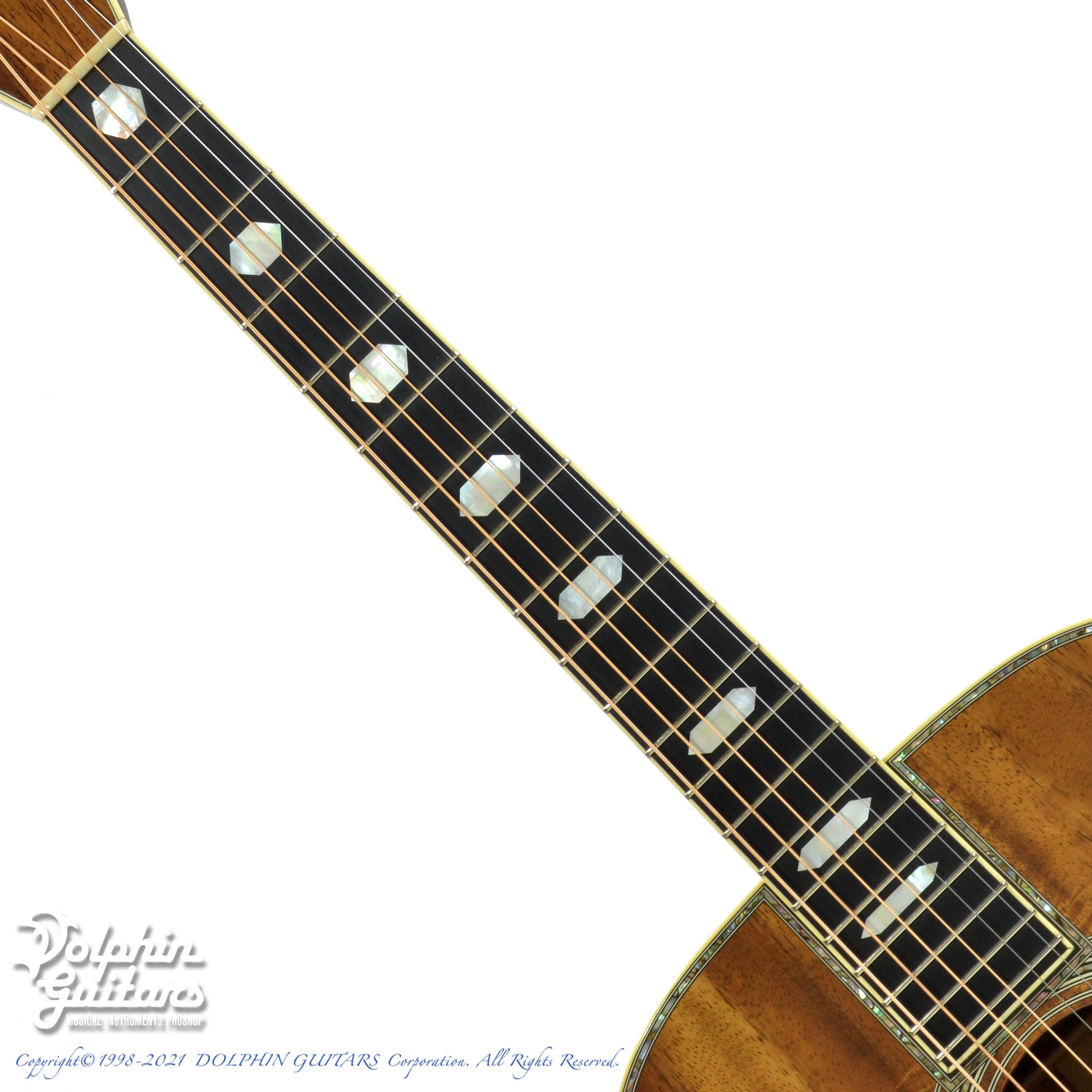 フィギャード・ハワイアンコア・ボディ、ノンスキャロップXブレーシング、ハイドグルーコンプリート仕様(ニカワ接着)、マホガニー・SQネック(フルシックネスVシェイプ)、エボニー指板&ブリッジ、MOPヘキサゴン指板インレイ、42.86mmナット、ブラックPG、グローヴァーペグ仕様。