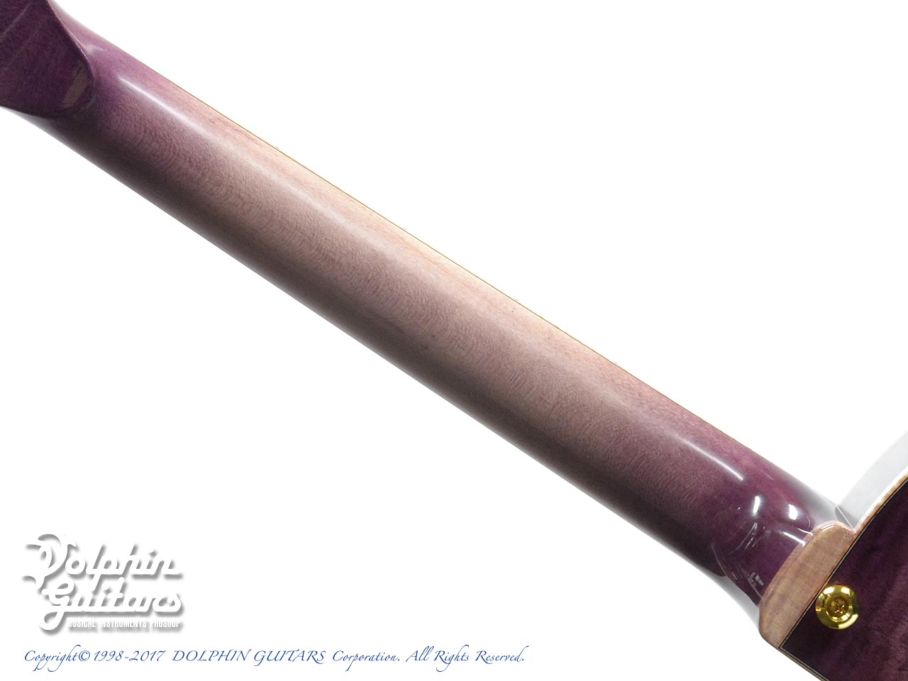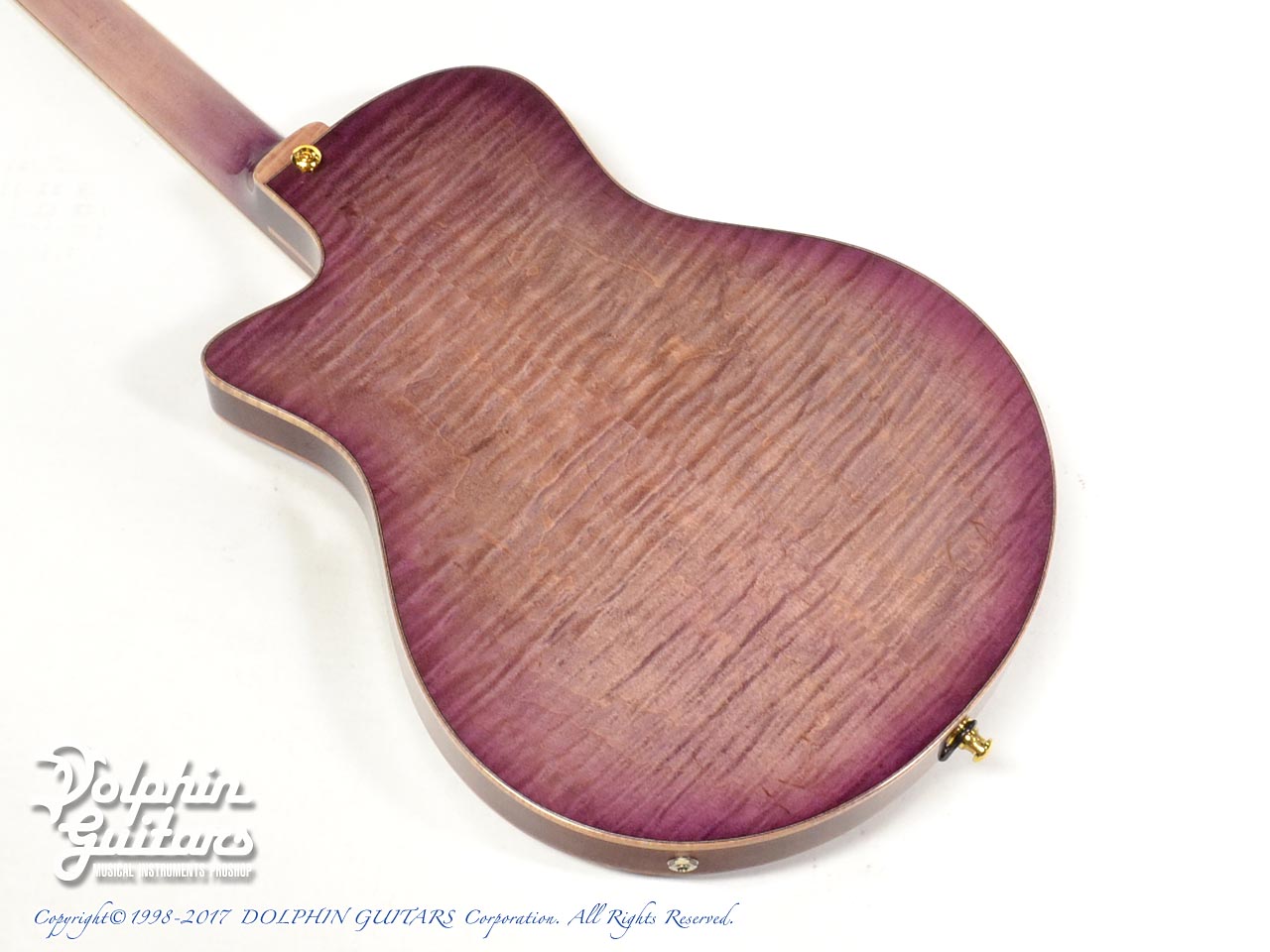 本器のカラー名は"Murasaki"。ボディからネックまで深みのある淡い紫のバーストが妖艶に輝き、カーリーメイプルで縁取られたカーヴドボディは工芸品の雰囲気を持っております。指板ポジションはジリコーテのサップウッドを巧みに配しております。