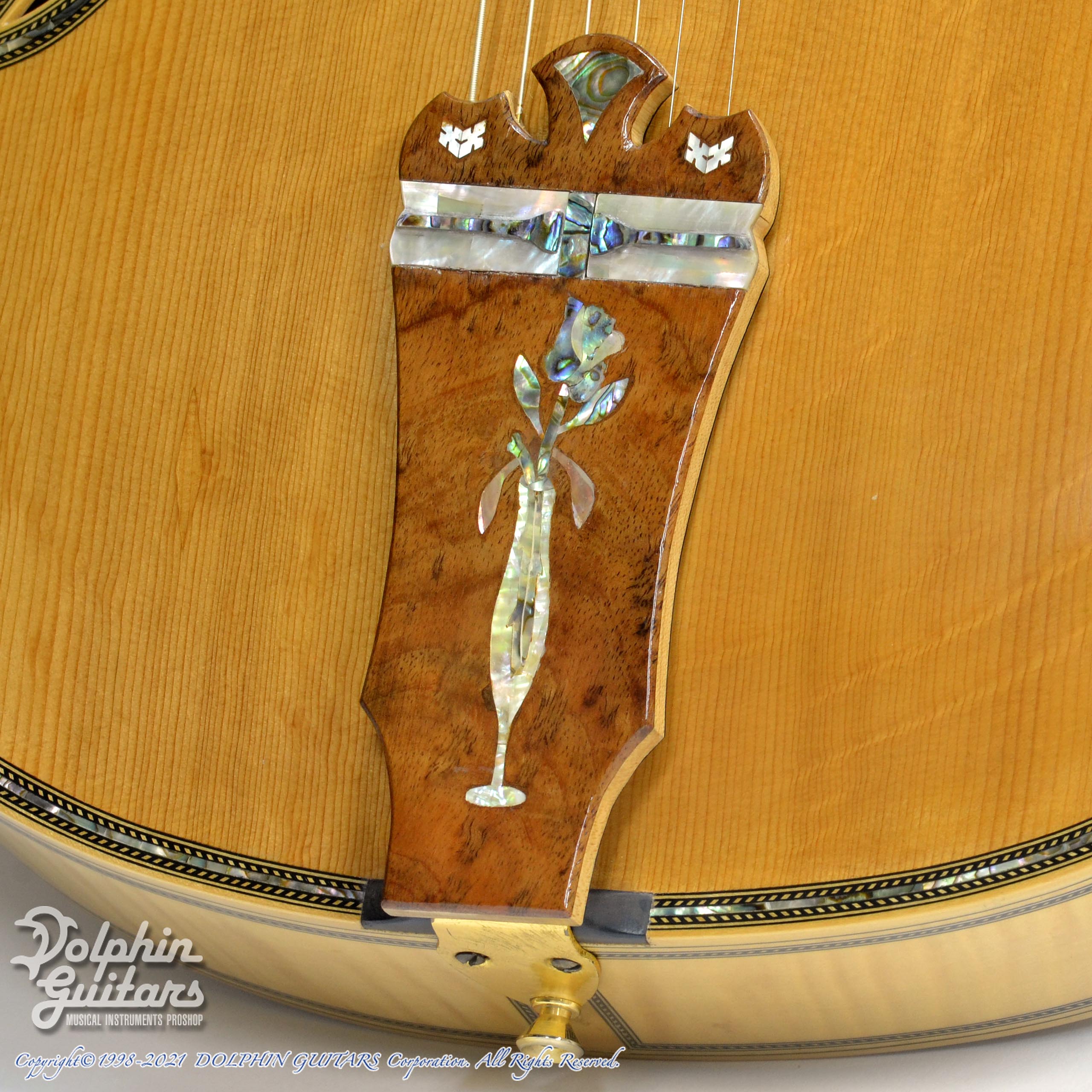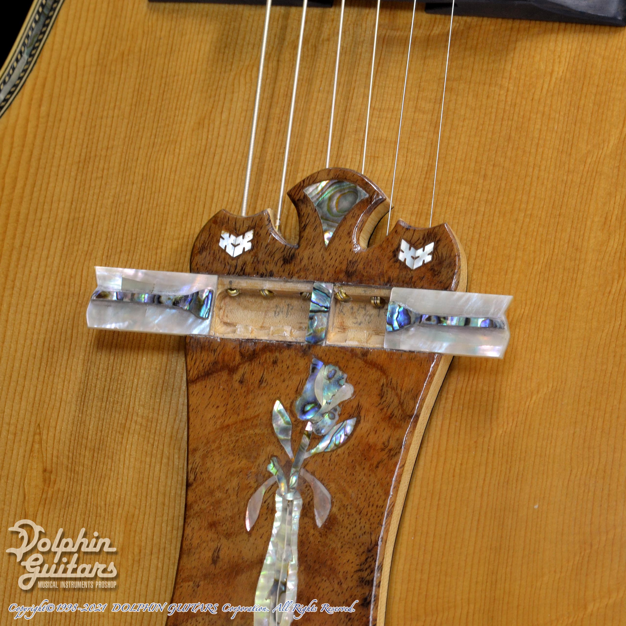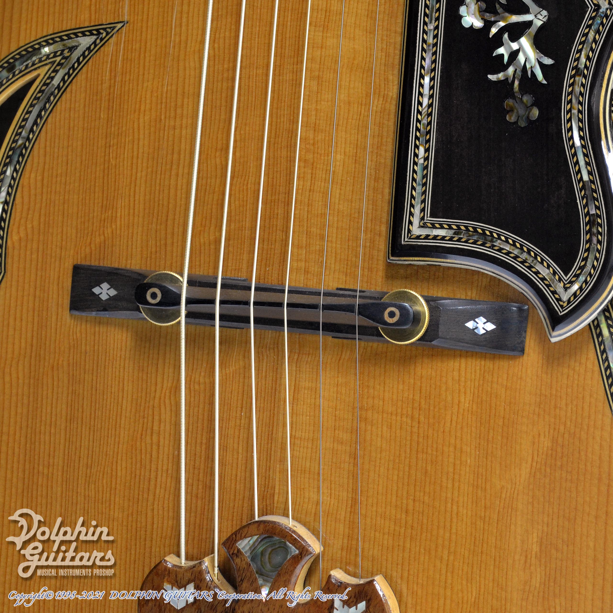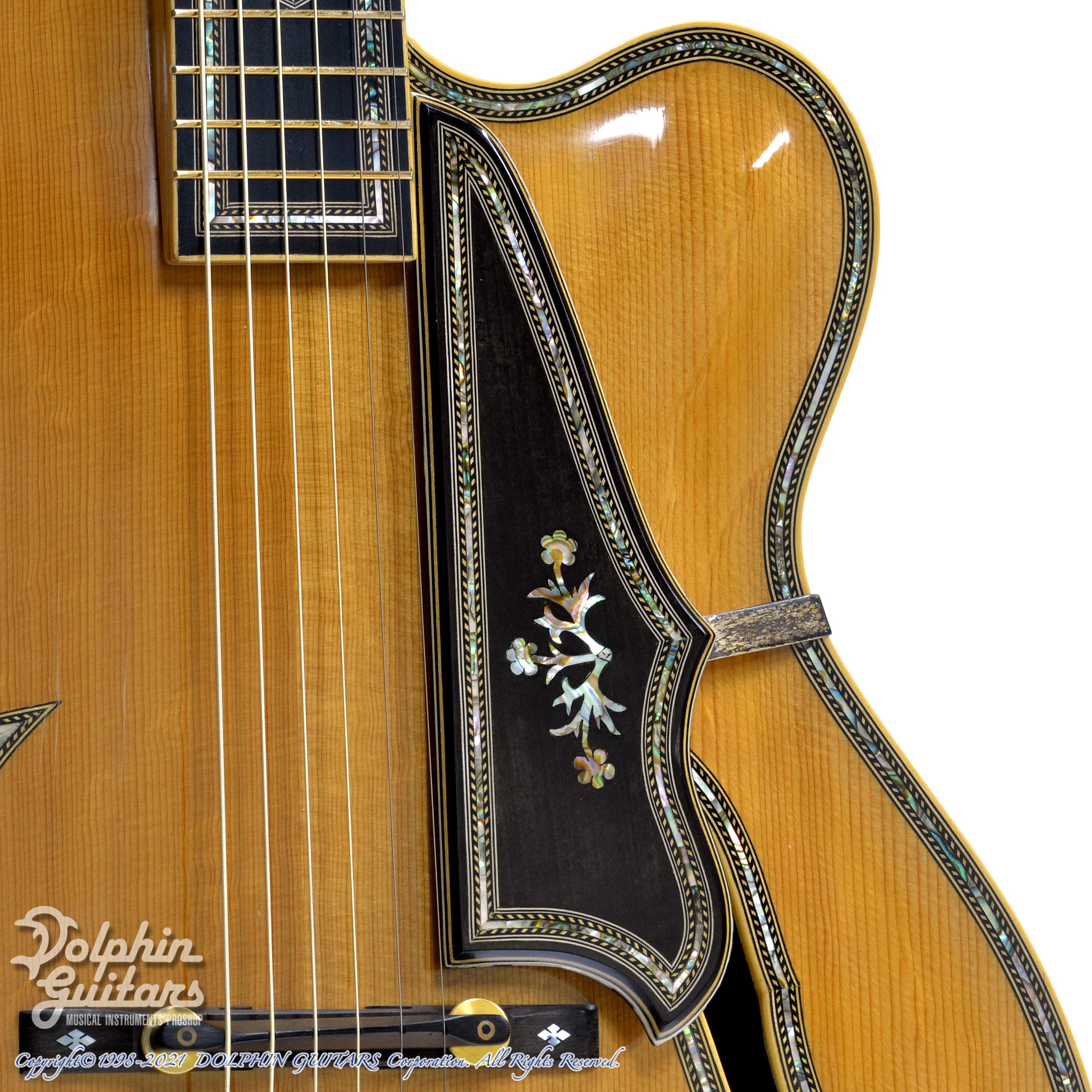 所狭しと入れられた豪華で独特な雰囲気を持つインレイはもちろん、迫力のあるテイルピースやリカーブの特徴的なグラマラスなアーチ形状など、恰も工芸品として製作されたと錯覚してしまうほどの美しさに息を飲んでしまいます。