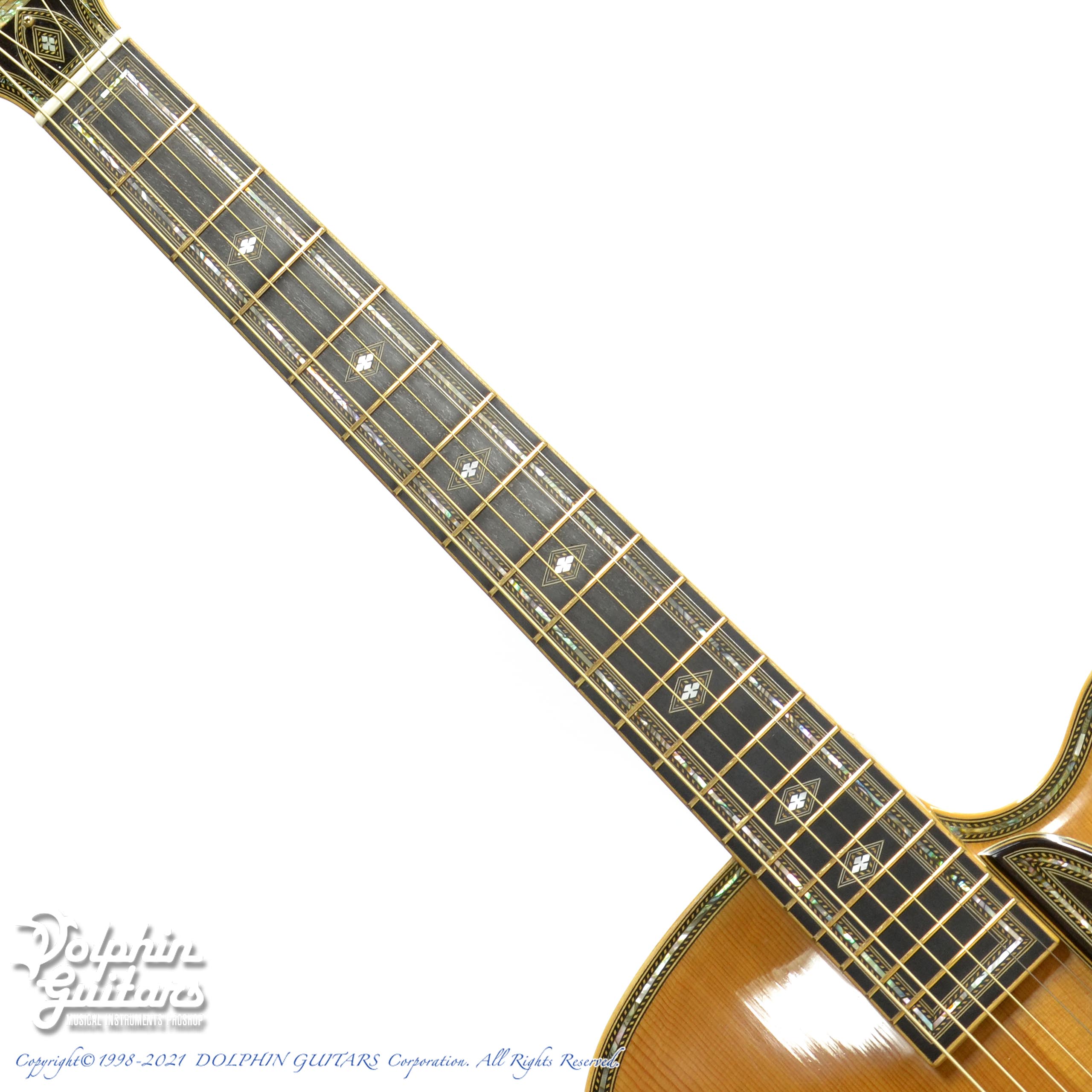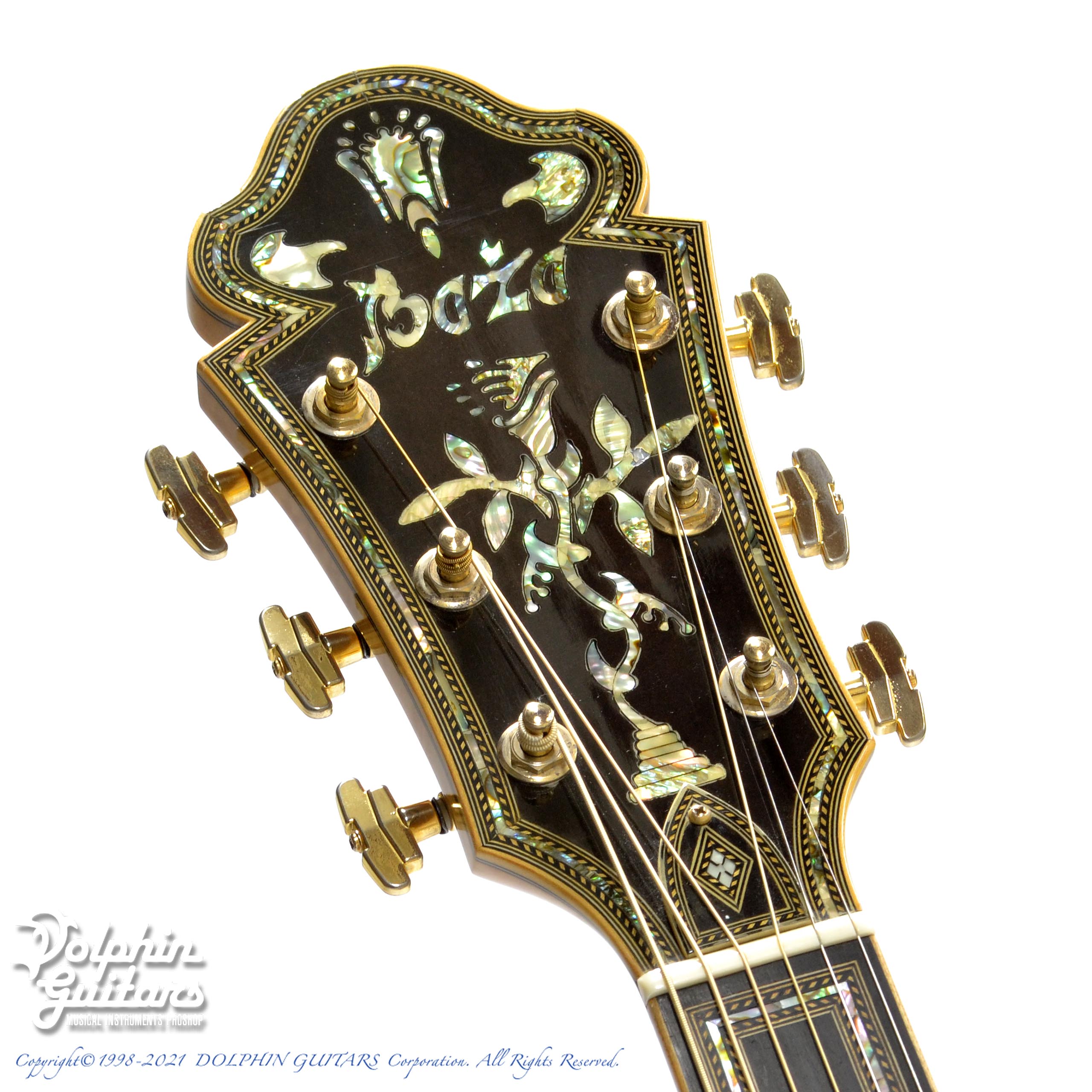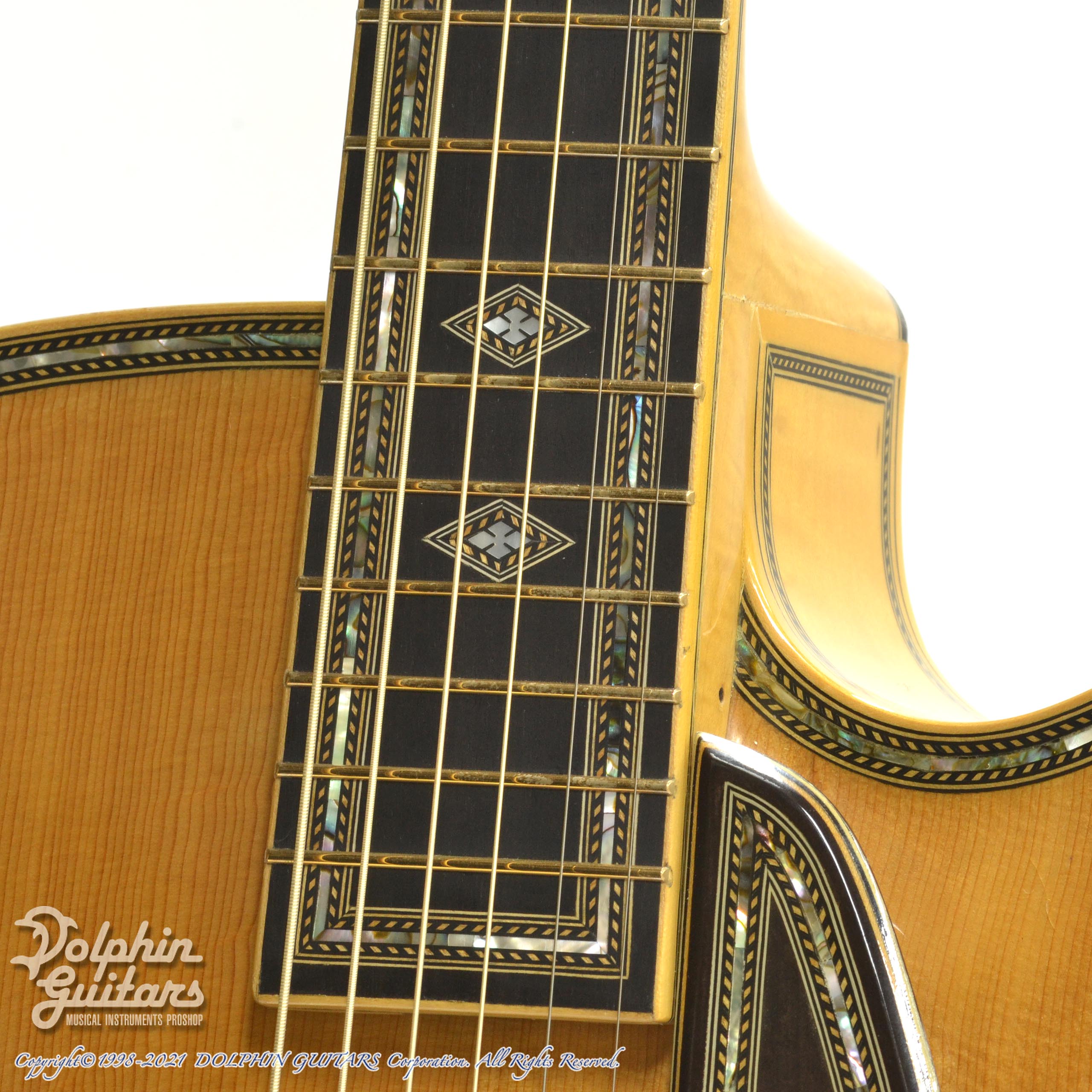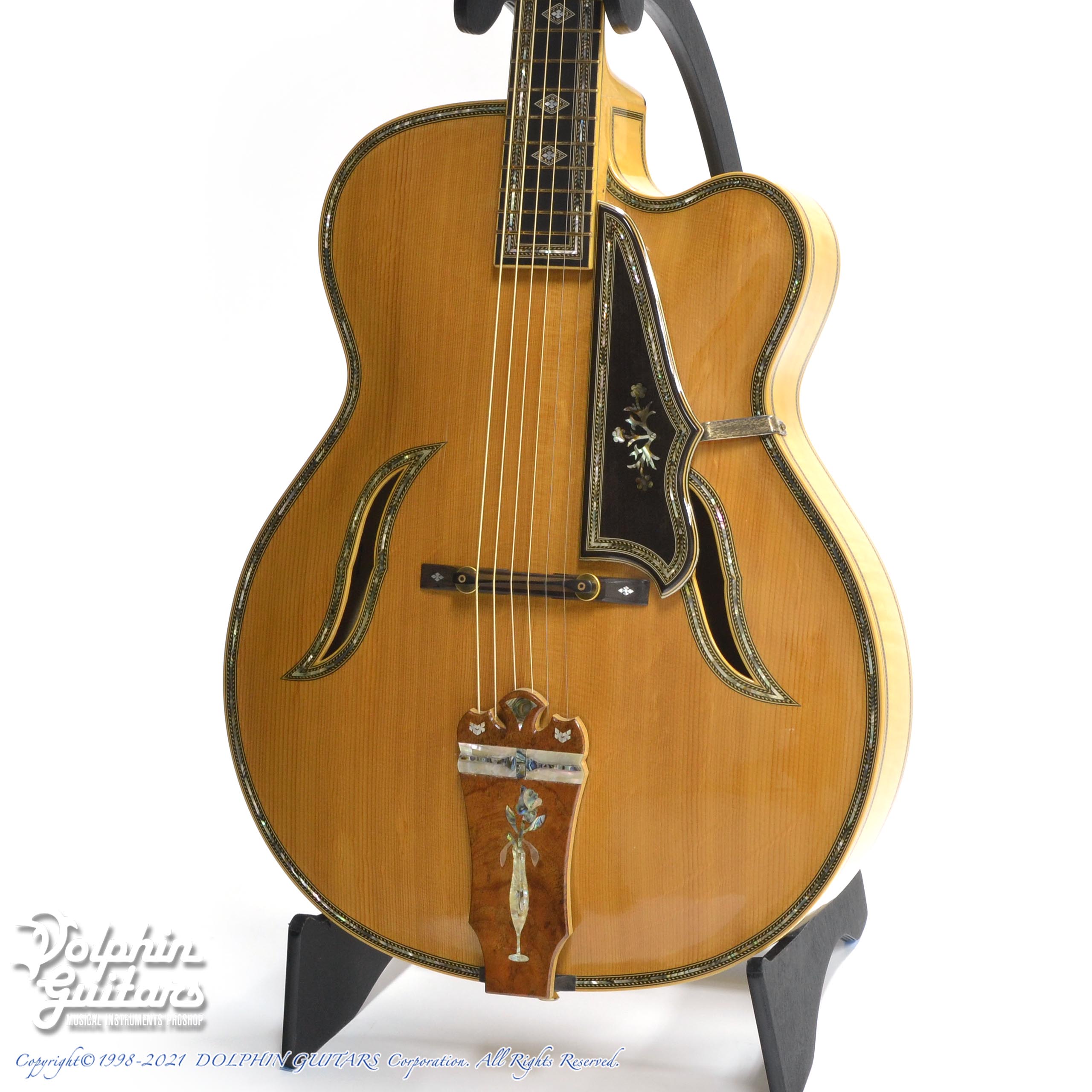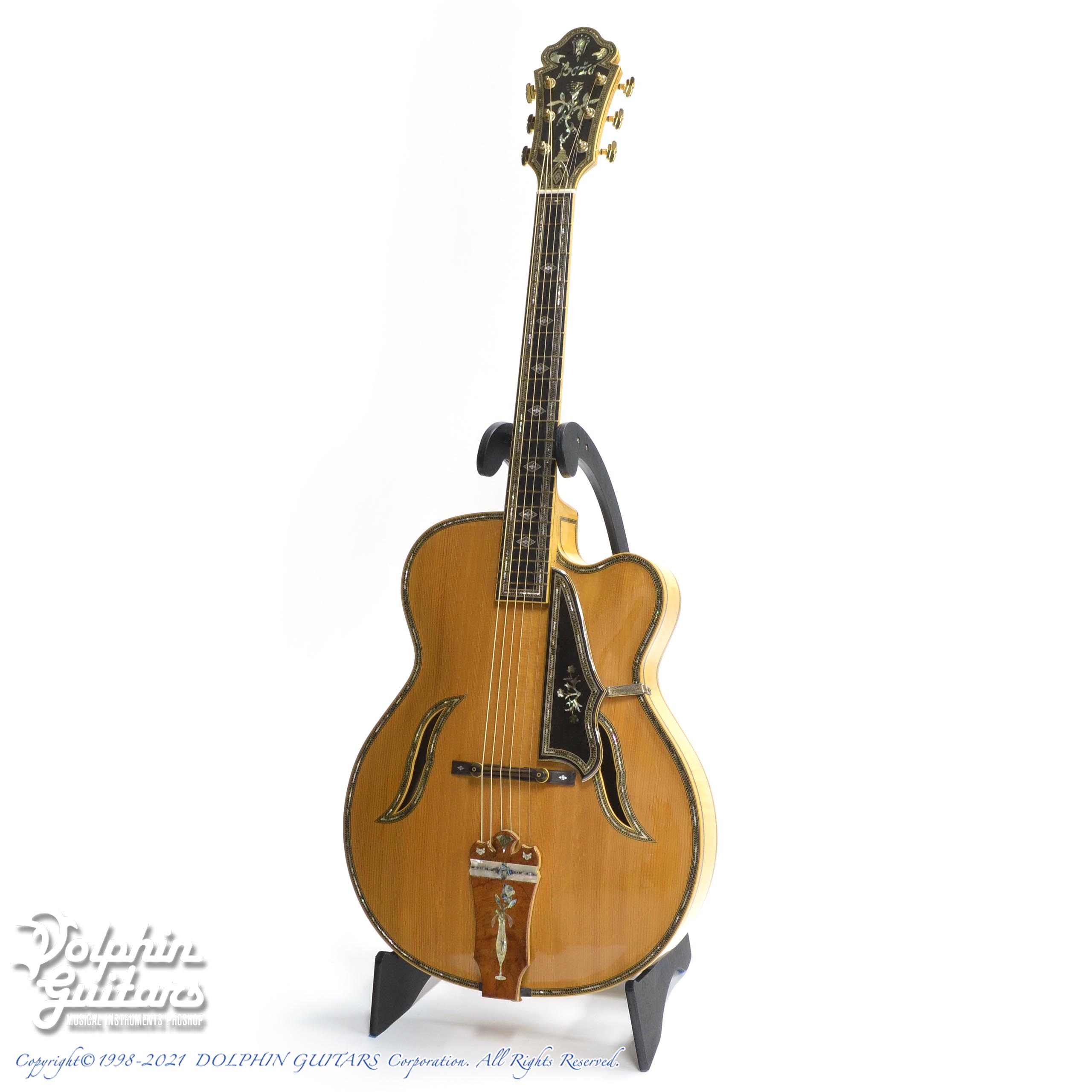 所狭しと入れられた豪華で独特な雰囲気を持つインレイはもちろん、迫力のあるテイルピースやリカーブの特徴的なグラマラスなアーチ形状など、恰も工芸品として製作されたと錯覚してしまうほどの美しさに息を飲んでしまいます。