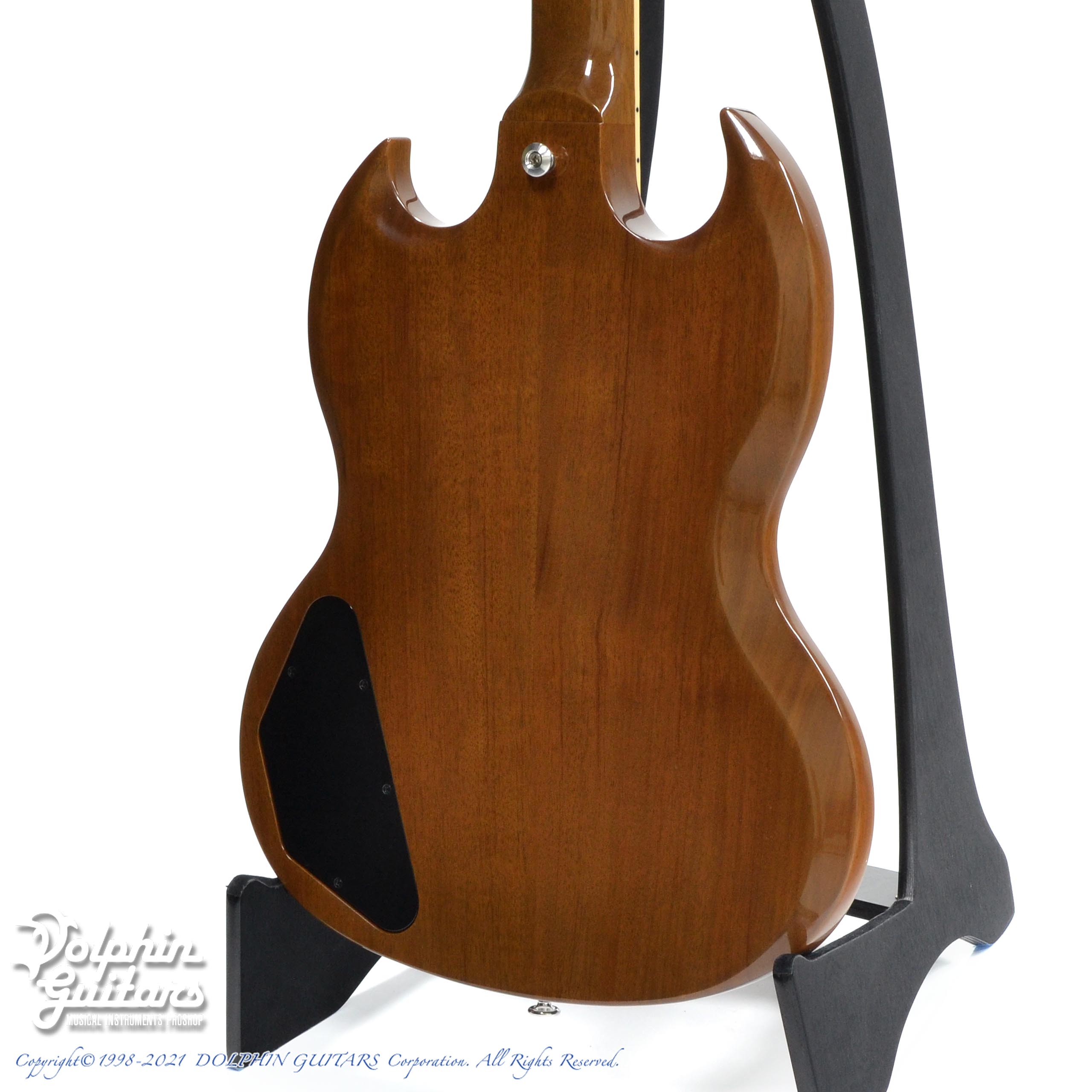 ウォルナット カラーとベッコウ柄ピックガードが渋い限定モデル。主張の強いSGシェイプもこの雰囲気なら様々なシーンにマッチします。