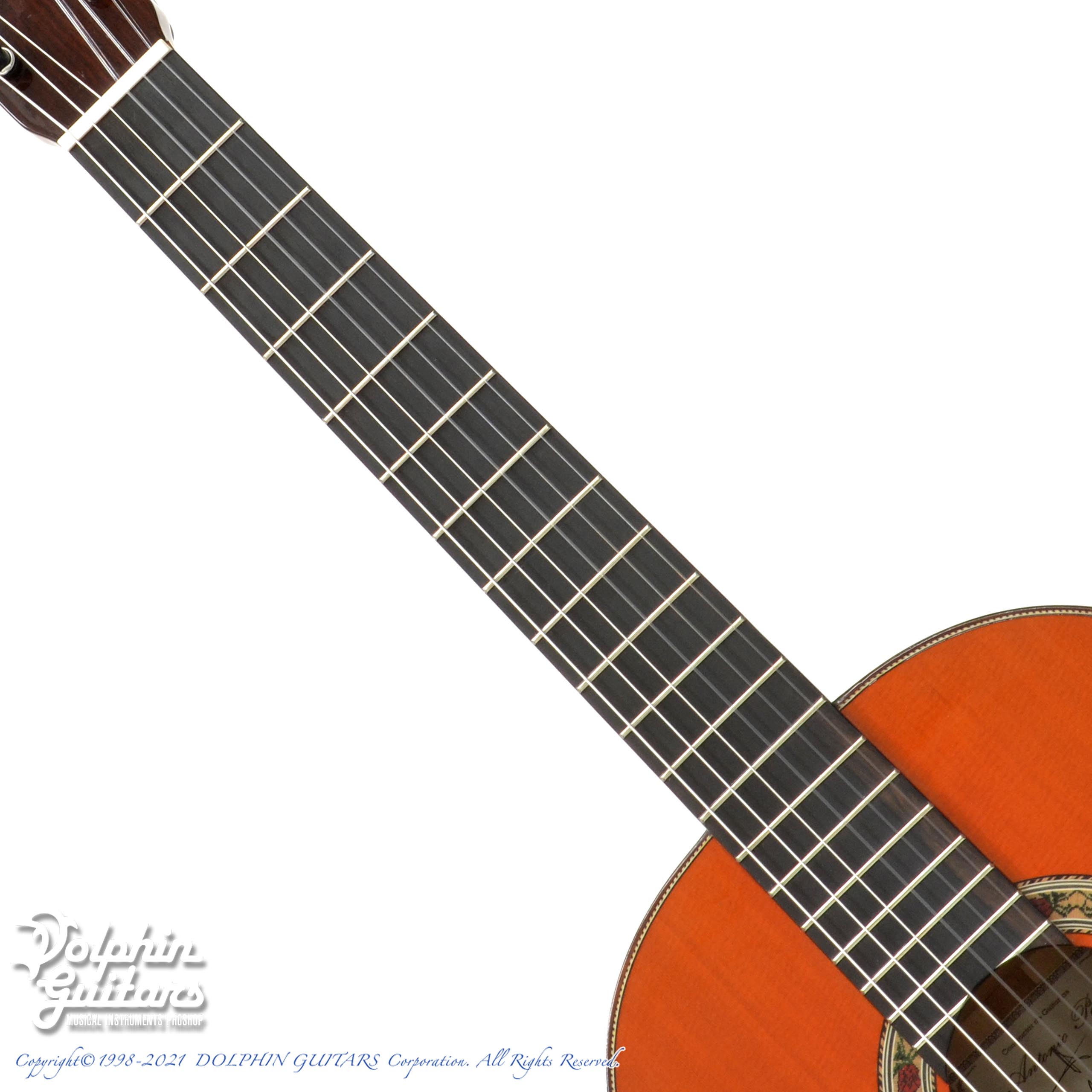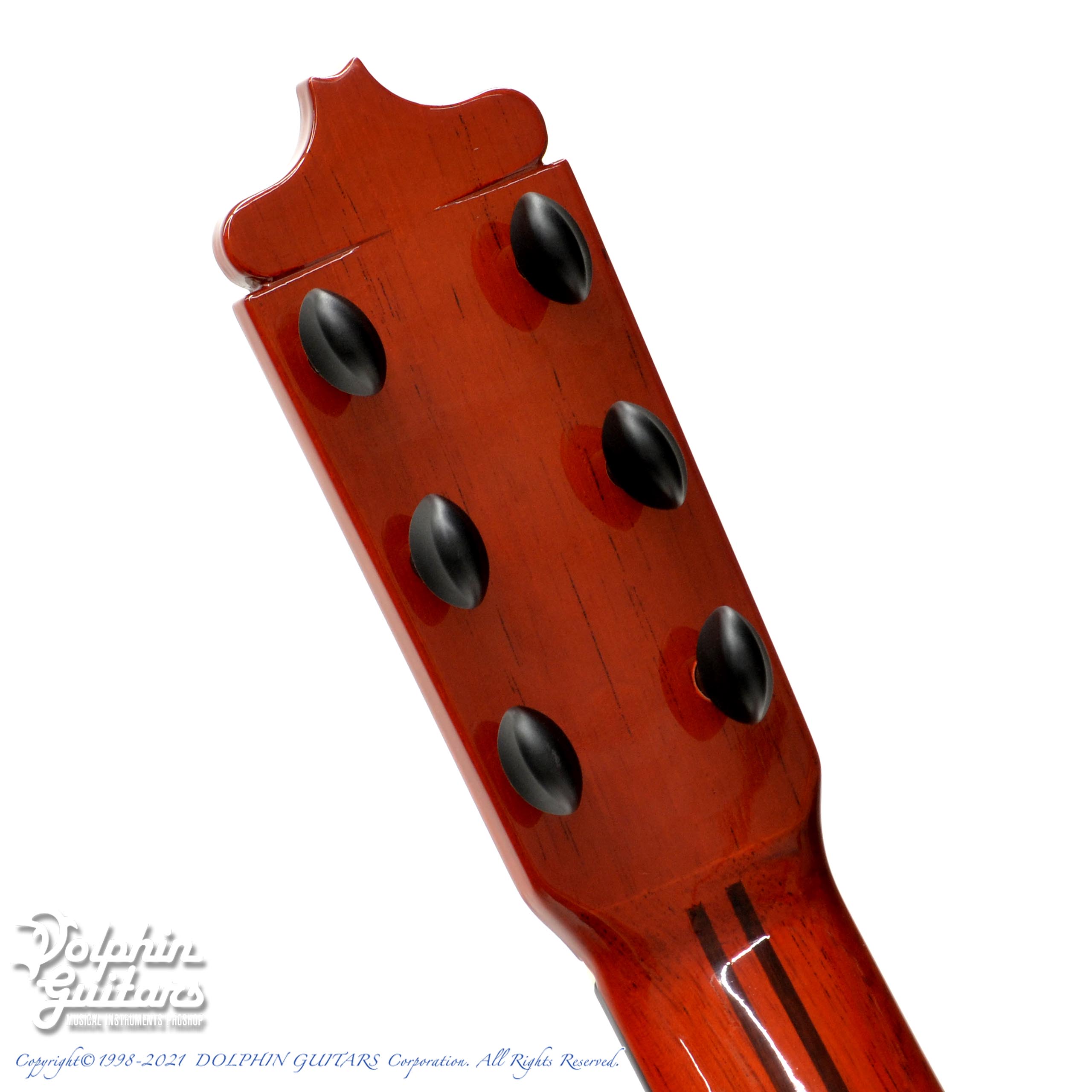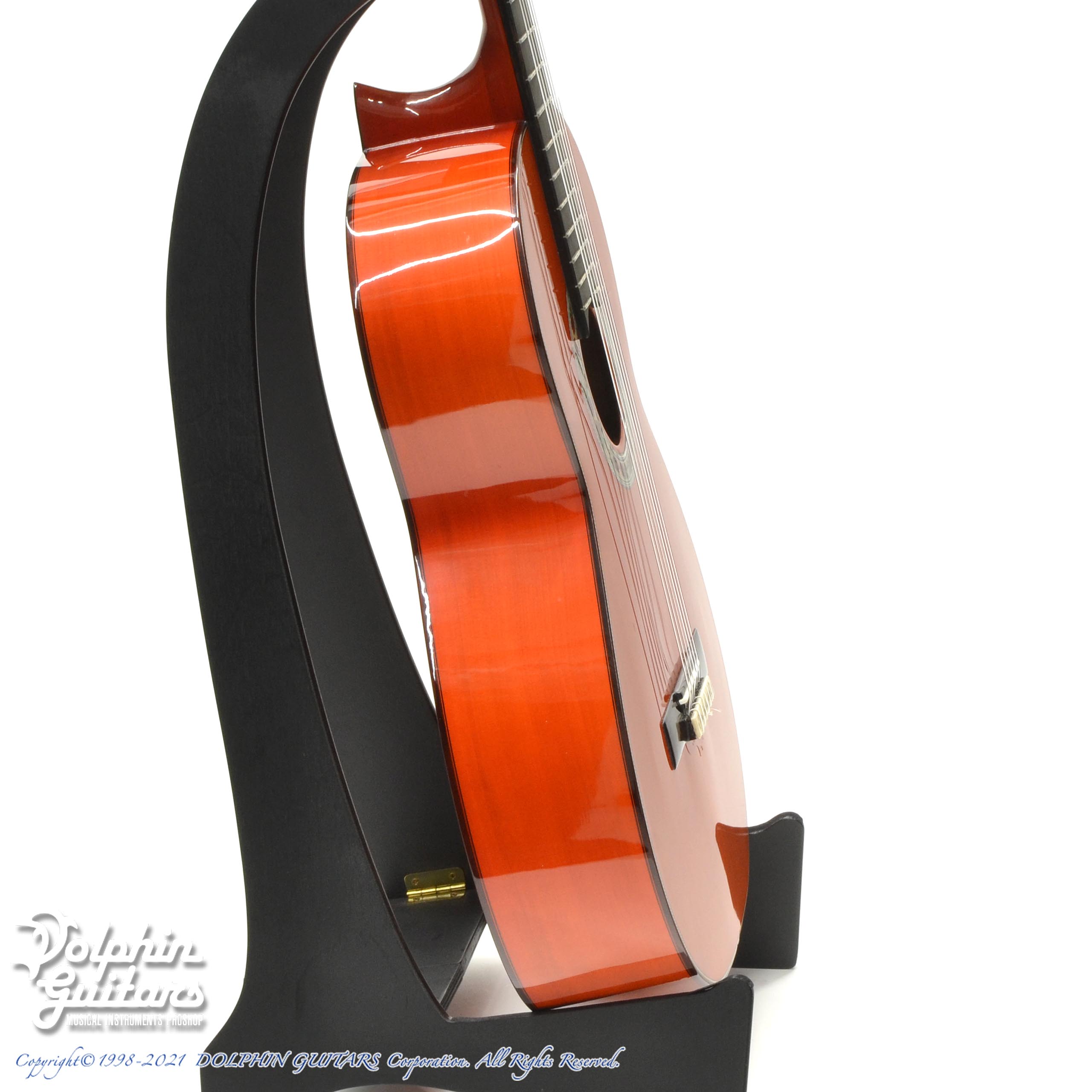 バラのサウンドホールロゼッタと情熱的なボディのカラーリングは、伝統的なフラメンコデザインを感じる一方で、木ペグの外観を持つギア式ペグや華やかな形状を持つブリッジ下弦飛び保護用クリアガードなど、随所に現代的なデティールが盛り込まれております。