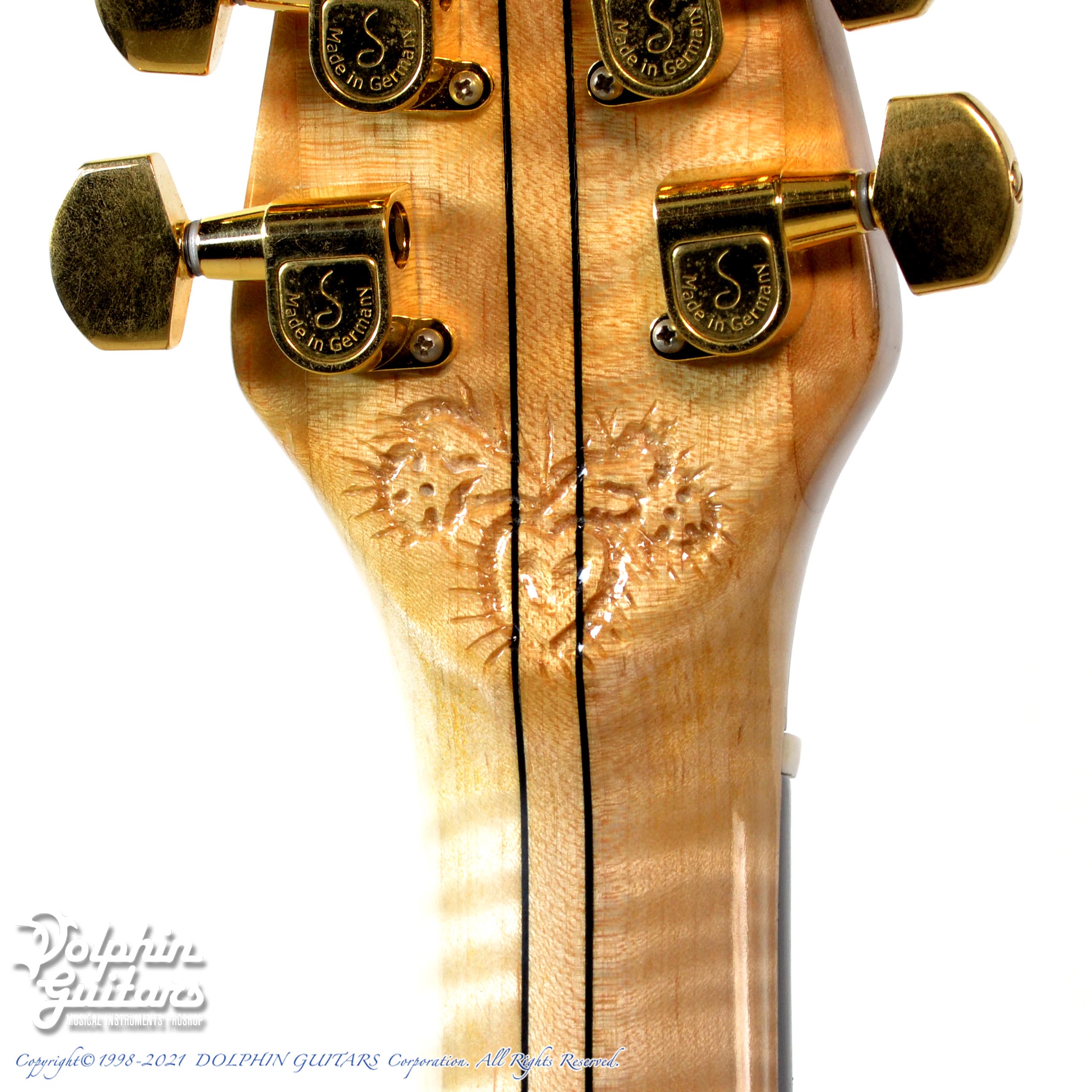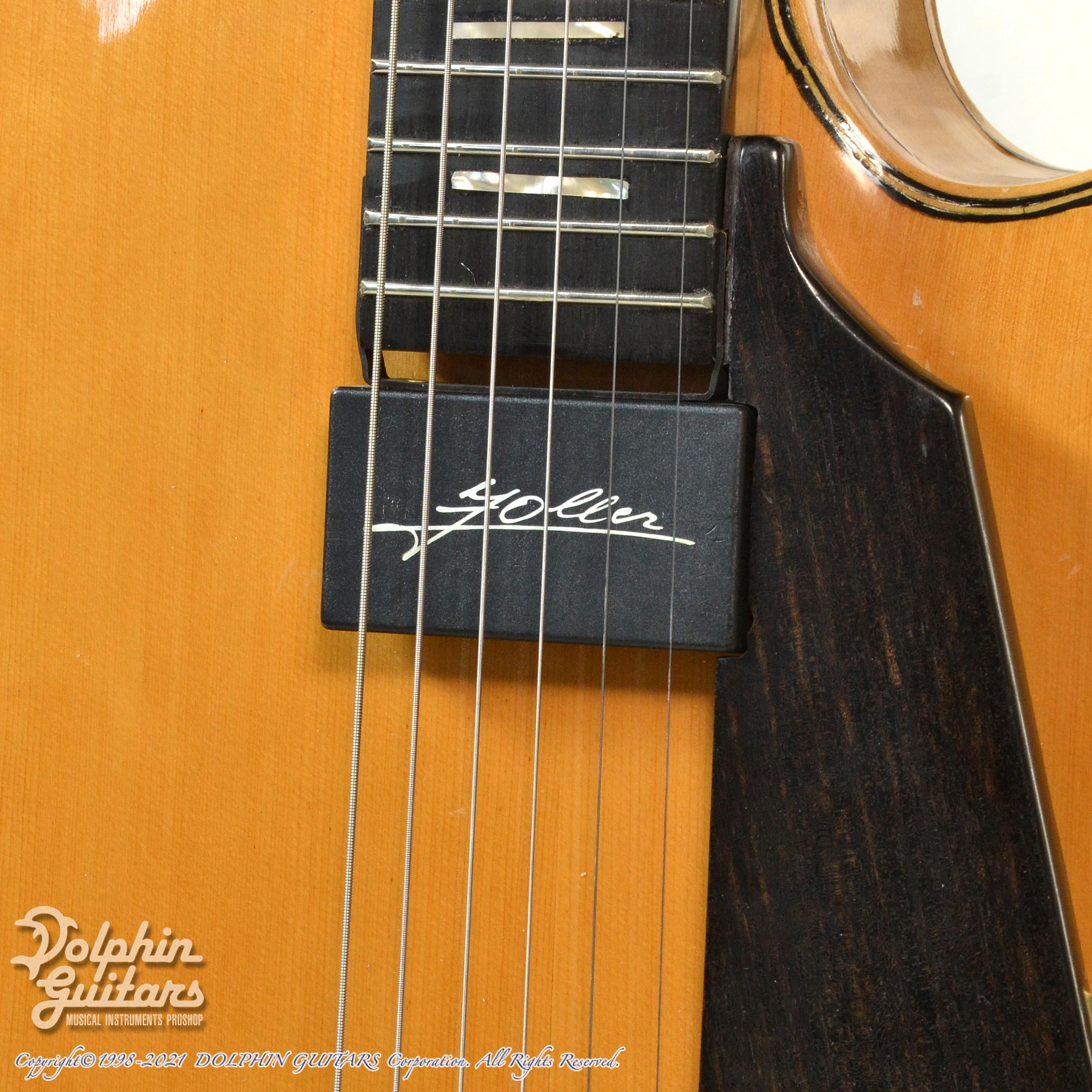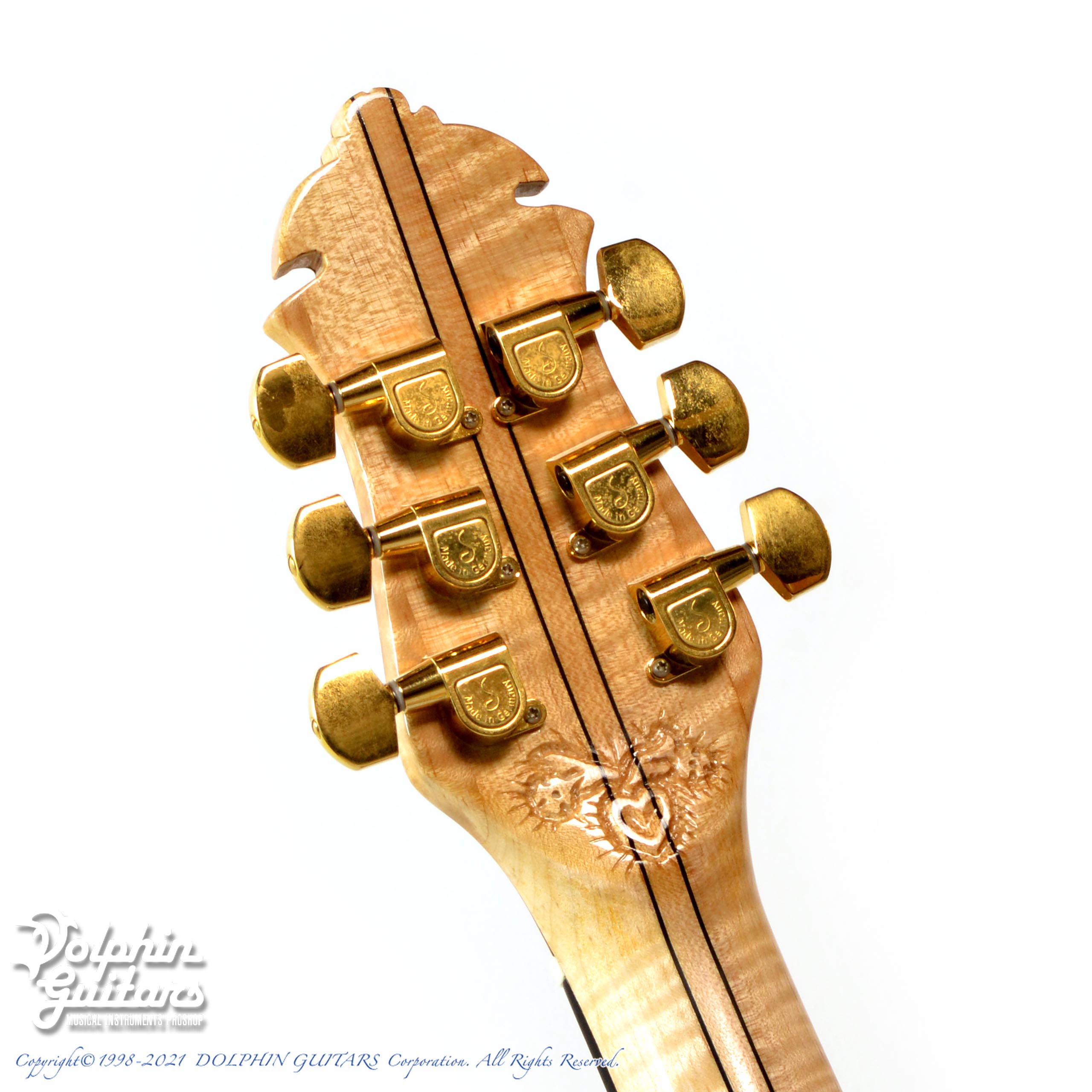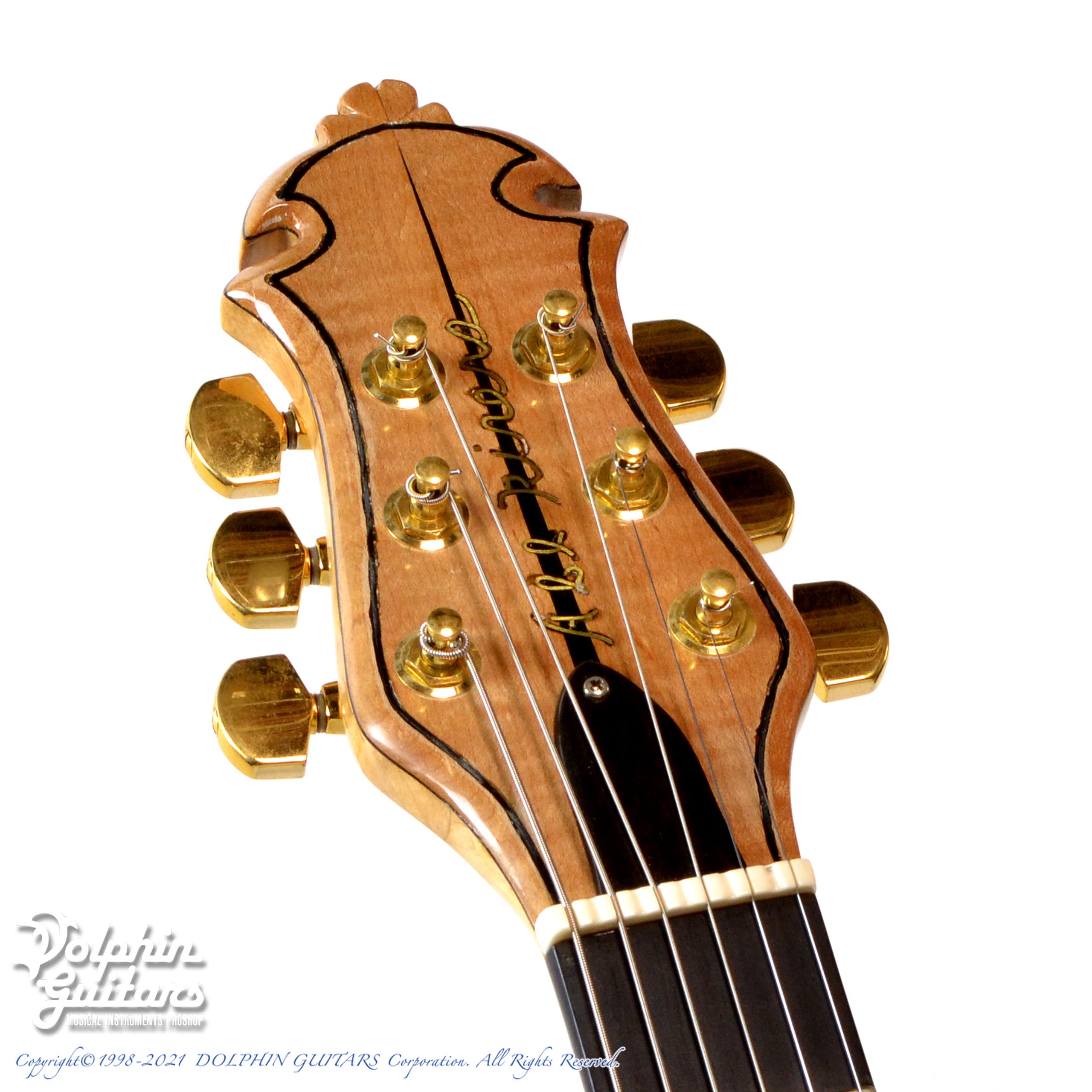 大胆に削られたアーチトップ・バックやファットなネックシェイプなどは、エイブ・リベラ氏の特徴かもしれません。良い意味でフレットやボディ・ネック細部の仕上げがやや粗く、精巧に作られた楽器が多い現代、こういった楽器は逆に個性的に映ります。また、テイルピースやヘッド裏の彫り込みなど、エイブリベラ本人の息遣いを感じる仕上がりです。