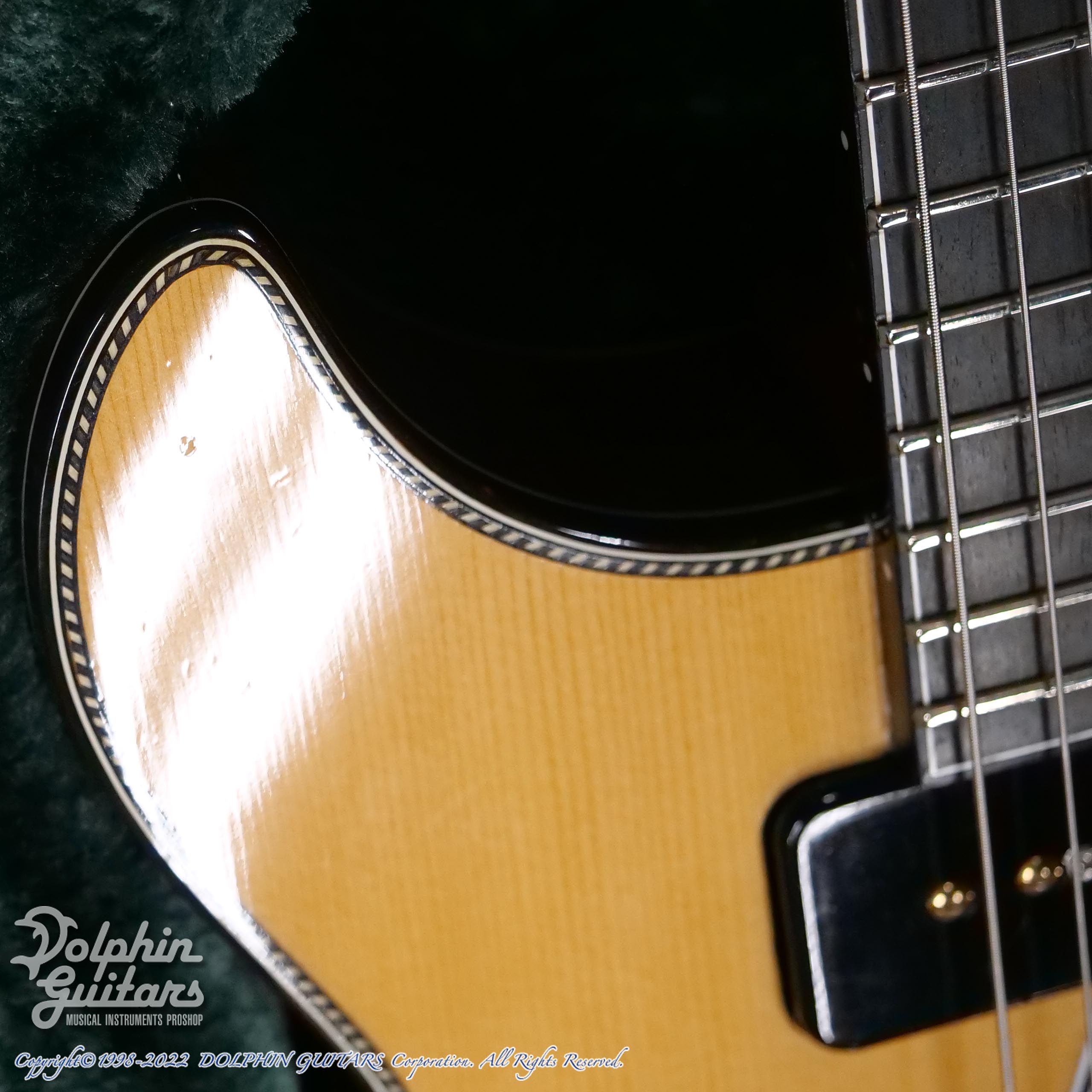 スプルーストップにロープパーフリング、ボディシェイプはレスポールジュニア、なんとも可愛いルックスでしょうか。マホガニーくり抜きボディにメイプルセンターブロックを配し、マホガニーの持つマイルドな音色な音色の中にも歯切れの良さと輪郭の美しさを併せ持った理想的なサウンドを実現しました。ネックは50年代を豊富ととさせるやや太めのグリップを持ち、安心感のあるフィーリングです。