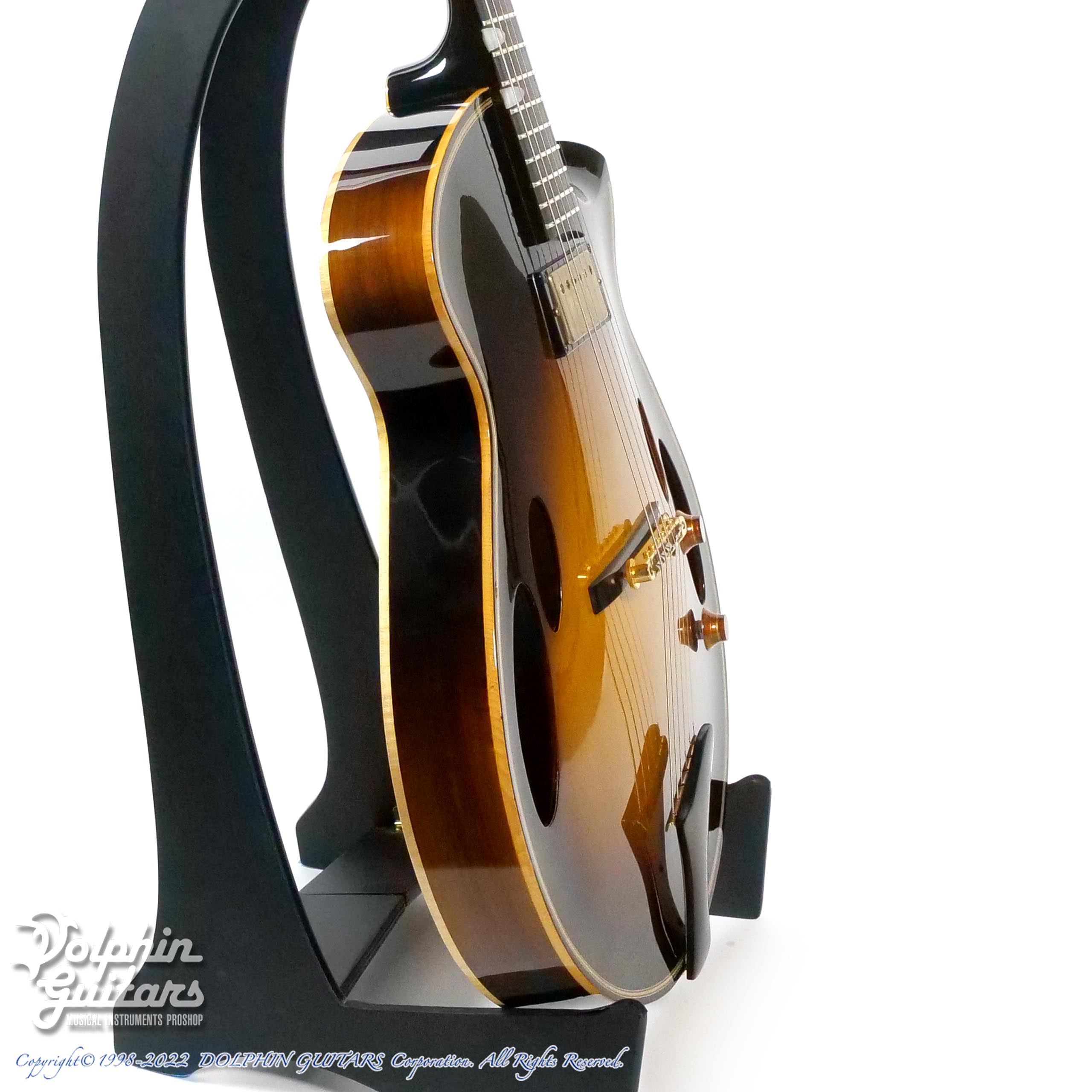 アメリカのアーチトップビルダー、Otto D'Ambrosio(オットー・ダンブロシオ)デザイン・設計された本器は、同ブランドの中でも異彩を放つモデルといえます。非対称のヘッド、16フレットジョイント仕様、ウッドパーフリング、オリジナルデザインのFホールなど、もはや芸術の域に達したアーチトップギターでしょう。