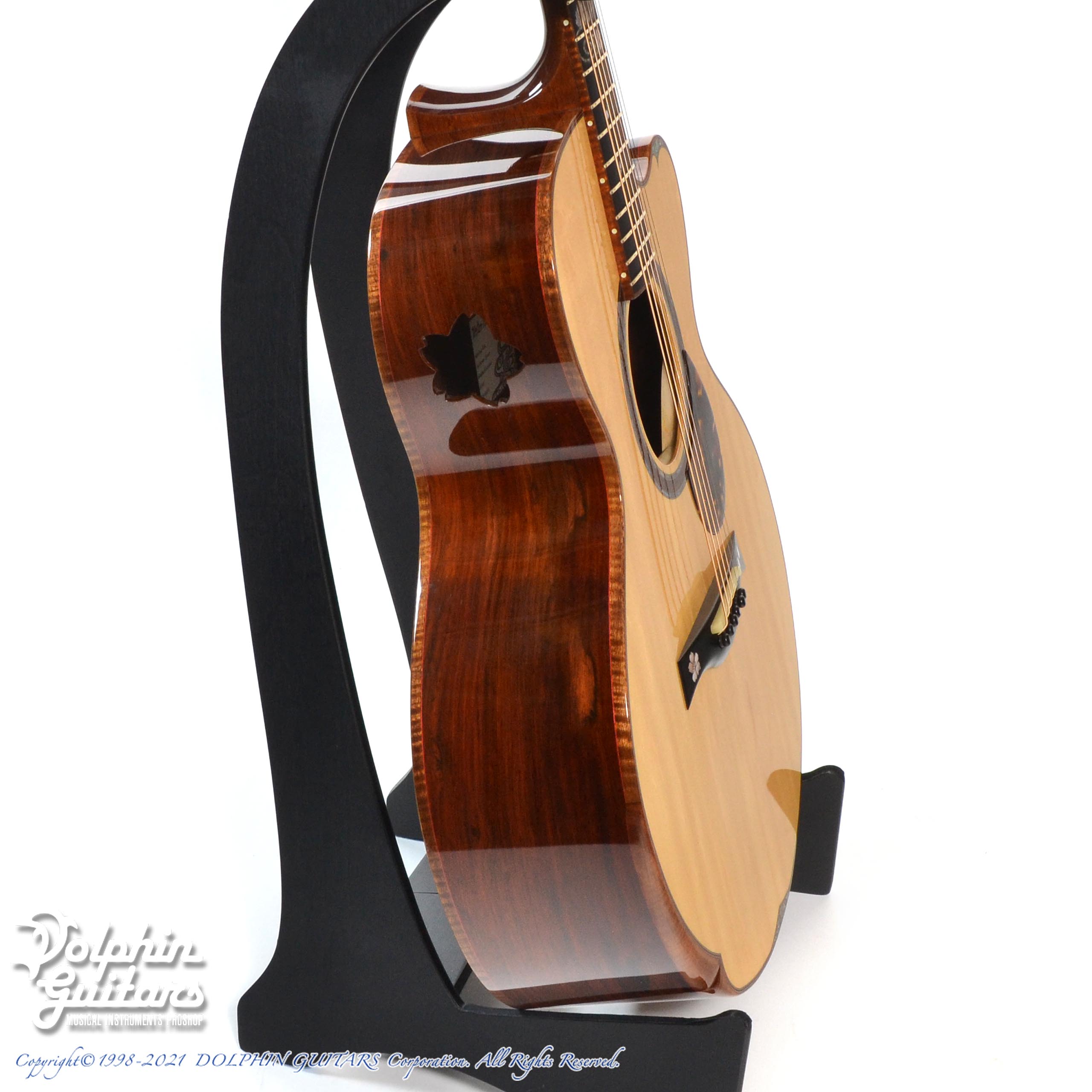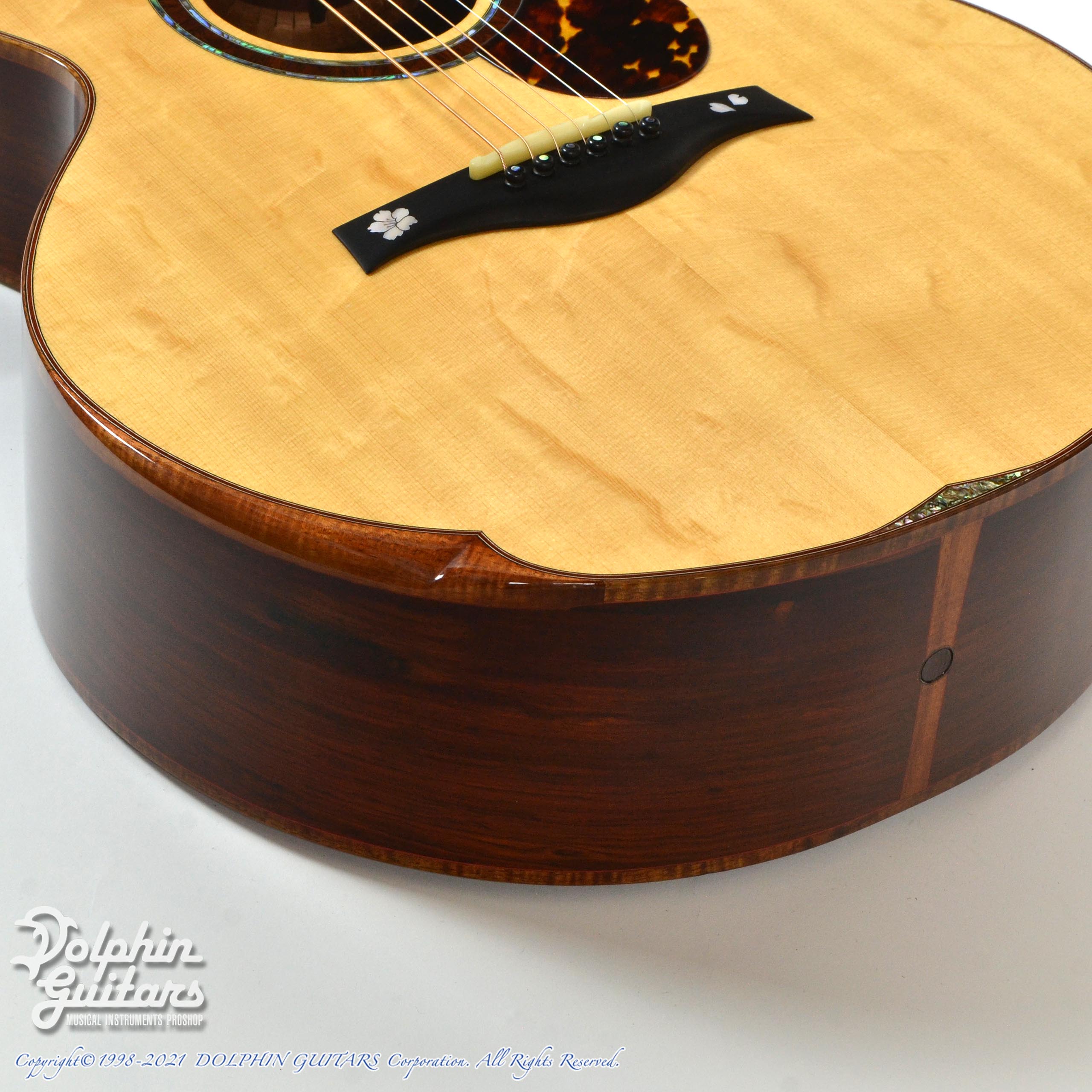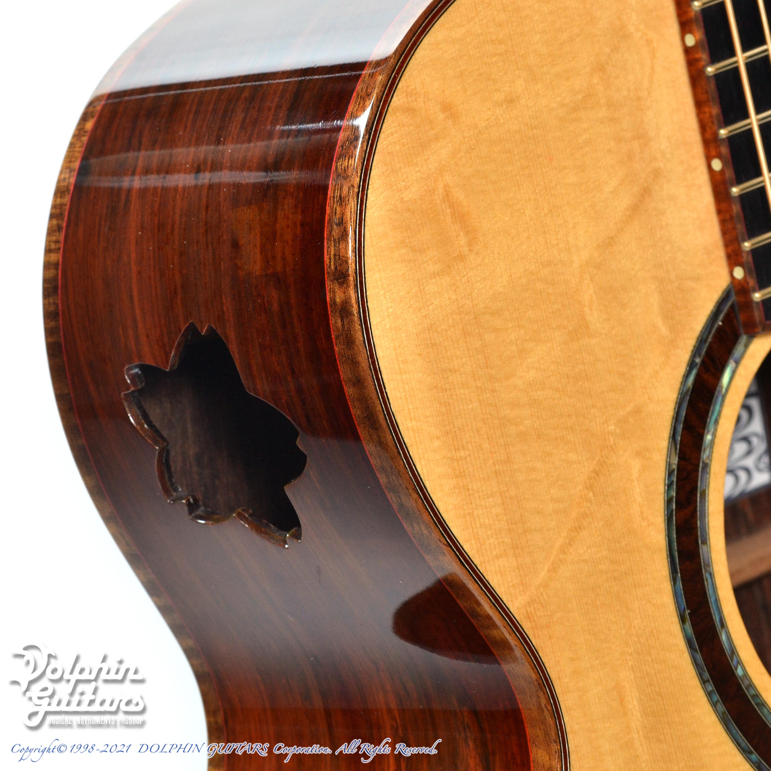 美しい流水桜インレイが施された、ブランドのカラーが色濃く出たカスタムモデルです。天然杢の芸術とも言える素晴らしいマテリアルの使用も、ルシアー界随一とも言われる材のストック量を誇るウォーターロードの魅力のひとつ。バランスよく現れたベアクロウ杢のトップにコアバインディングと貝細工が美しくマッチしております。クラウドフィギャードと銘打たれたココボロも木目フェチにはたまらない外観です。