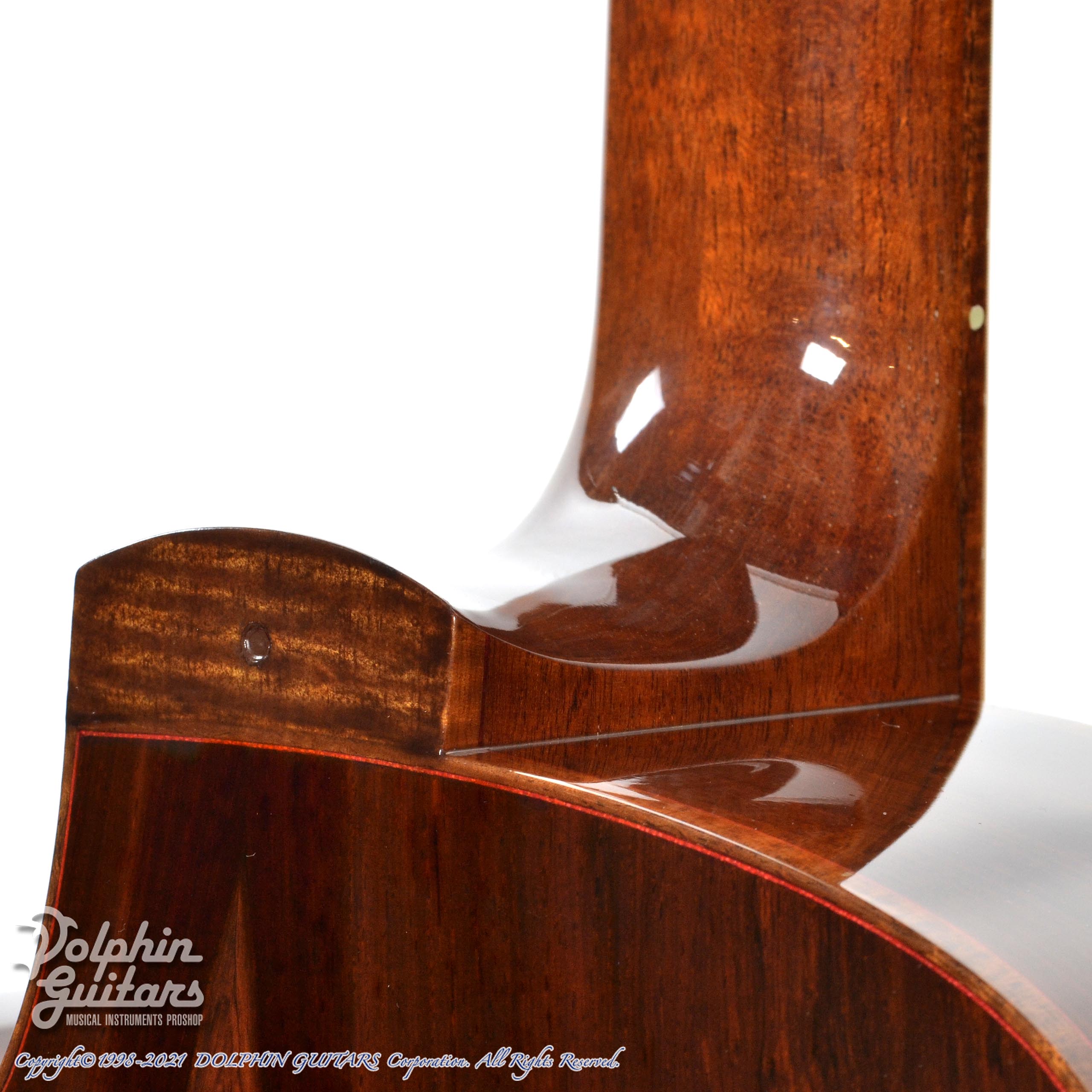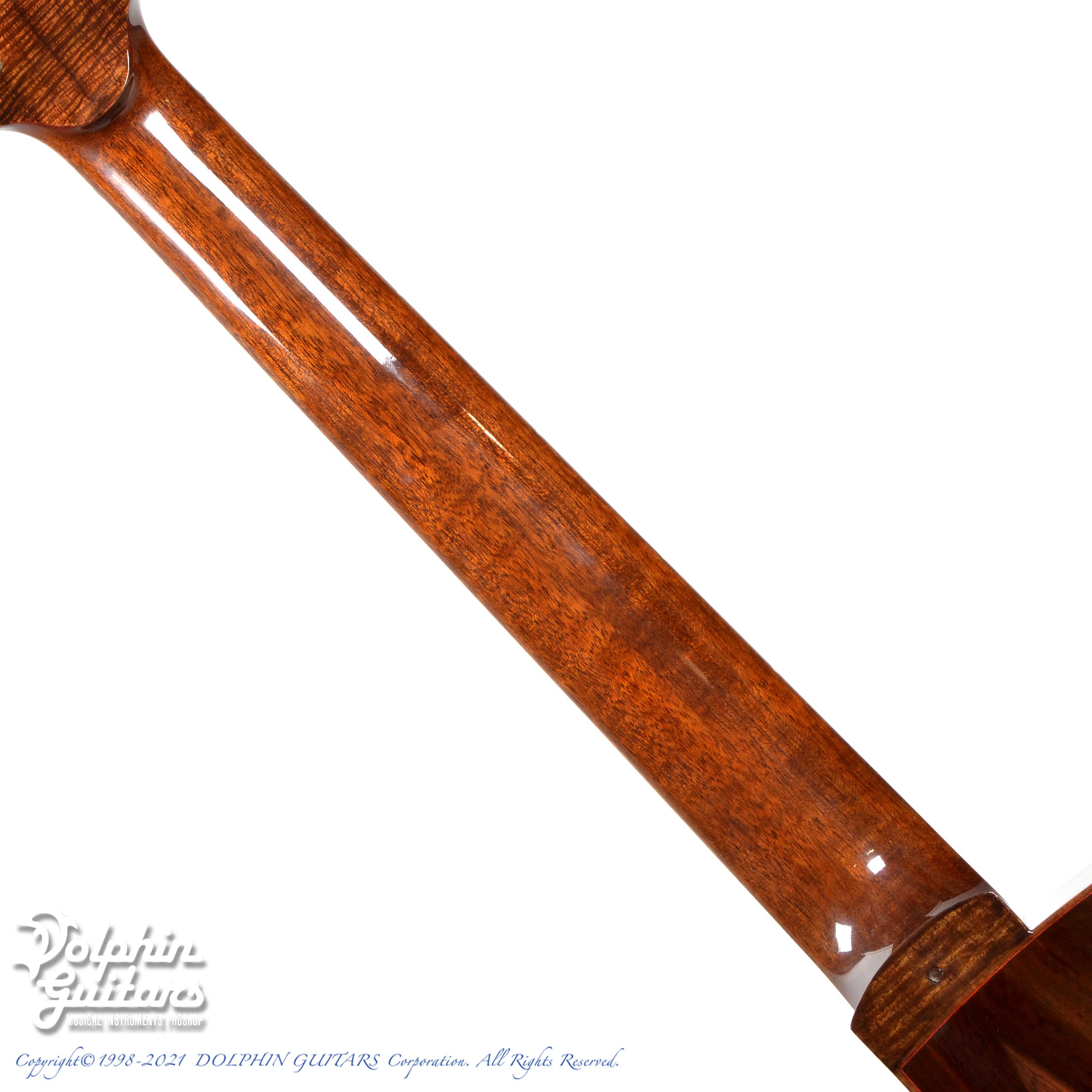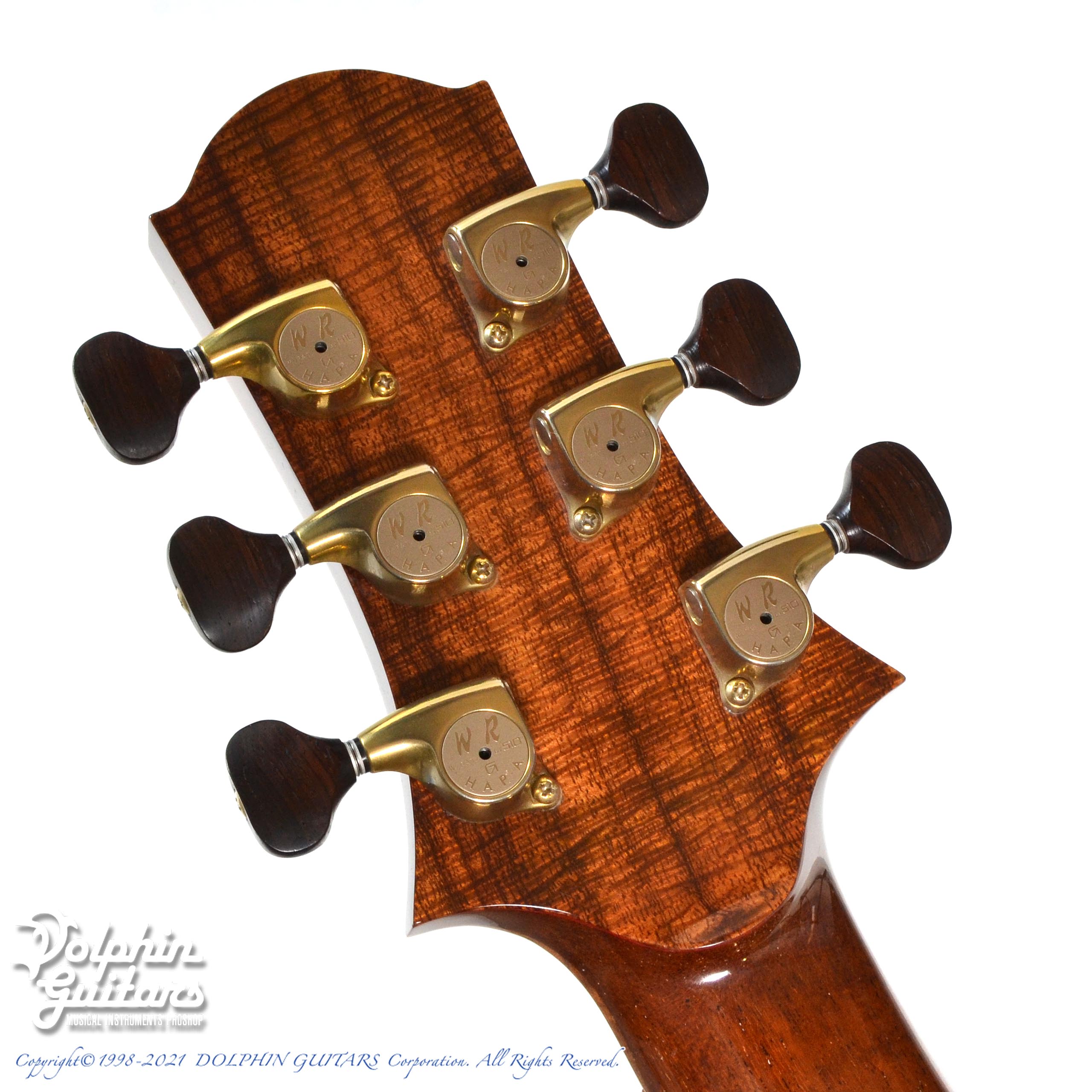 美しい流水桜インレイが施された、ブランドのカラーが色濃く出たカスタムモデルです。天然杢の芸術とも言える素晴らしいマテリアルの使用も、ルシアー界随一とも言われる材のストック量を誇るウォーターロードの魅力のひとつ。バランスよく現れたベアクロウ杢のトップにコアバインディングと貝細工が美しくマッチしております。クラウドフィギャードと銘打たれたココボロも木目フェチにはたまらない外観です。
