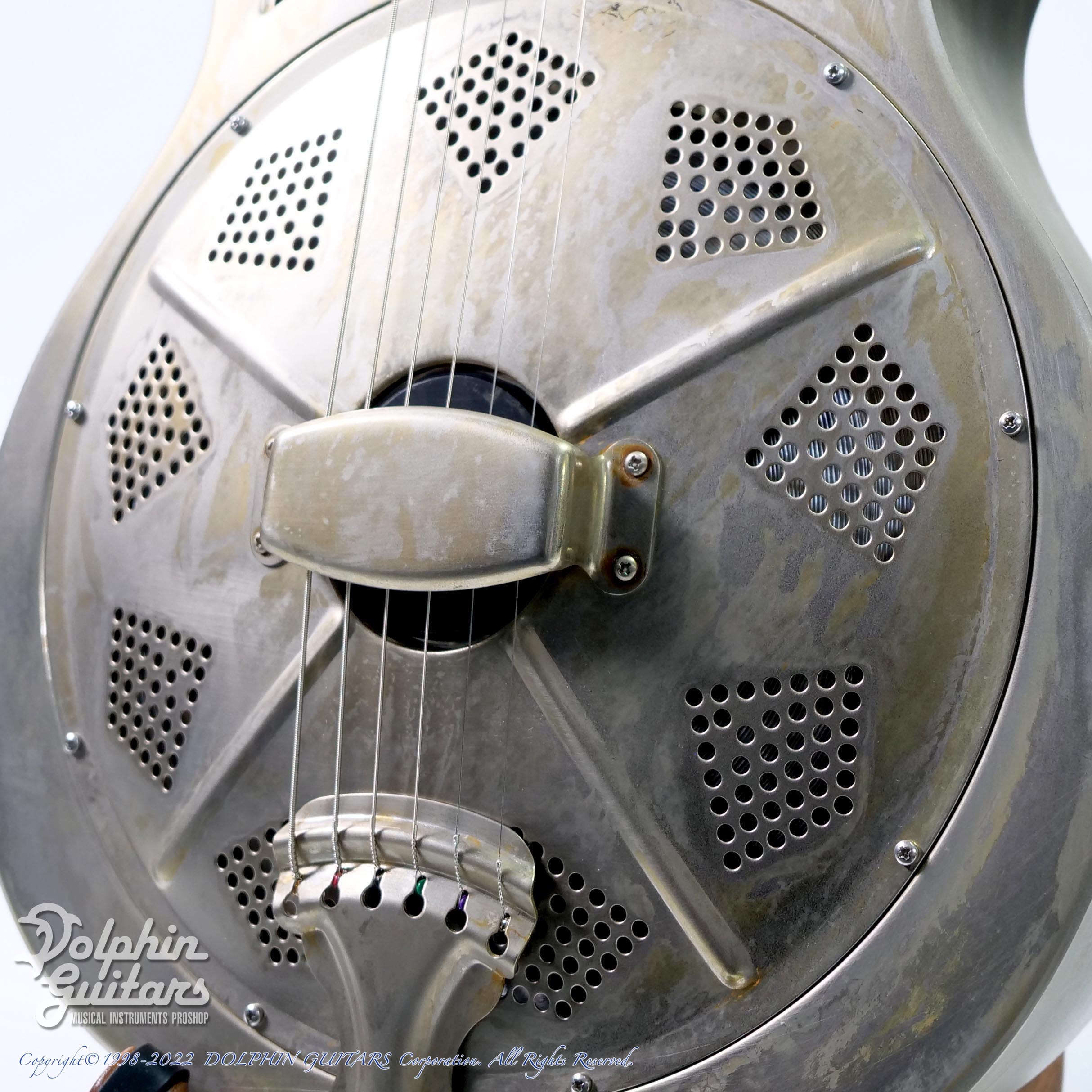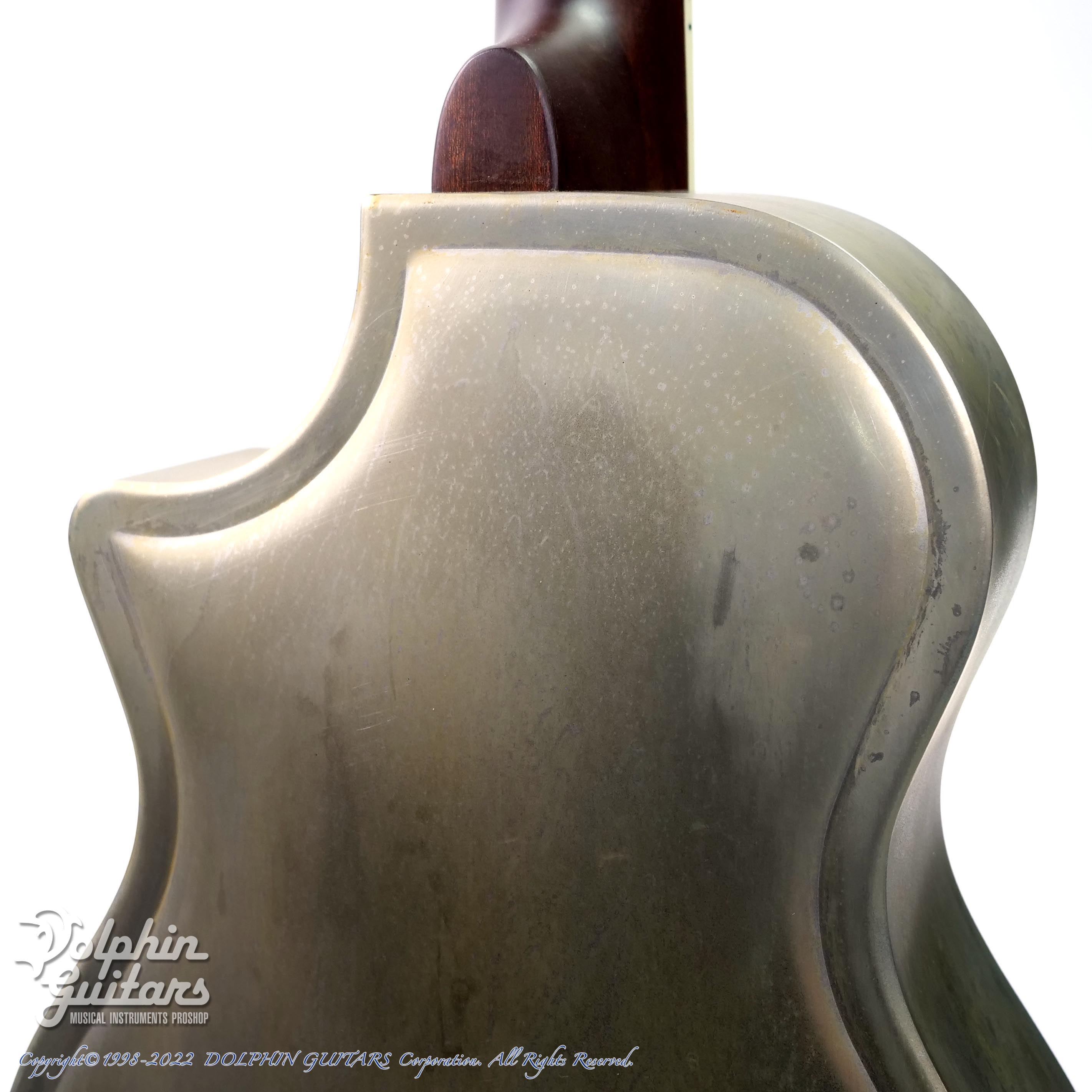 コンパクトでカッタウェイデザインは、どこか現代的なニュアンスがありますが、レリック加工処理されたメタルボディや両サイドのN社を彷彿とさせるサウンドホールなど、ヴィンテージな雰囲気を感じるとてもカッコ良いギターです。SQでは無い通常のネックシェイプなので、スライド以外の奏法にも対応可能です。