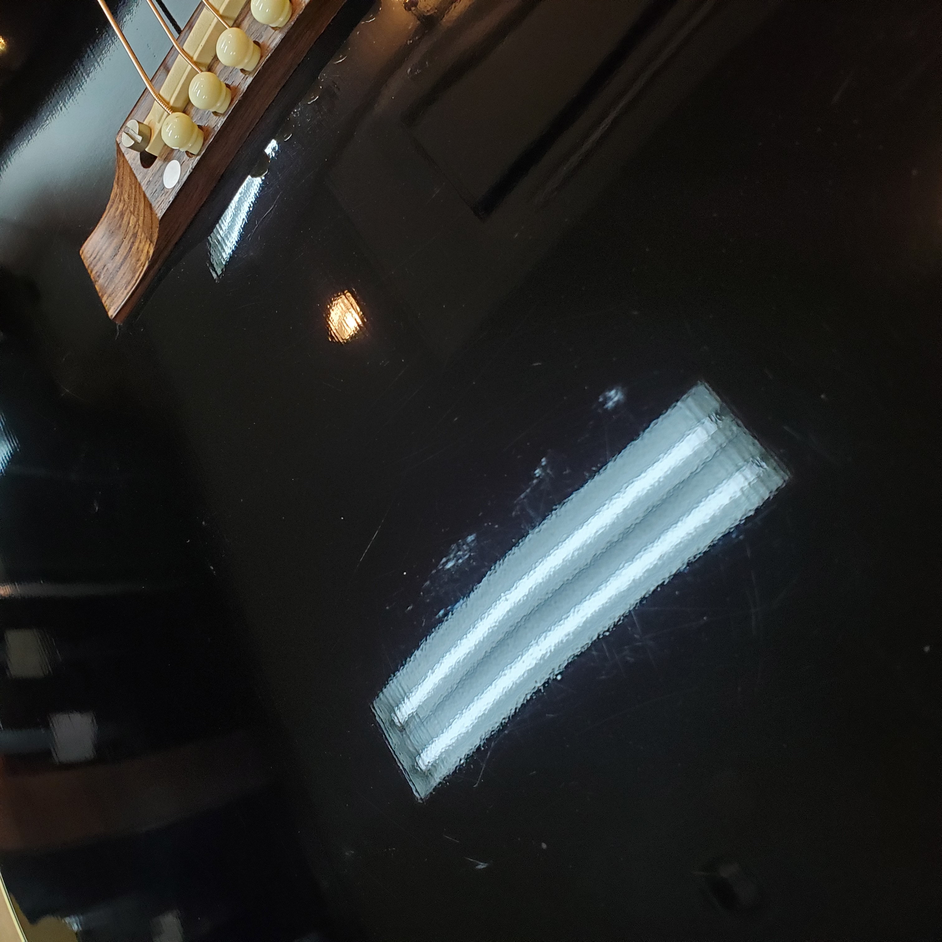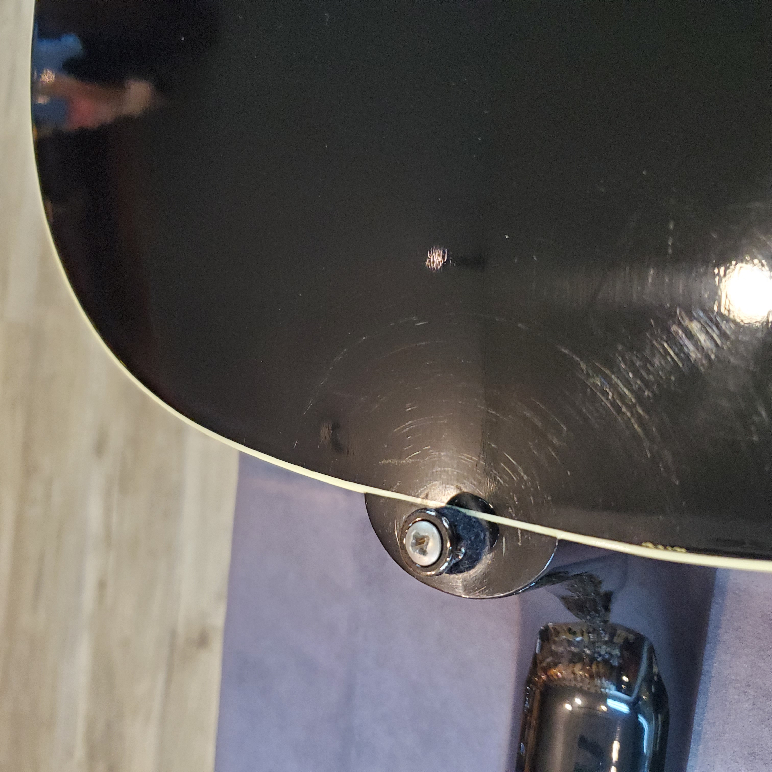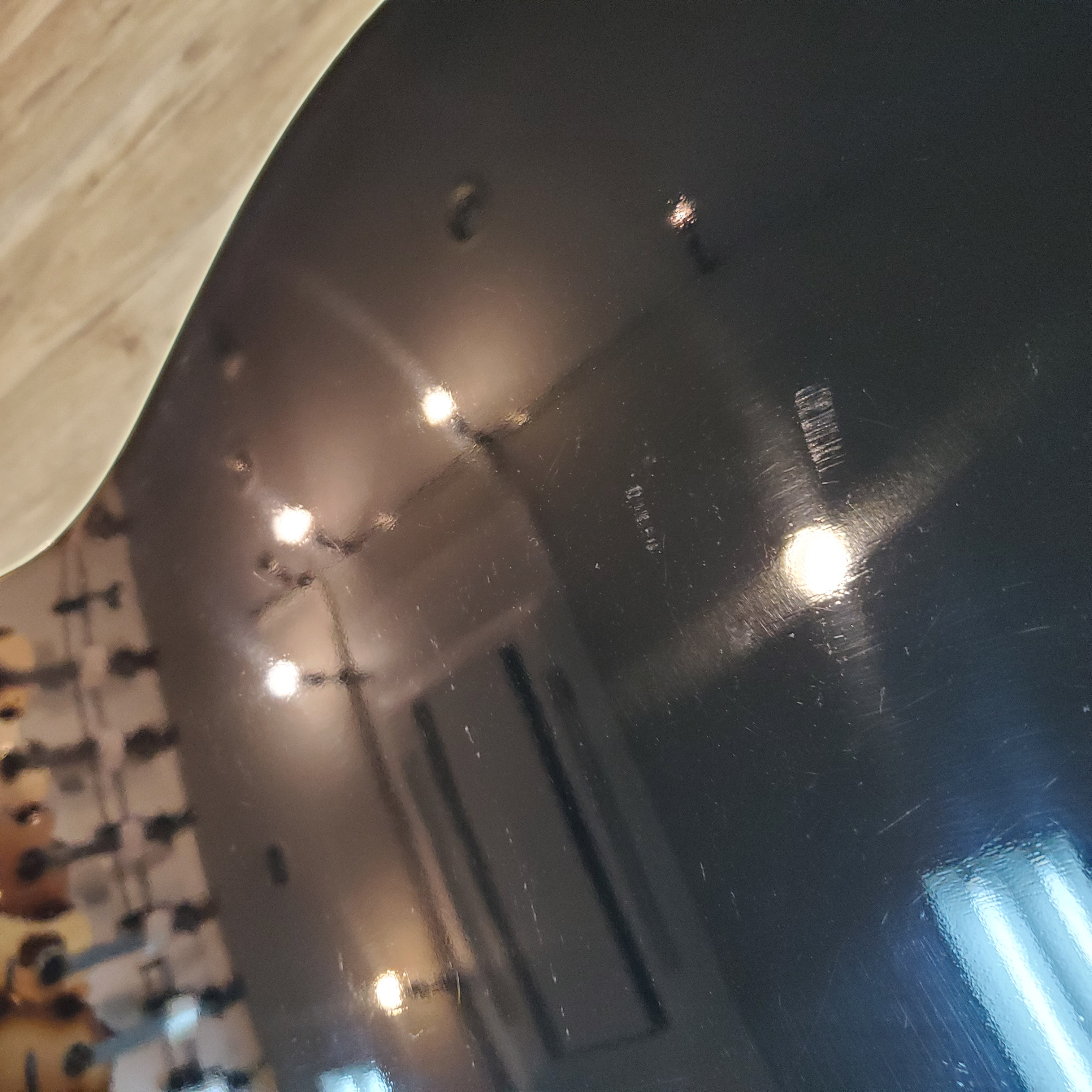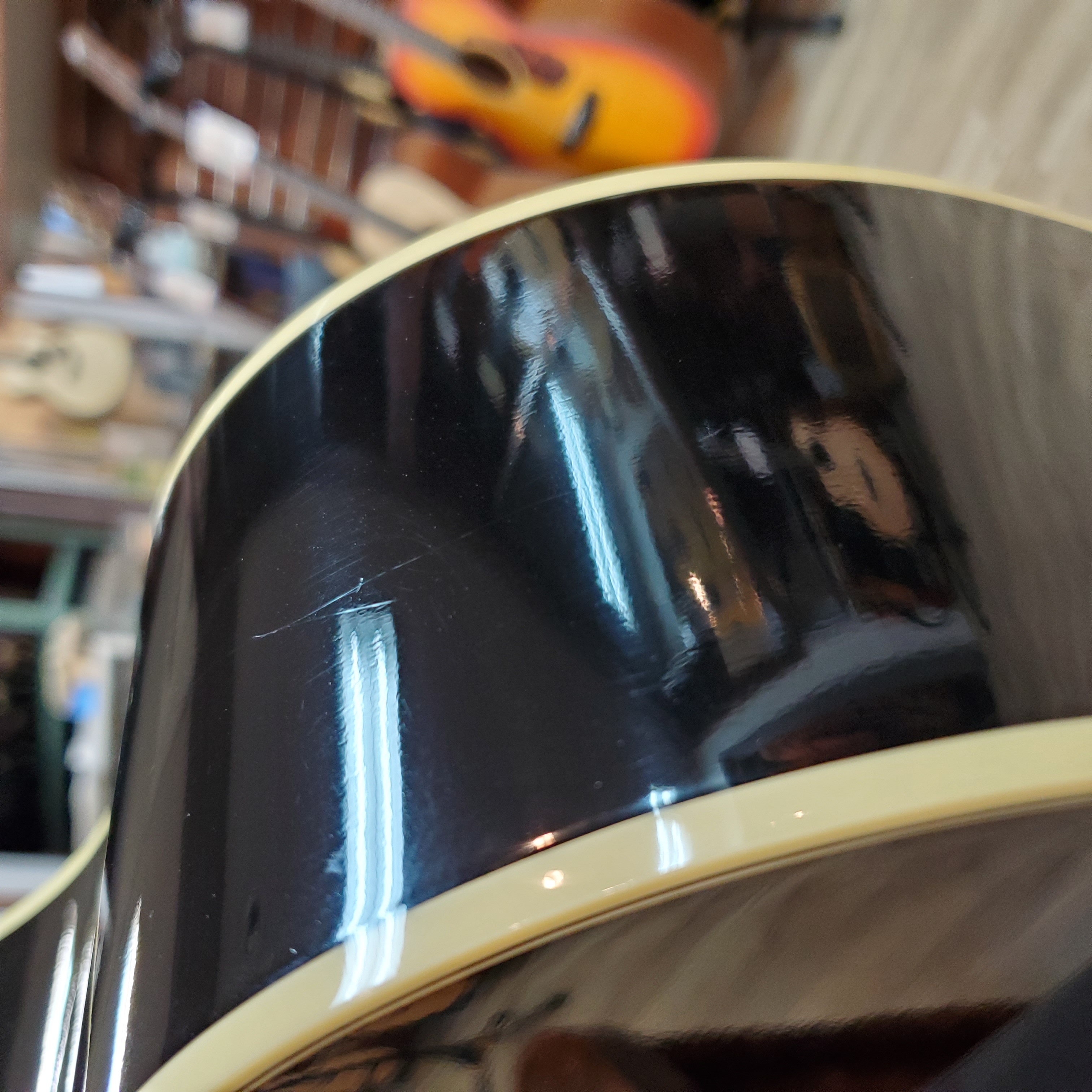 ブラックボディ&ホワイトピックガードのコントラストは、数あるラウンドショルダーの中でも圧倒的な人気を誇ります。約10年が経過したラッカーがほどよく痩せてきており、ほんのりクリーム色のパーツも含め、かなりカッコよくなってきていると思いませんか。