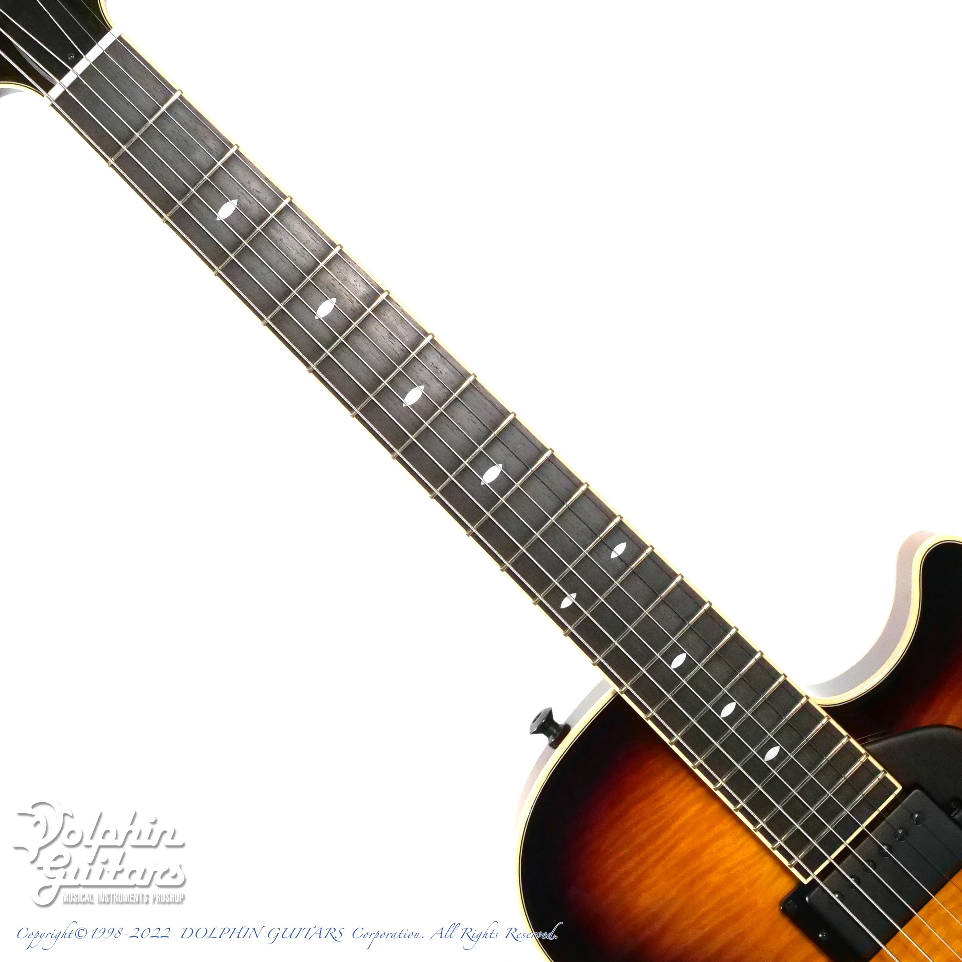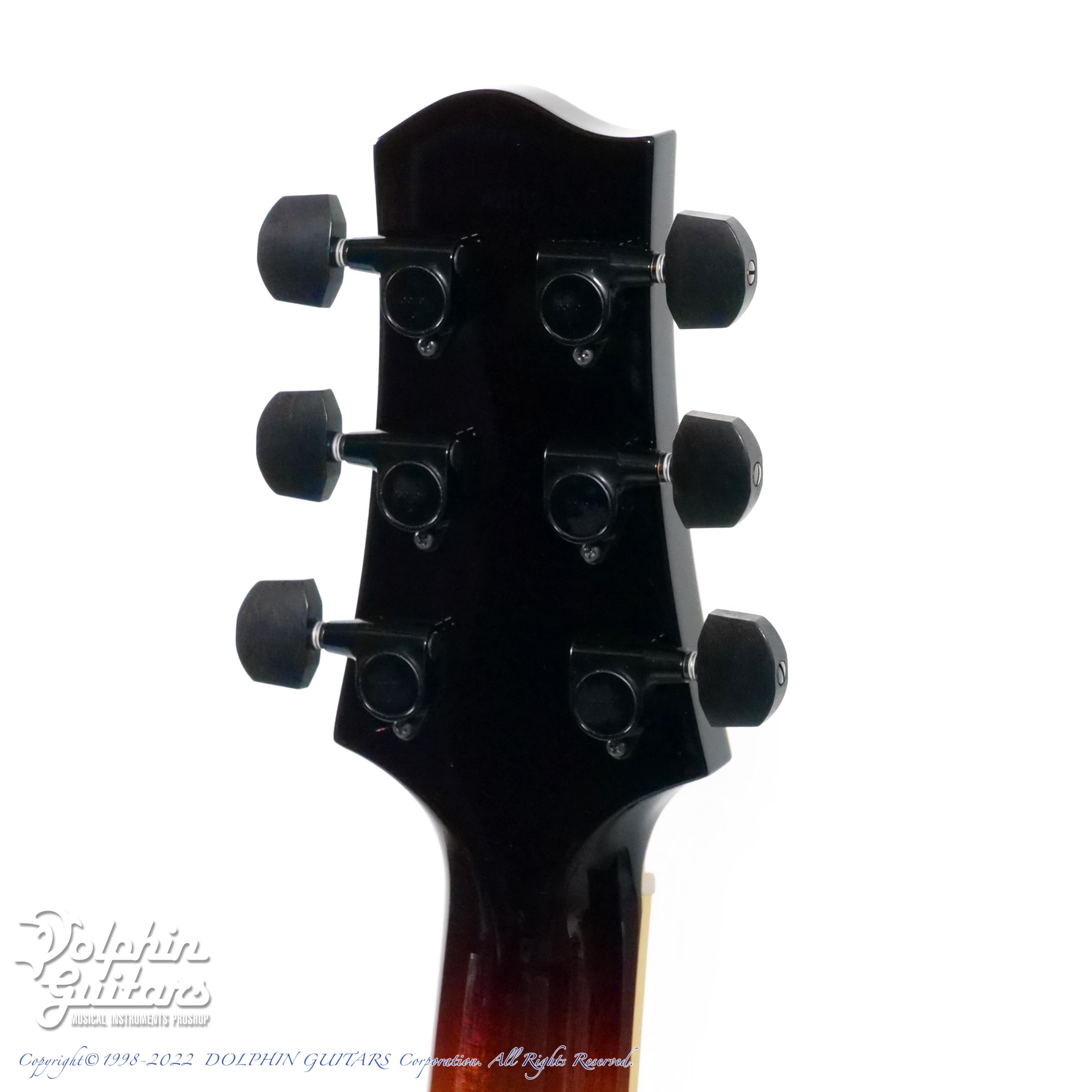 パーツ類は黒に統一されており、指板のポジションマークはシンプルなキャッツアイ・インレイと相まってスタイリッシュな外観です。