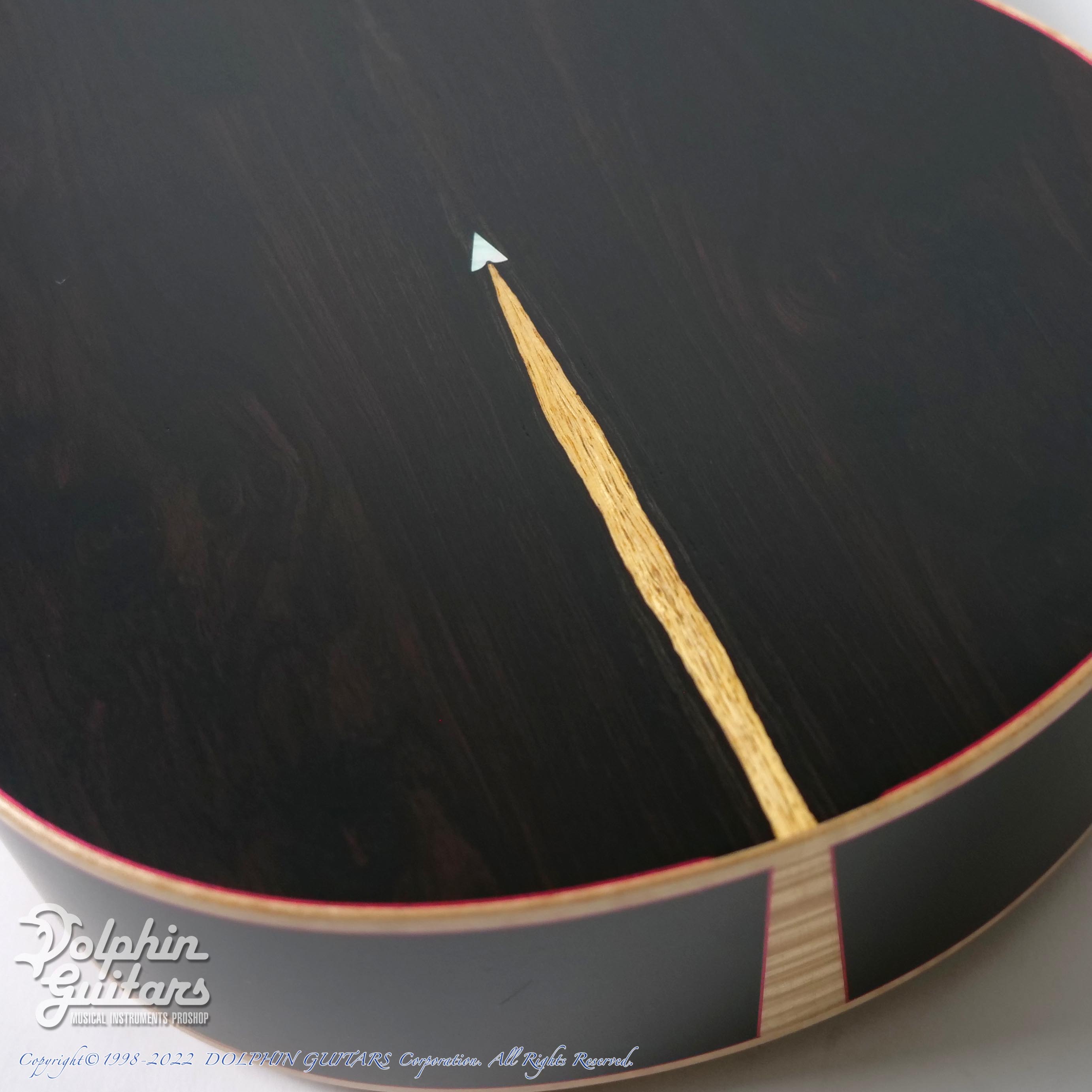 魂にも勾玉にも見えるヘッドのパールインレイと、覗くとアフリカンブラックウッドの黒が映る、悪魔の目にも見えるサウンドホールの対比、12FのMOPとブラックパールの組み合わせ、それらは太陰大極図のような対比にも見てとれ、そしてはっきりと白と黒に分かれたペグもまさに陰陽を表現しているとかいないとか...悪魔と陰陽道、西洋と東洋のコラボとも思える面白いディテールです。