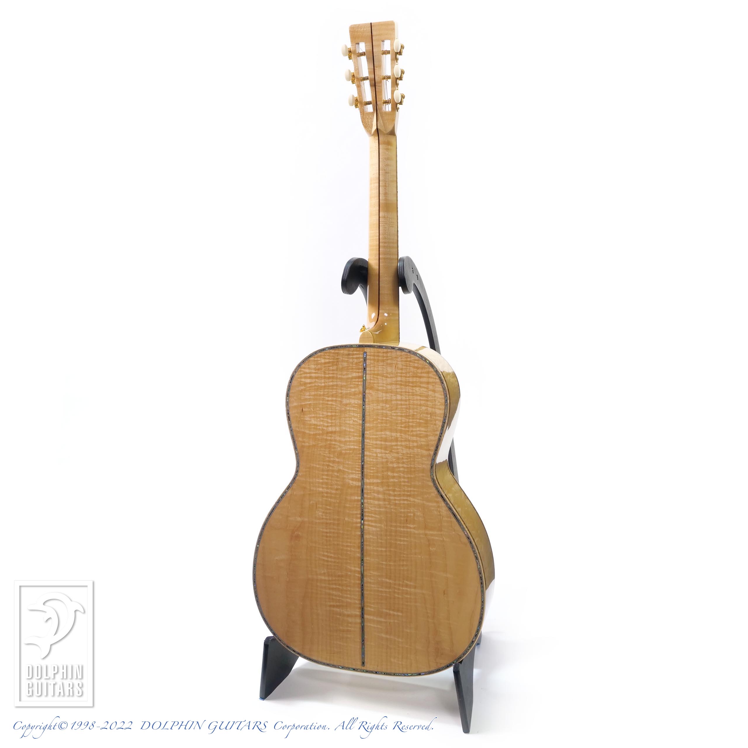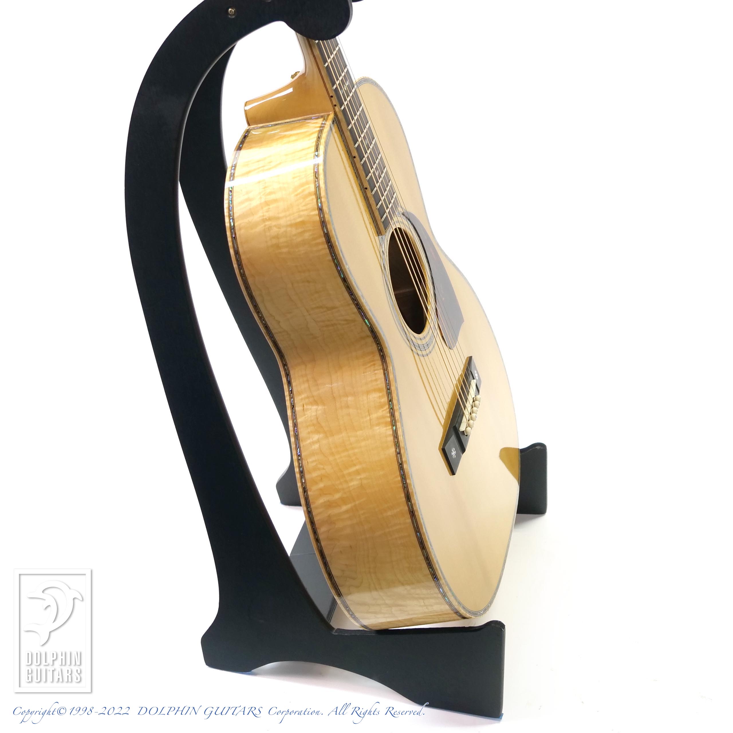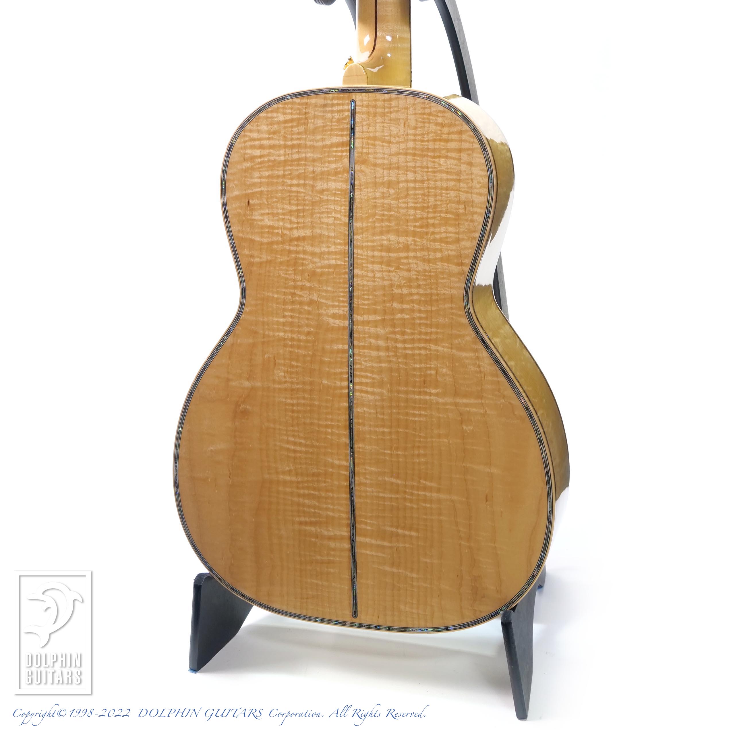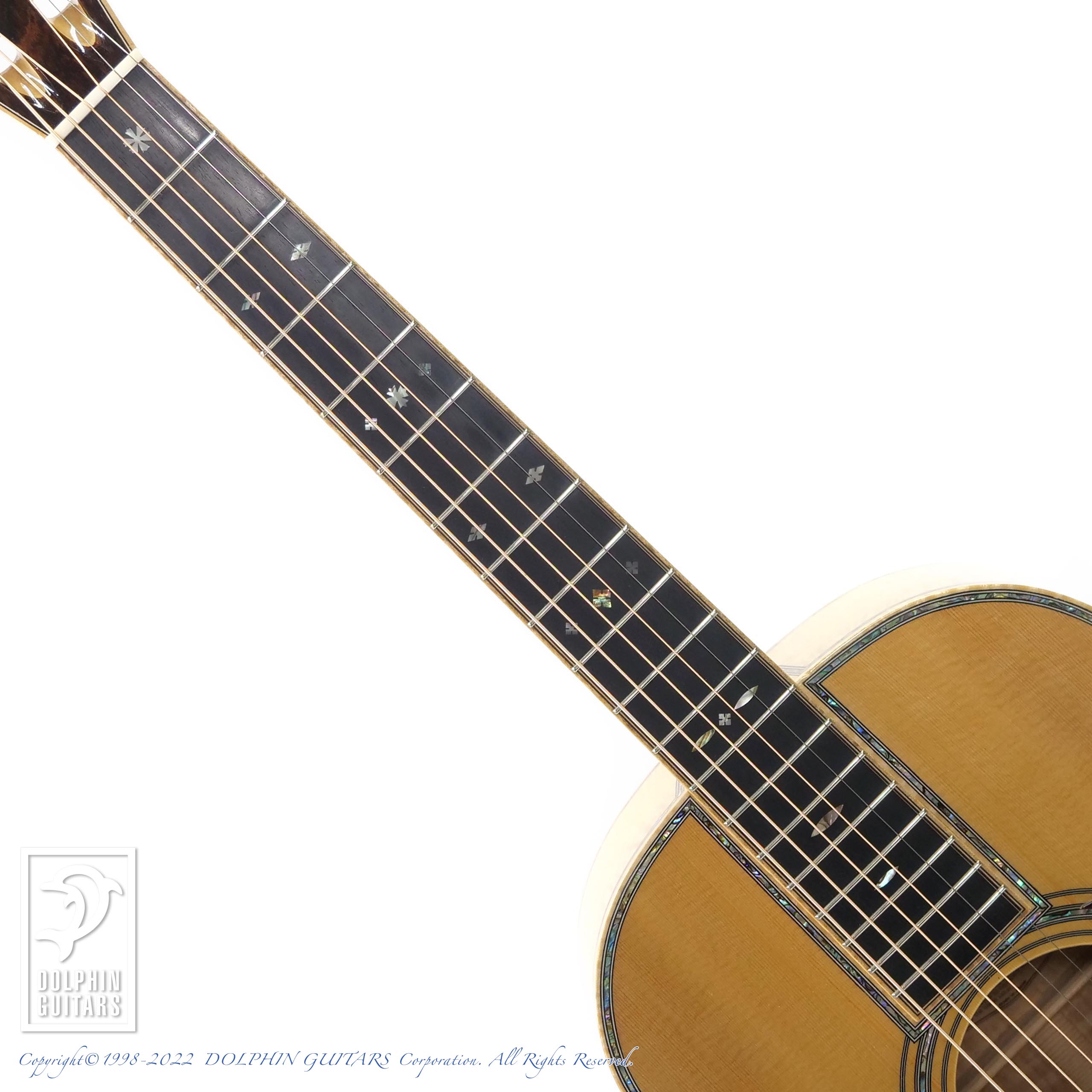 エゾマツ&メイプルの純白ボディに45スタイルのインレイが美しくマッチしており、こういった雰囲気は本家マーティンでは出すことができない部分でしょう。手工ギターの醍醐味と言えます。