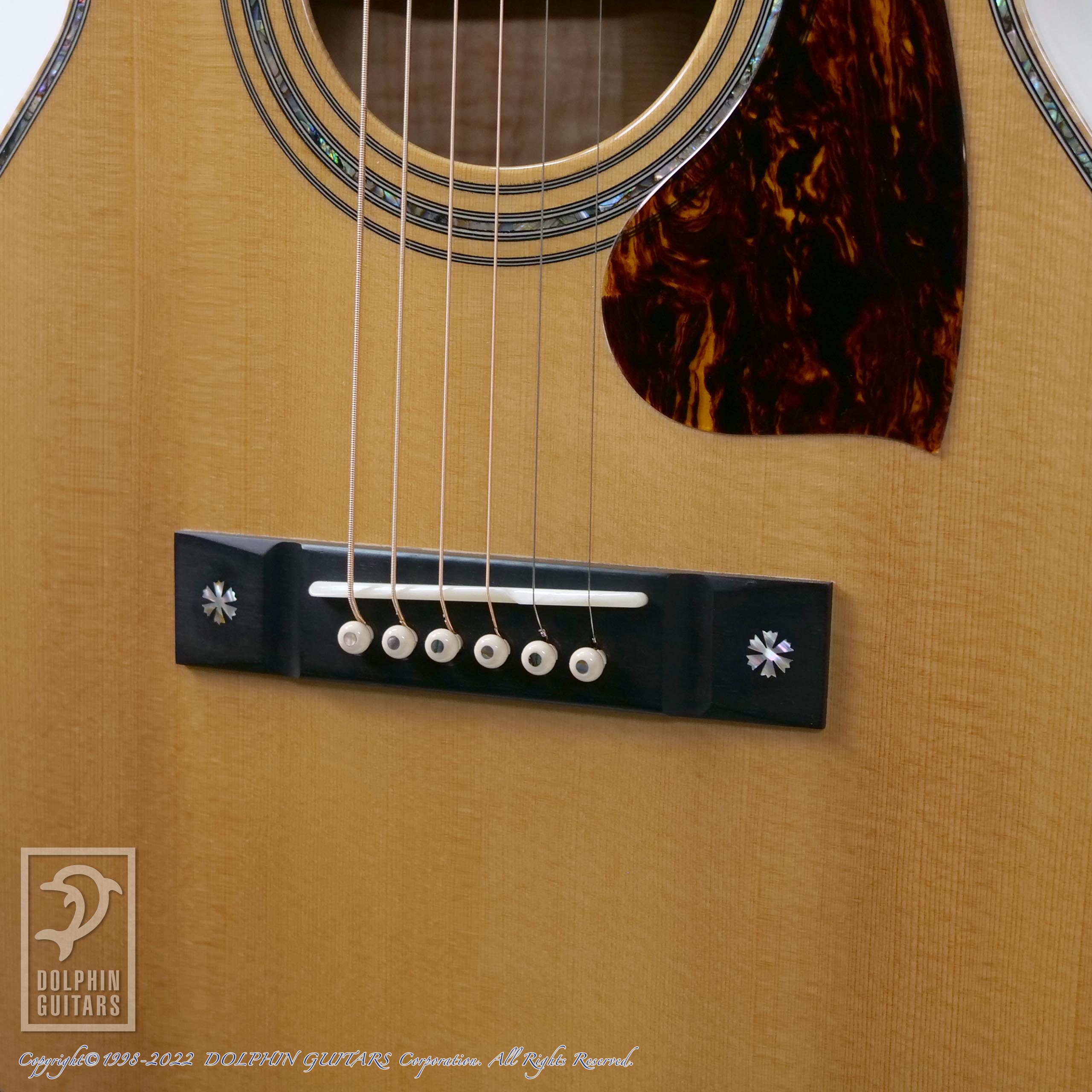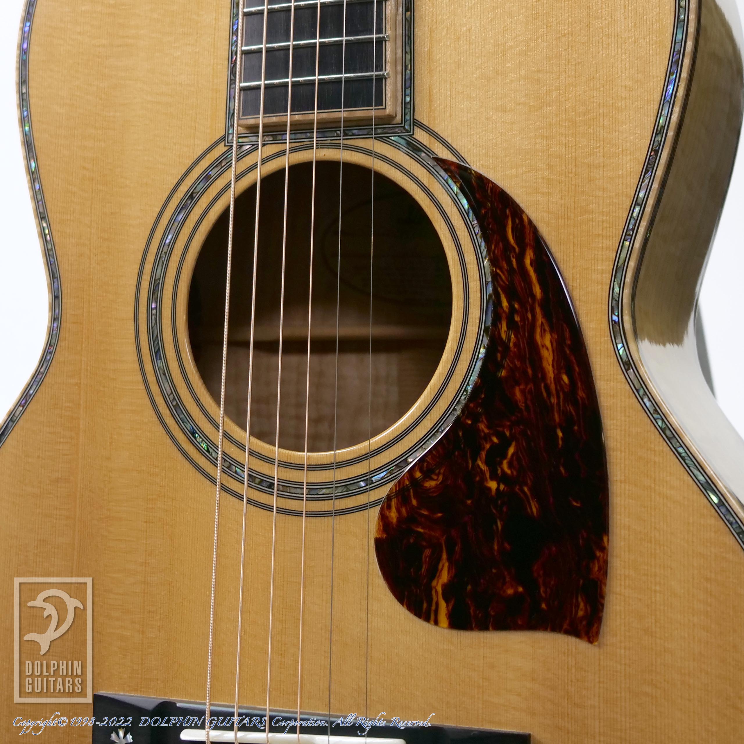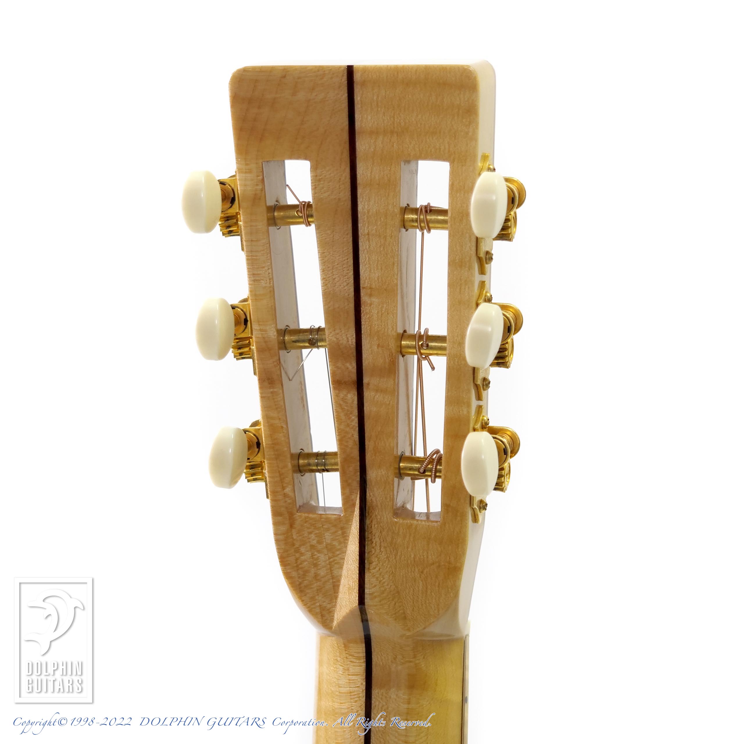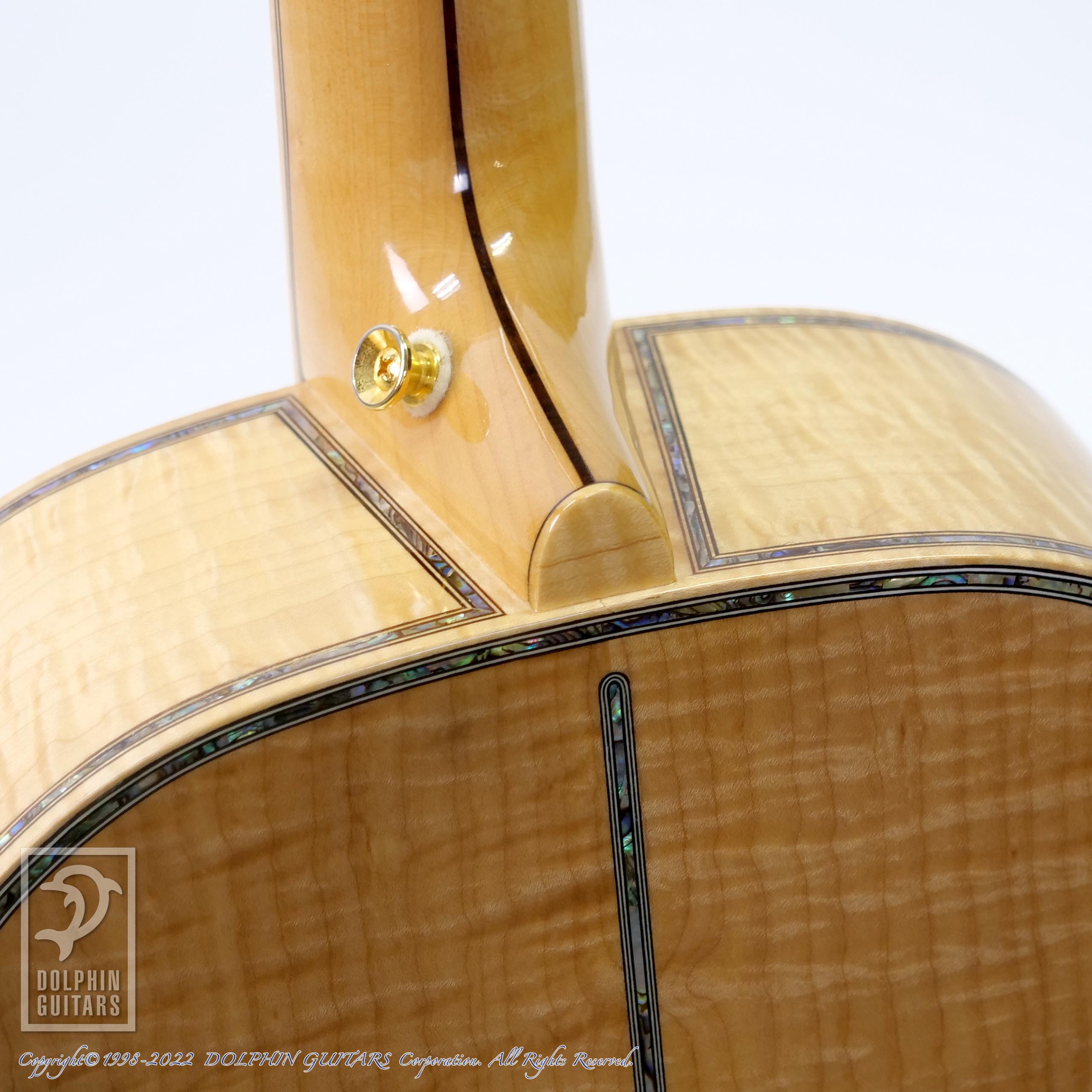 エゾマツ&メイプルの純白ボディに45スタイルのインレイが美しくマッチしており、こういった雰囲気は本家マーティンでは出すことができない部分でしょう。手工ギターの醍醐味と言えます。