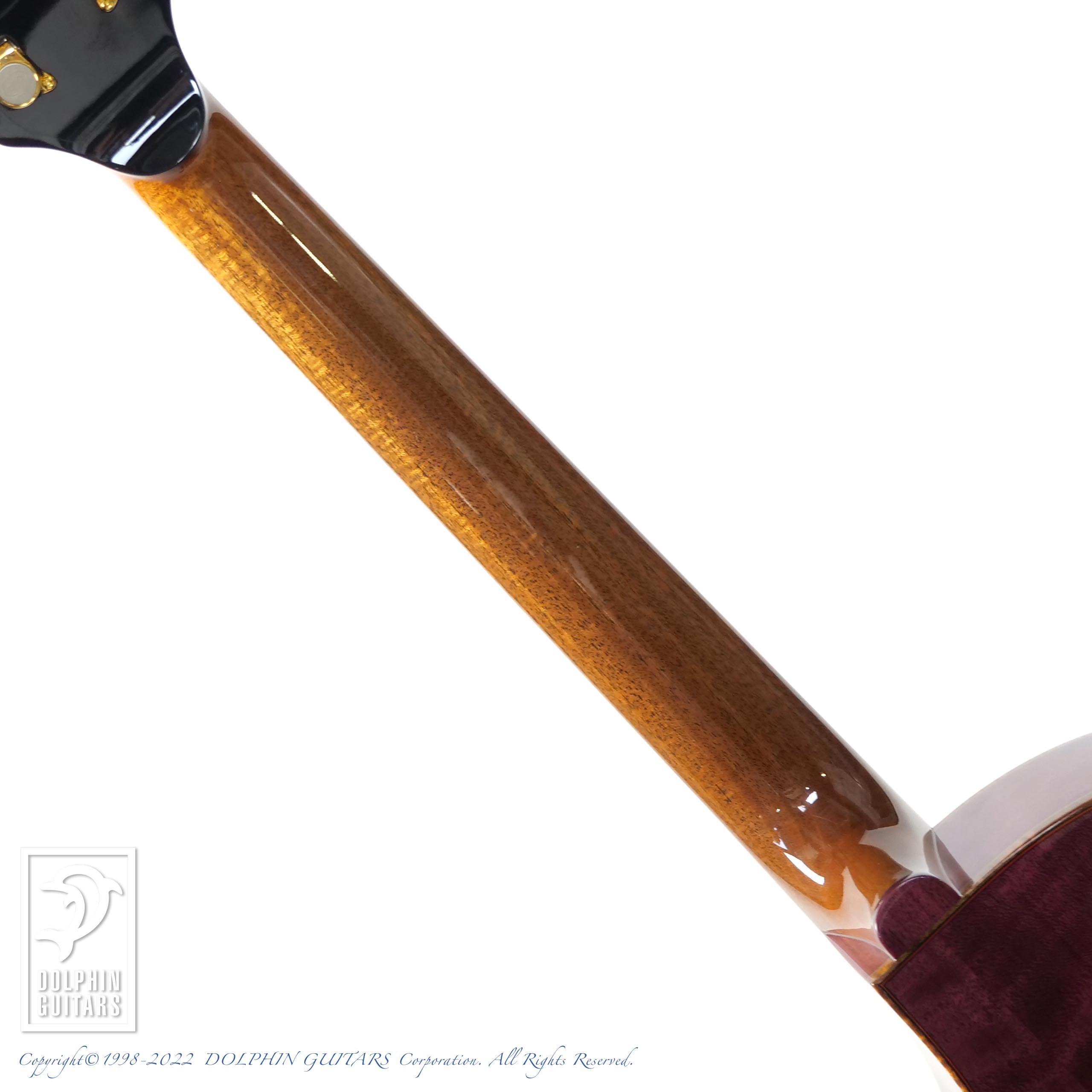 パープルハートは、硬質で加工が難しいため一般的には使用されにくい素材ですが、半世紀以上の歴史と経験があるMorrisだからこそ実現したギターです。鮮やかで美しい紫色が最大の特徴です。コアバインディングなどの色合わせはなんとも独特で、エキゾチックで存在感のあるたたずまいです。