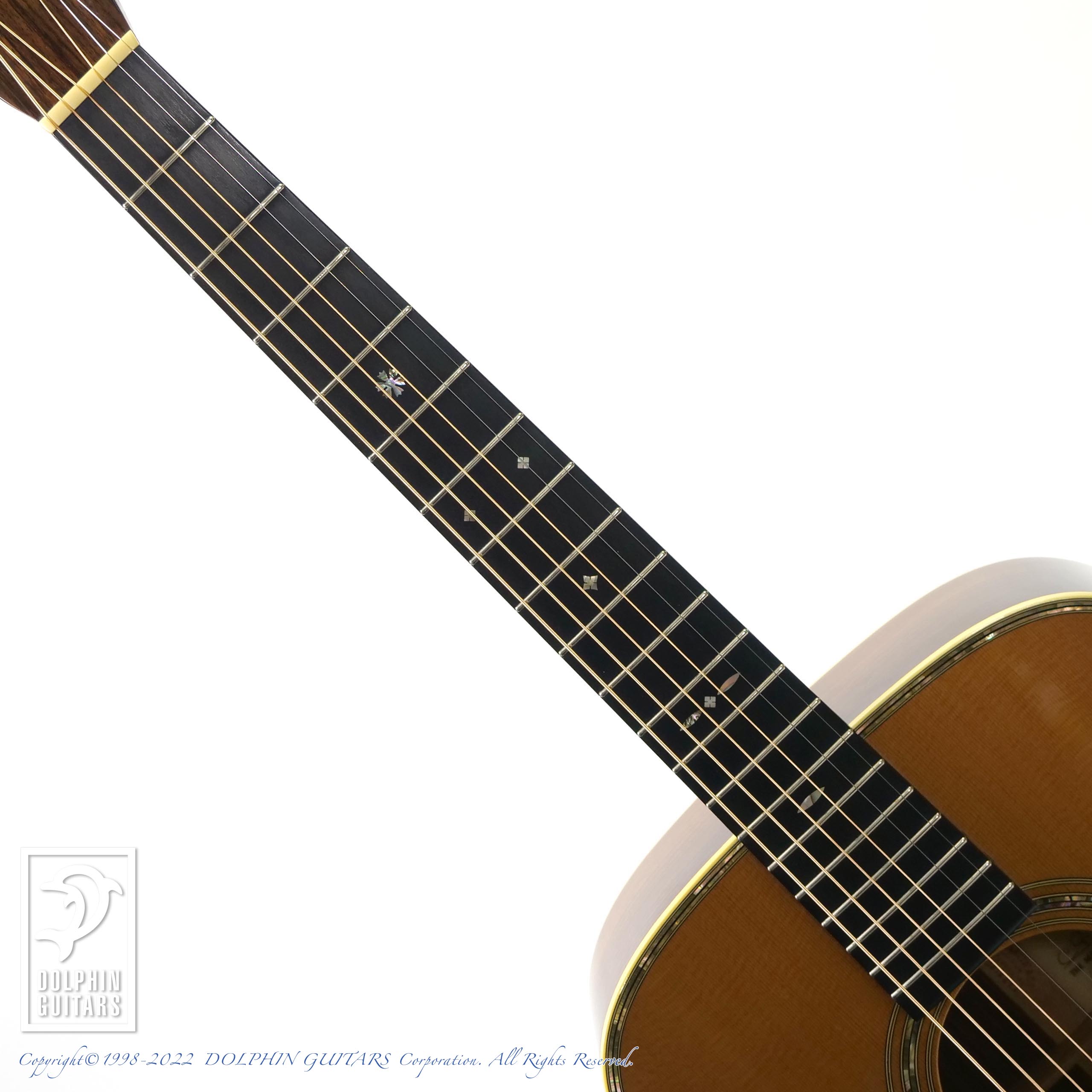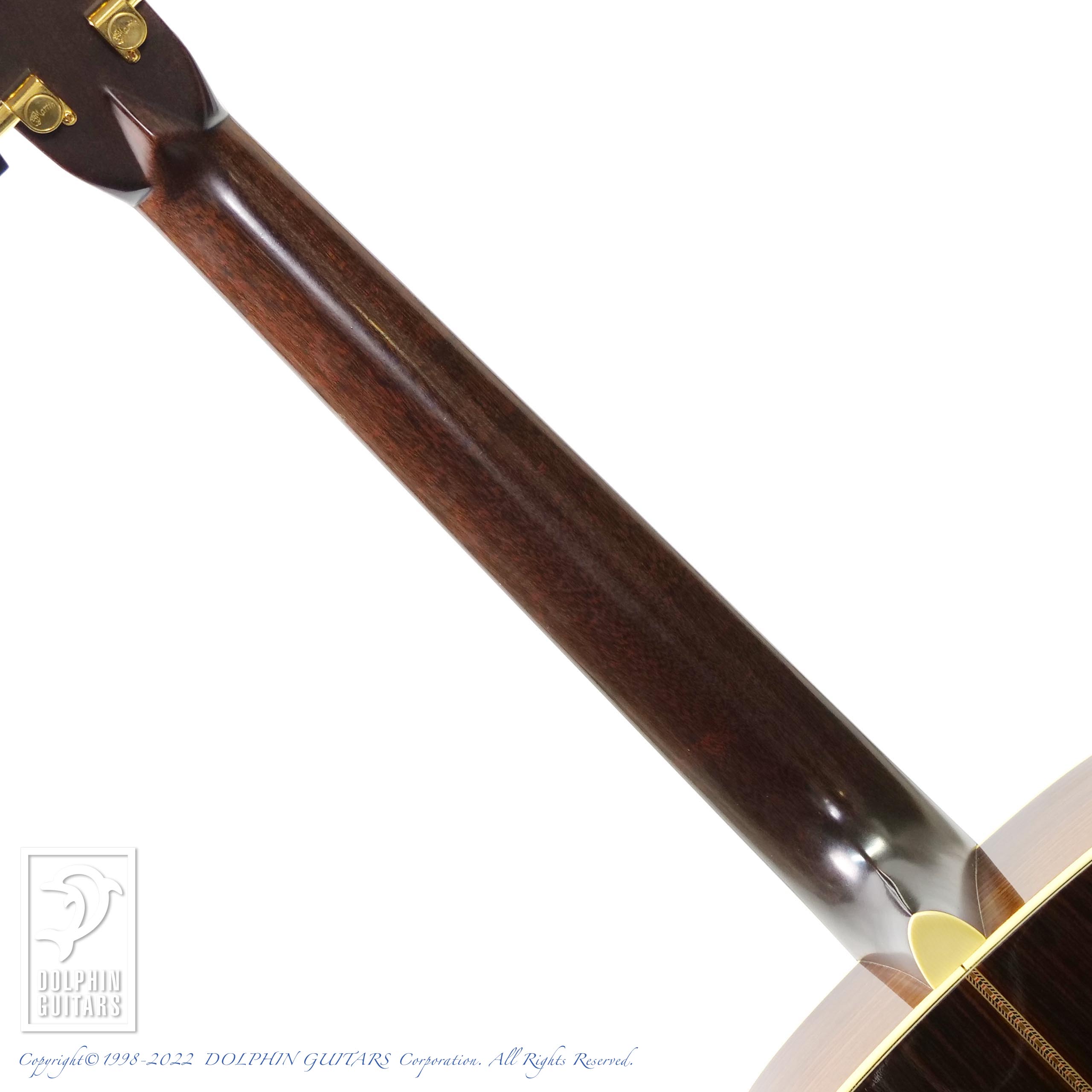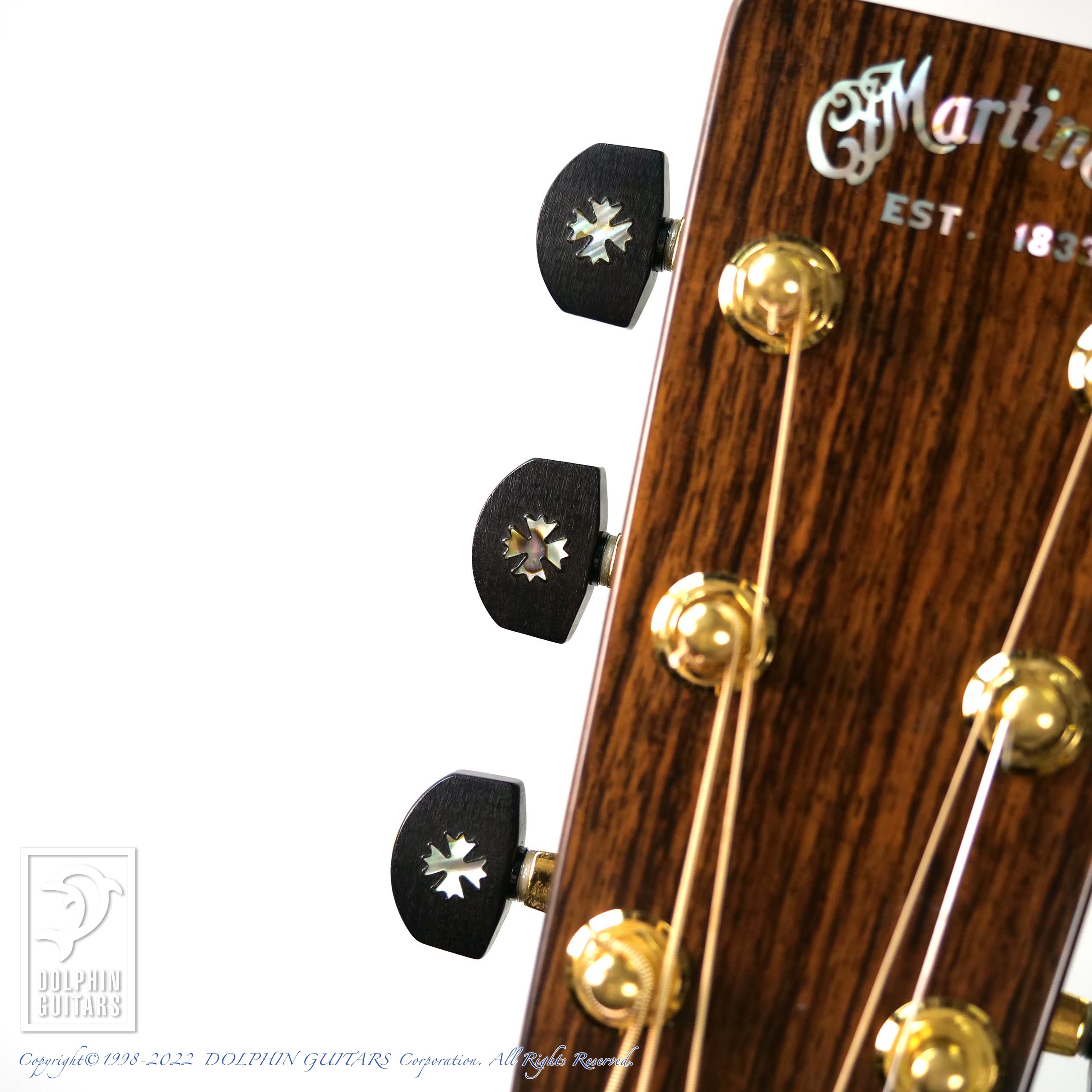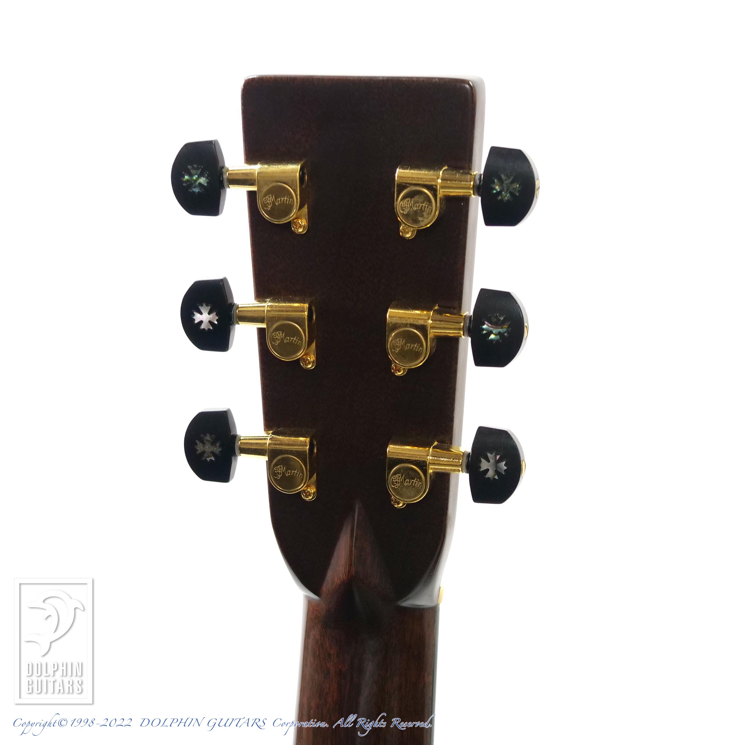 トップのアバロントリムとロゼッタはなんとソリッドアバロンの2重巻き(!)となっております。これは数あるマーチンの中でも大変珍しいディテールです。マザーオブパールのヘッドロゴも輝いており、特別な所有感を存分に楽しめる一本でしょう。