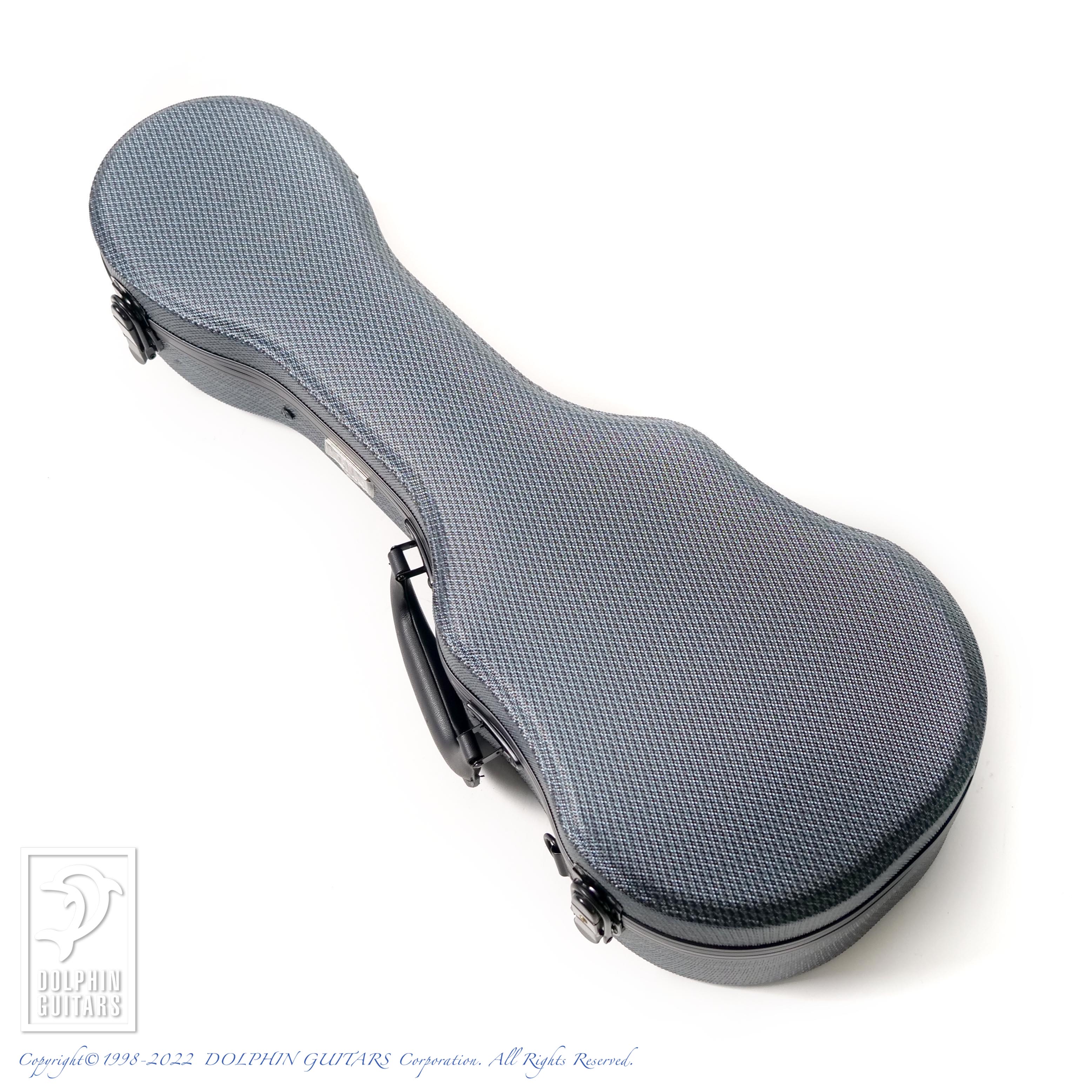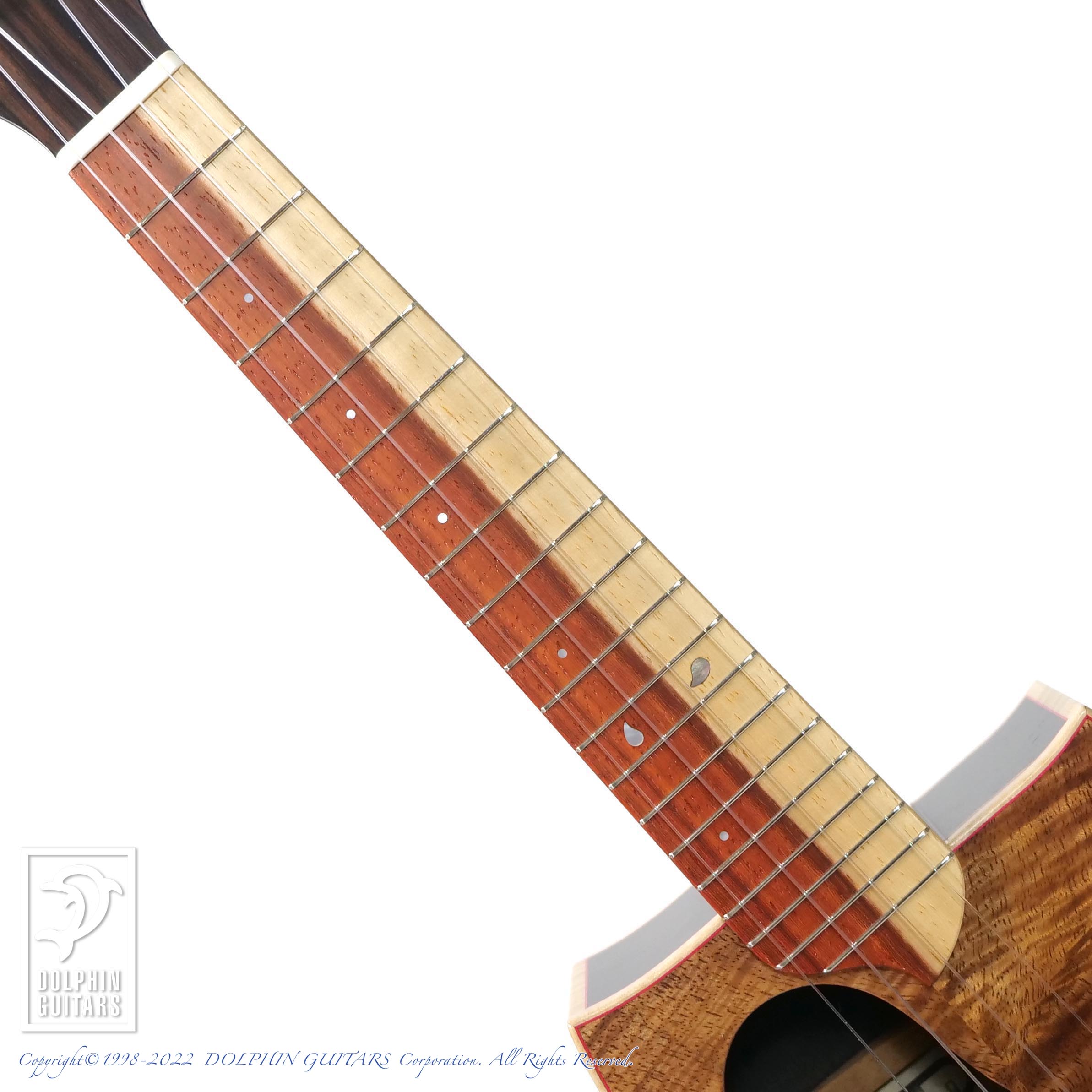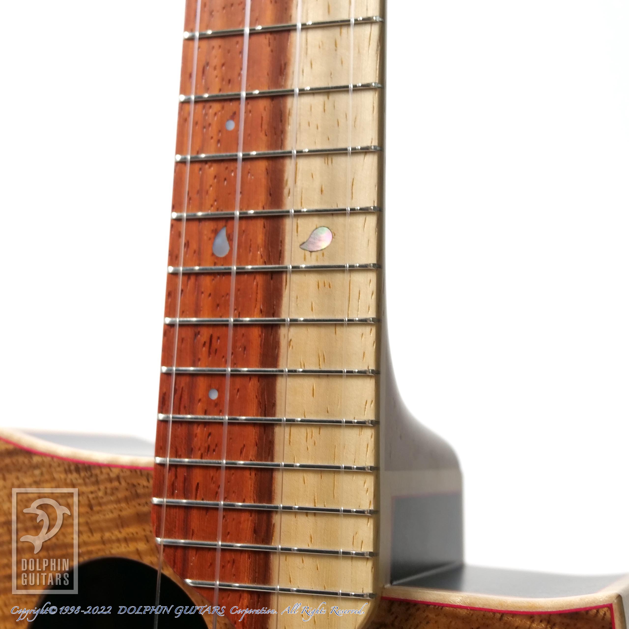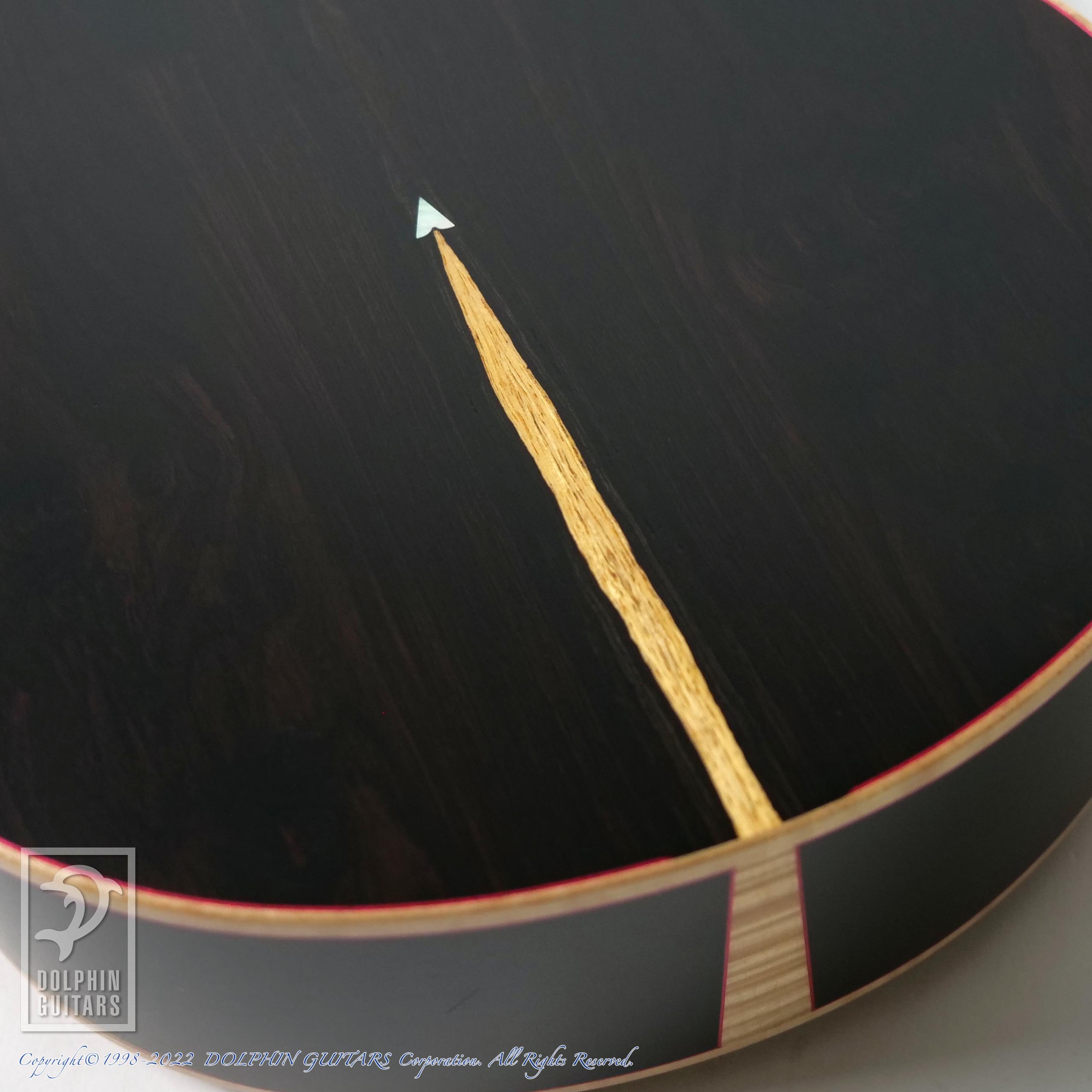 魂にも勾玉にも見えるヘッドのパールインレイと、覗くとアフリカンブラックウッドの黒が映る、悪魔の目にも見えるサウンドホールの対比、12FのMOPとブラックパールの組み合わせ、それらは太陰大極図のような対比にも見てとれ、そしてはっきりと白と黒に分かれたペグもまさに陰陽を表現しているとかいないとか...悪魔と陰陽道、西洋と東洋のコラボとも思える面白いディテールです。