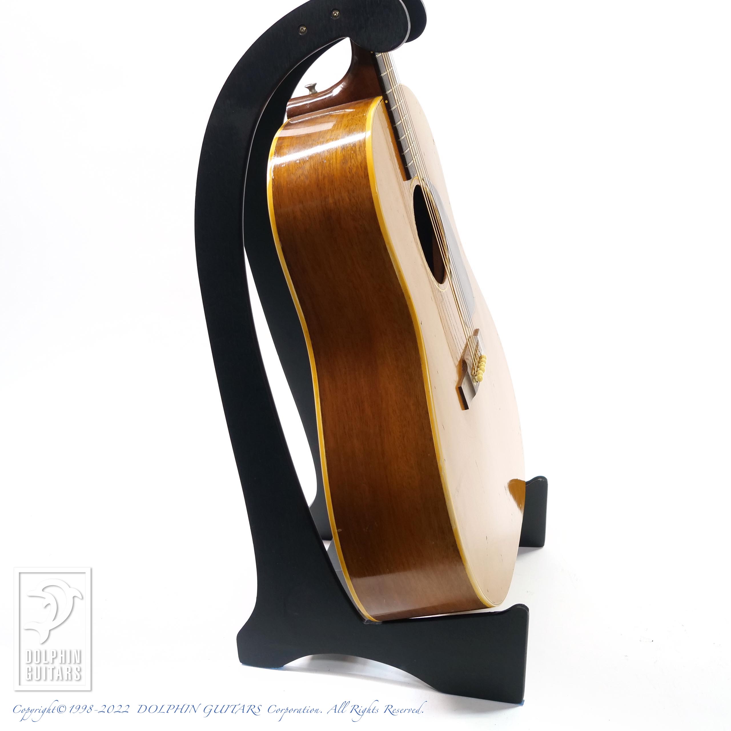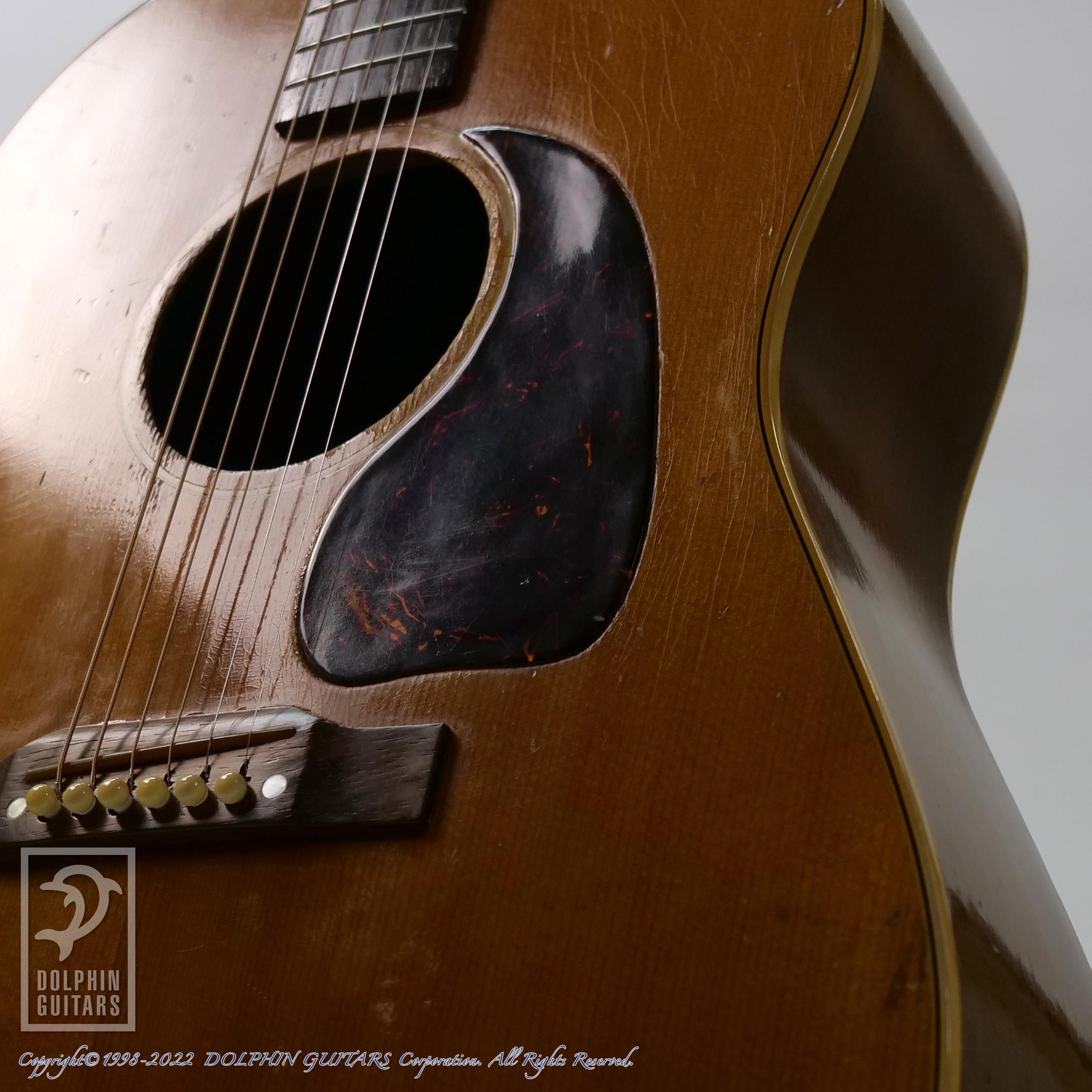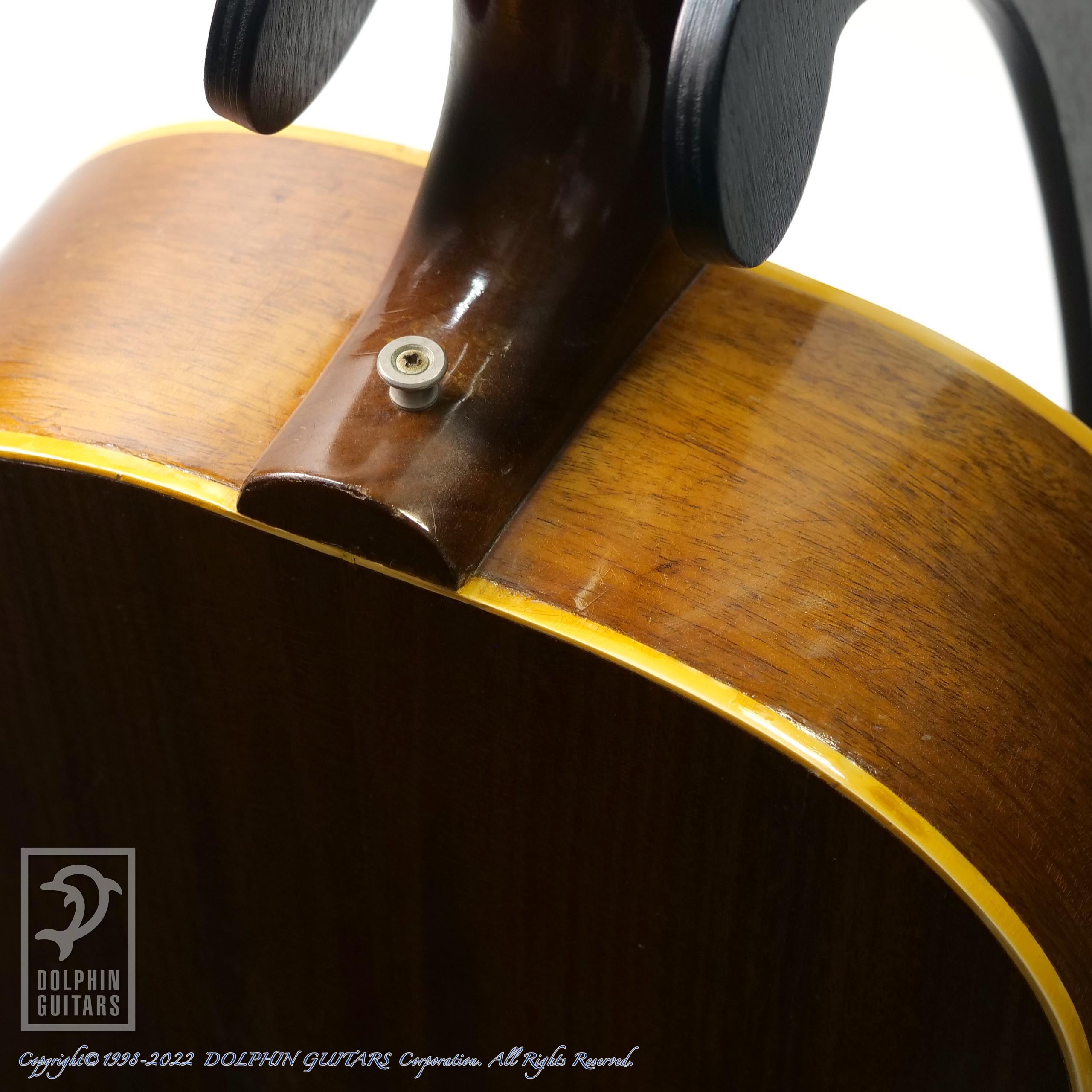 スモールガードに19F、トップベリーブリッジ、スキャロップドXブレイシング 、初期のJ-50のルックスがなんともカッコよく見えます。飴色に焼けたナチュラルフィニッシュもヴィンテージルックスに拍車をかけ、見ていてウットリしてしまいます。